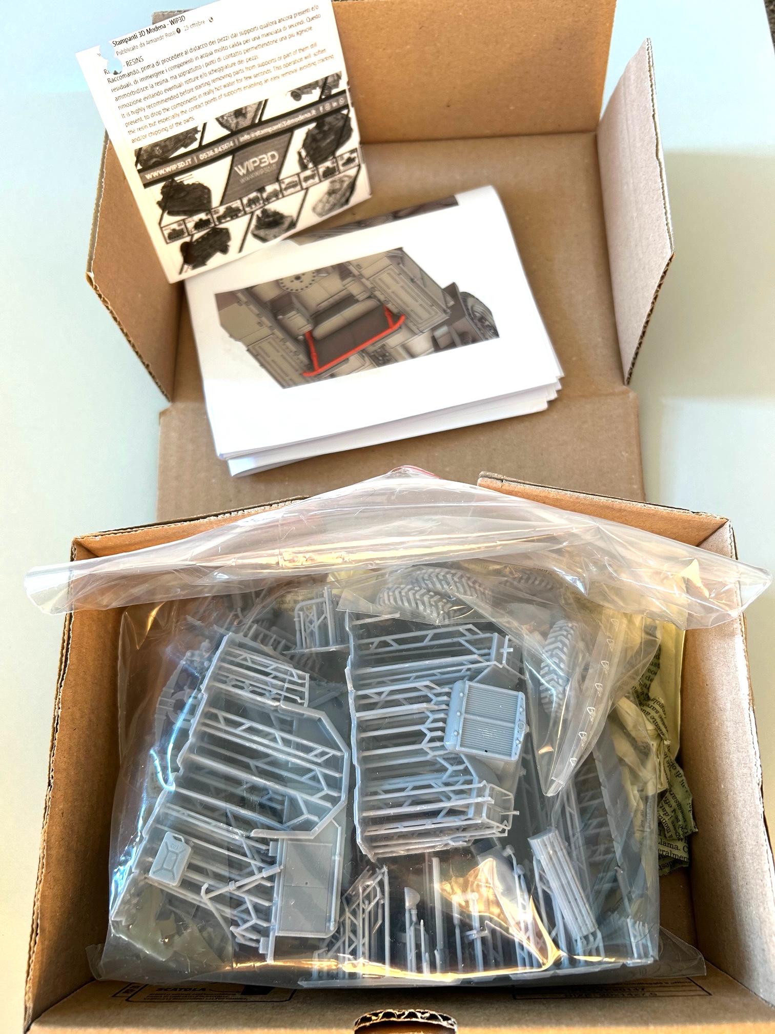 Alle Bauteile sind von WIP3D im 3D Druckverfahren hergestellt worden und sicher in einem stabilen Klappkarton verpackt, auf dessen Deckelbild eine schöne Grafik des Fahrzeuges als Seitenansicht sowie ein Foto von einem originalen Fahrzeug zu sehen sind. Man findet darin sieben Druckplatten mit allen relevanten Teilen, die sich noch auf den Druckstreben befinden und damit auch gegen Beschädigung geschützt sind. Darüber hinaus sind fünf Reifen (eines davon ist das Reserverad mit Halterung) mit den entsprechenden Felgen sowie ein Bauplan enthalten.