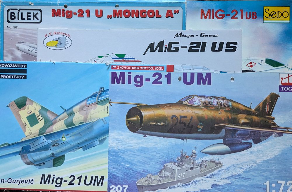 Die ersten UM Modelle basierten auf der MiG-21MF von Kovozávody Prostějov. AGA (Polen) startete damit 1996. Ein Gussast wurde direkt übernommen, der zweite überarbeitet und mit neuen Teilen für den Trainer ergänzt. Der Rumpf ist eine Eigenschöpfung. Der einfache Aufbau und die etwas groben Kleinteile blieben. Diesen Bausatz brachten Condor (im gleichen Jahr), Aeroteam (1997), Intech (1998), Seido (unter der Fantasiebezeichnung MiG-21UB), in den Handel.