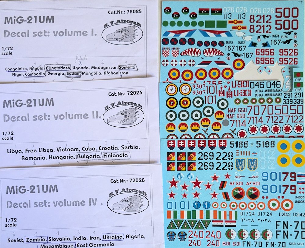 R.V.Aircraft brachte den Bausatz gleichzeitig heraus. Die bekannte Hardware wurde um eine Ätzplatine erweitert. Der umfangreiche Abziehbilderbogen mit exotischen Dekorationen hebt sich deutlich von dem eher konventionellen von KP ab. Darüber hinaus lieferte R.V.A. mehrere extra Abziehbilderbogen mit denen fast alle Einsatzländer abgedeckt werden. Allerdings nicht ganz fehlerfrei, wie z.B. bei Uganda und Sudan.
