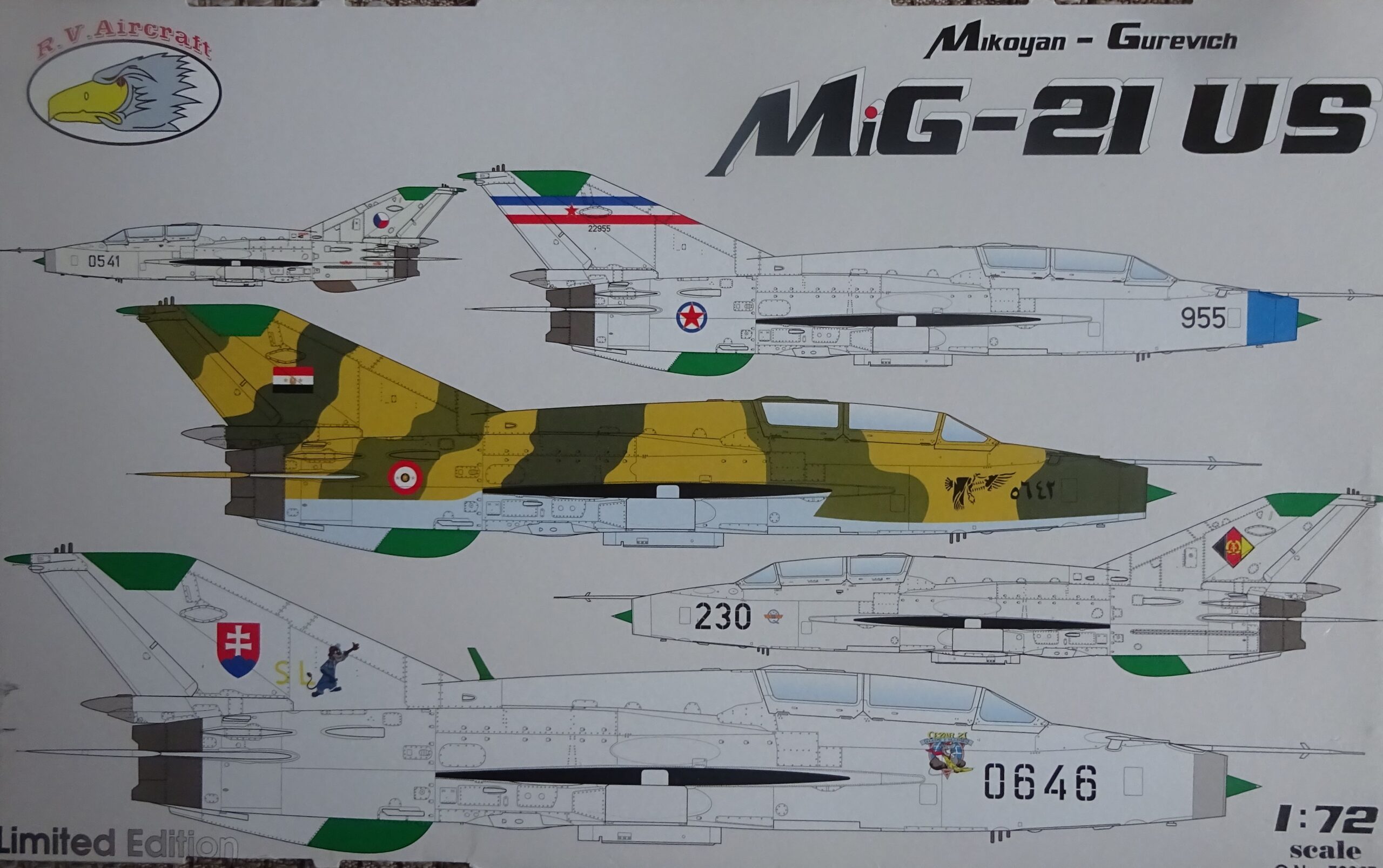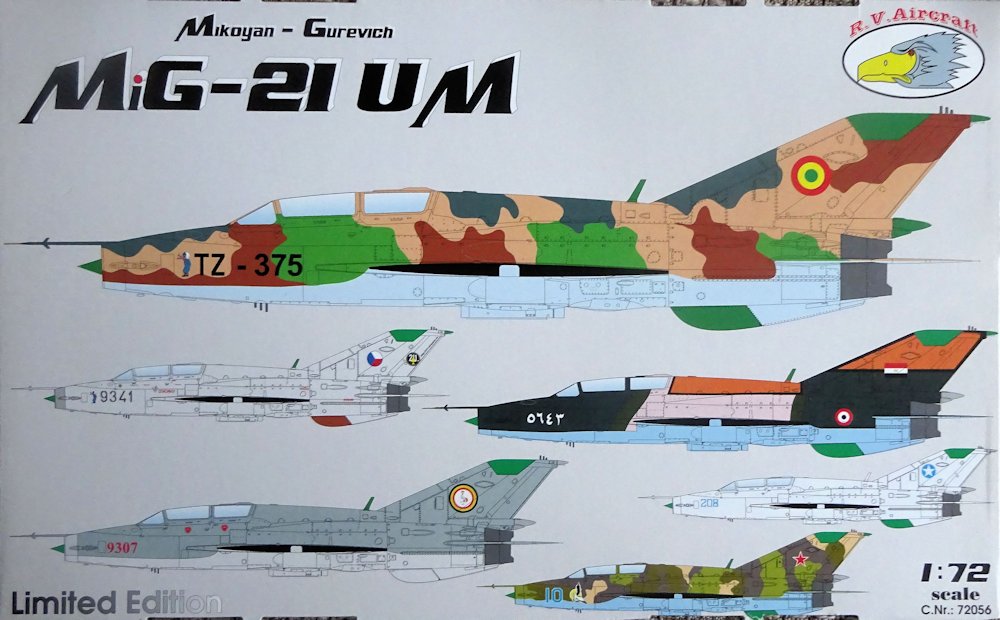 Erst 2019 folgte R.V.Aircraft nach einem ähnlichen Schema. Auf Basis der in Kooperation mit KOPRO entstandenen UM brachte man mit neuen Abziehbildern eine MiG-21US heraus. Die Oberflächendetaillierung ist typisch RVA und erscheint etwas überladen. Um eine frühe US zu erhalten, müssen der Anstellwinkelgeber entfernt und die entsprechenden Kennzeichen recherchiert werden. Dies wurde in der Bauanleitung nicht berücksichtigt, wohl aber bei den Bemalungsvorschlägen.