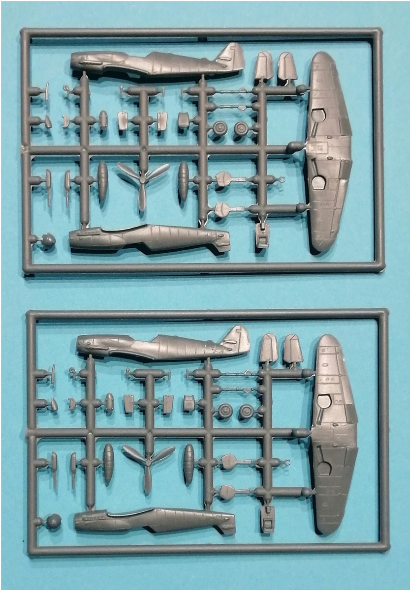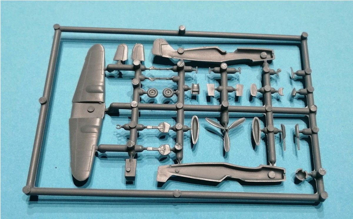 Der erste Blick auf den doppelt vorhandenen Rahmen aus grauem Plastik zeigt schon, dass es sich um einen typischen Short-Run Kit handelt. Das bedeutet, das an der einen oder anderen Stelle vielleicht etwas mehr Versäuberungsarbeit anfallen wird. Obwohl die Rahmen der verschiedenen Versionen wie G-6 oder G-10 auf den ersten Blick gleich aussehen, hat man es dennoch geschafft, die unterschiedlichen Merkmale wie die Motorabdeckungen und Beulen auf den Tragflächen umzusetzen. Die Aufteilung der Hauptbaugruppen ist dabei üblich gewählt. Vor dem Zusammenfügen der beiden Rumpfhälften ist im hinteren Bereich eine recht massive Auswerfermarke zu entfernen. Das Cockpit ist vorhanden und für den Maßstab völlig in Ordnung. Für das Instrumentenbrett gibt es ein Abziehbild, welches leider zur Darstellung der Sitzgurte fehlt. Die einteilige Tragfläche wird dann von unten her an den zusammengesetzten Rumpf montiert. Hier sollte sich dann gleich die richtige V-Stellung dieser im Verhältnis zum Rumpf ergeben.
