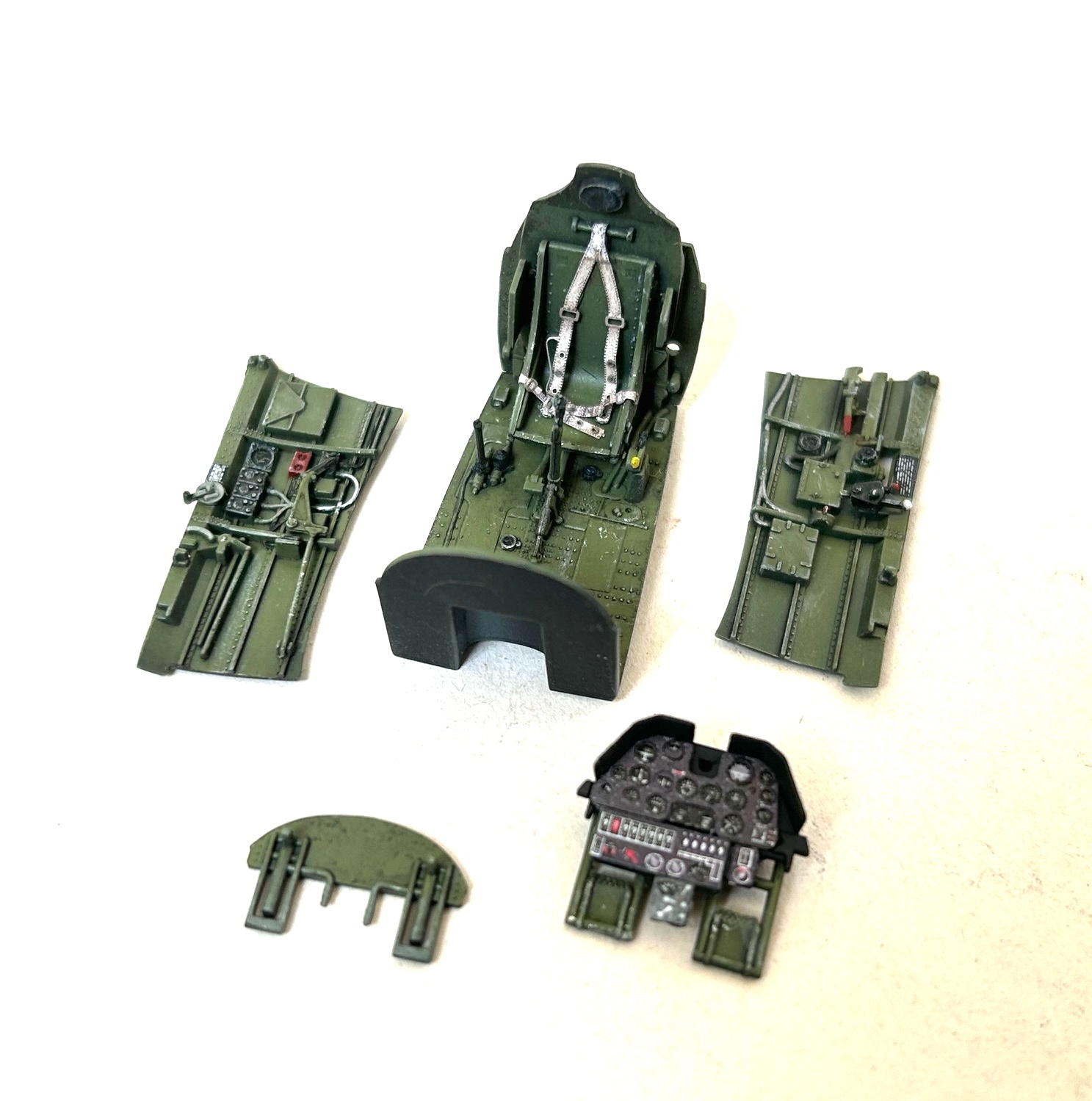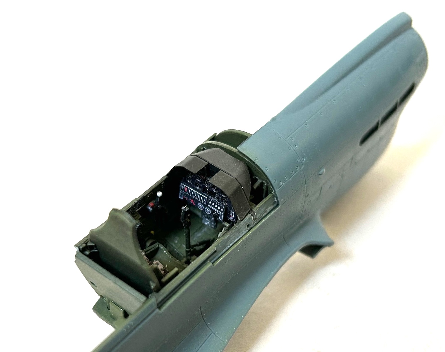 Es ist sicherlich keine Überraschung, dass das Bauprojekt mit dem Cockpit gestartet wurde. Diverse und feinste Teile fanden hier ihren Platz und das Ergebnis nach nur wenigen Bauabschnitten entsprechend dem Bauplan kann sich wirklich sehen lassen. Der Vergleich mit originalen Fotos des Arbeitsbereiches vom Piloten zeigt deutlich, dass Eduard extrem gut recherchiert und die entsprechenden Informationen im Design des Bausatzes berücksichtigt hat. Nach dem Zusammenbau der Teile wurden diese mit verdünntem Mr. Surfacer 1500 Black mit einer einheitliche Grundierung versehen und dann folgte der Farbauftrag mit Interior Green. Im nächsten Schritt wurden diverse kleine Ätzteile sowie Abziehbilder von Placards angebracht. Nach einer Versiegelung mit Future folgten Washes, Pin-Washes und das Betonen von Highlights, was auch in gleicher Weise für die Innenseiten der Rumpfteile zutraf.