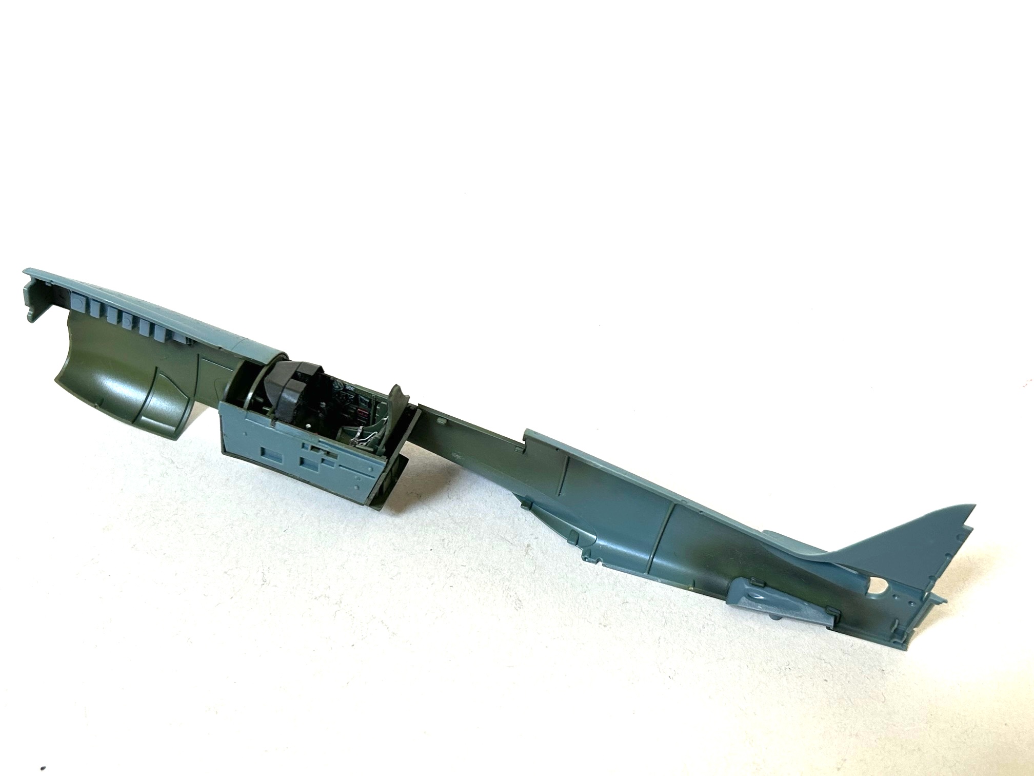 Im Anschluss daran konnten die Cockpitteile in den Rumpf eingesetzt und die beiden Rumpfteile problemlos miteinander verklebt werden.