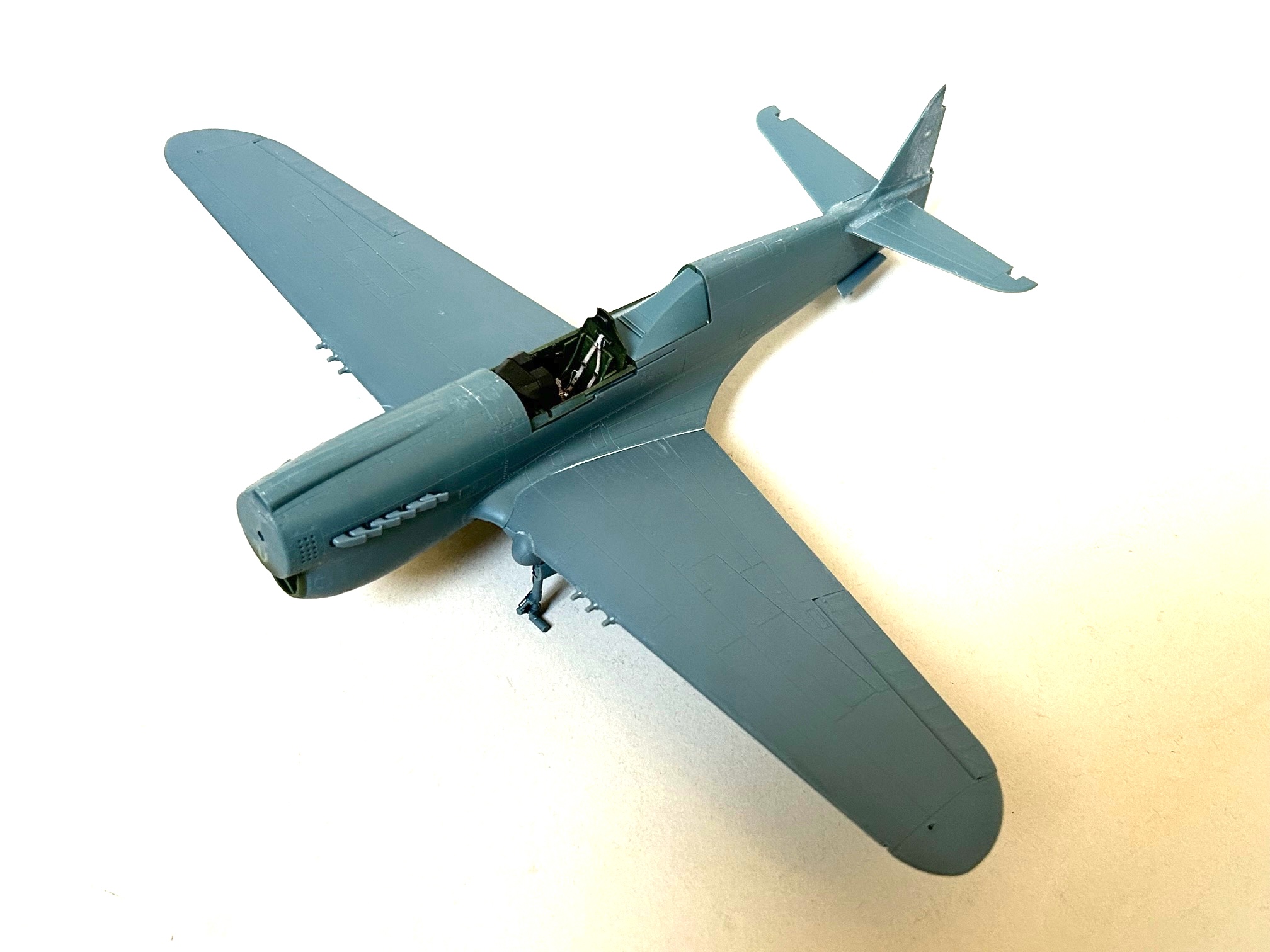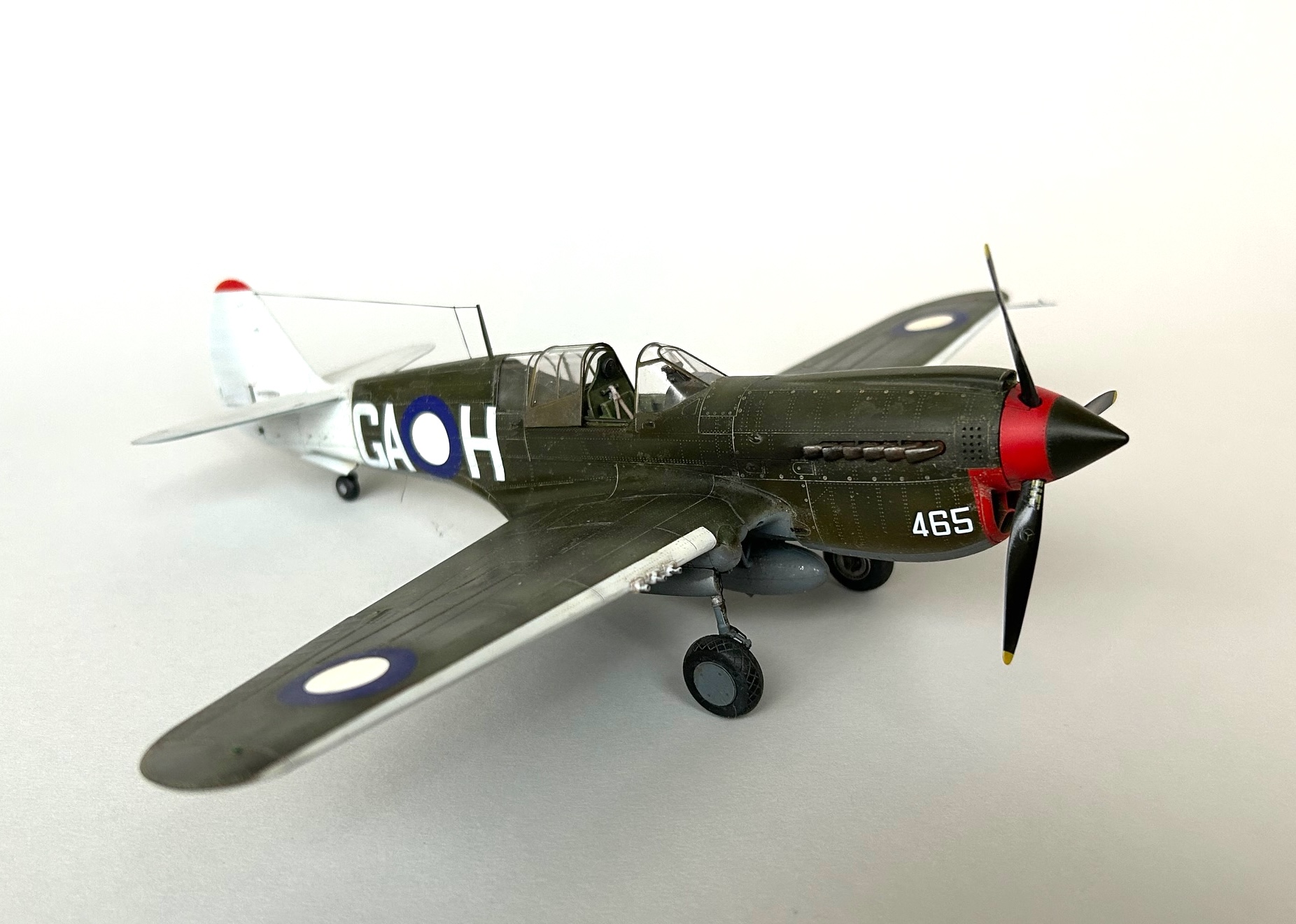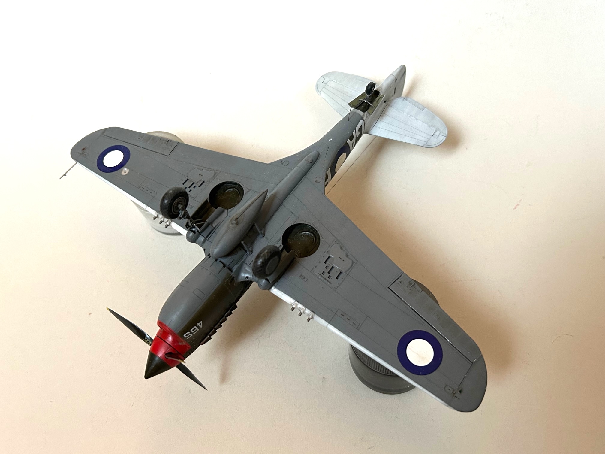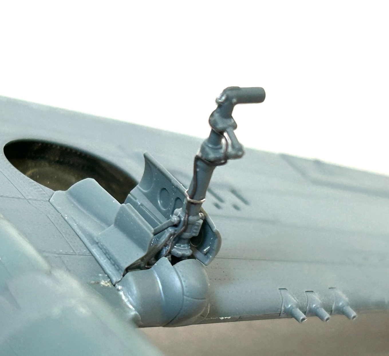 Wegen der gewählten RAAF Markierungen habe ich bei den Radschächten die Bauteile mit der Stoffbespannung genutzt und bereits zu diesem Zeitpunkt das Hauptfahrwerk angebracht, da dieses auf beiden Seiten noch mit dünnen Streben versehen war. An Stelle der Ätzteile wurde dünner Bleidraht mit entsprechender Dicke für die Ölleitungen verwendet.