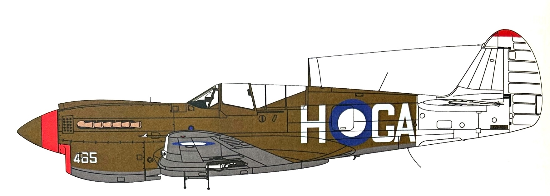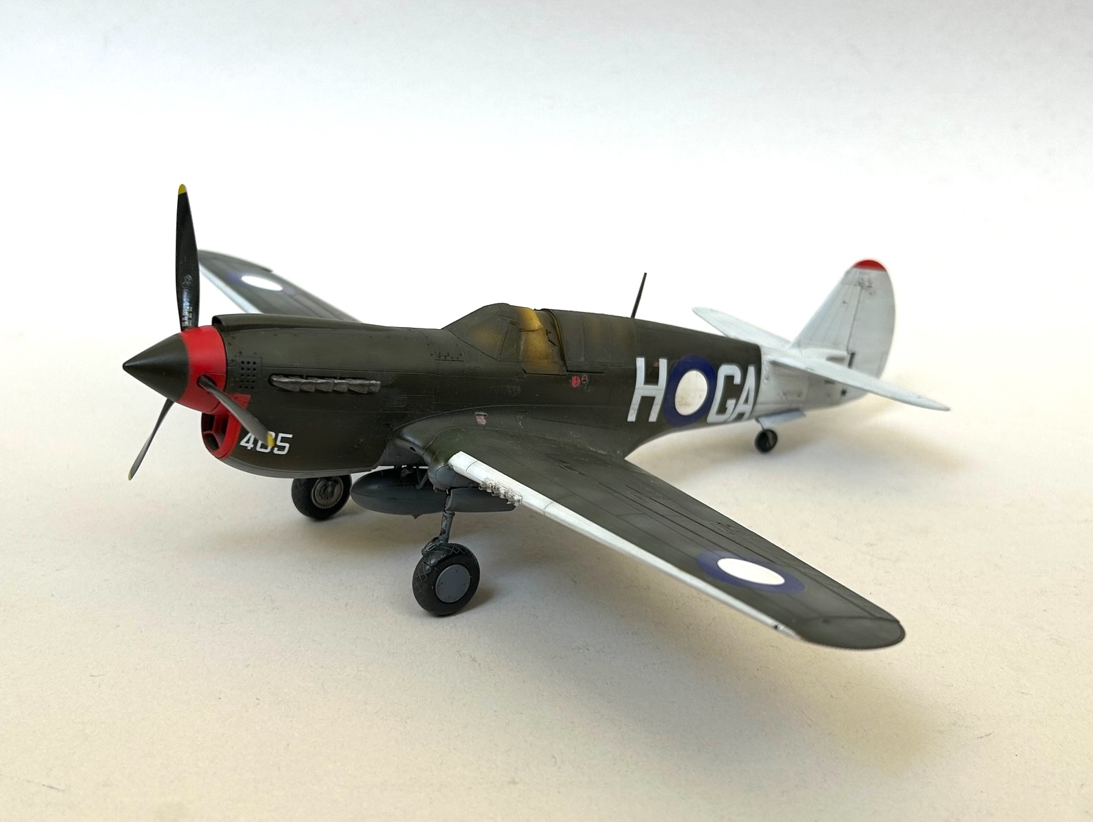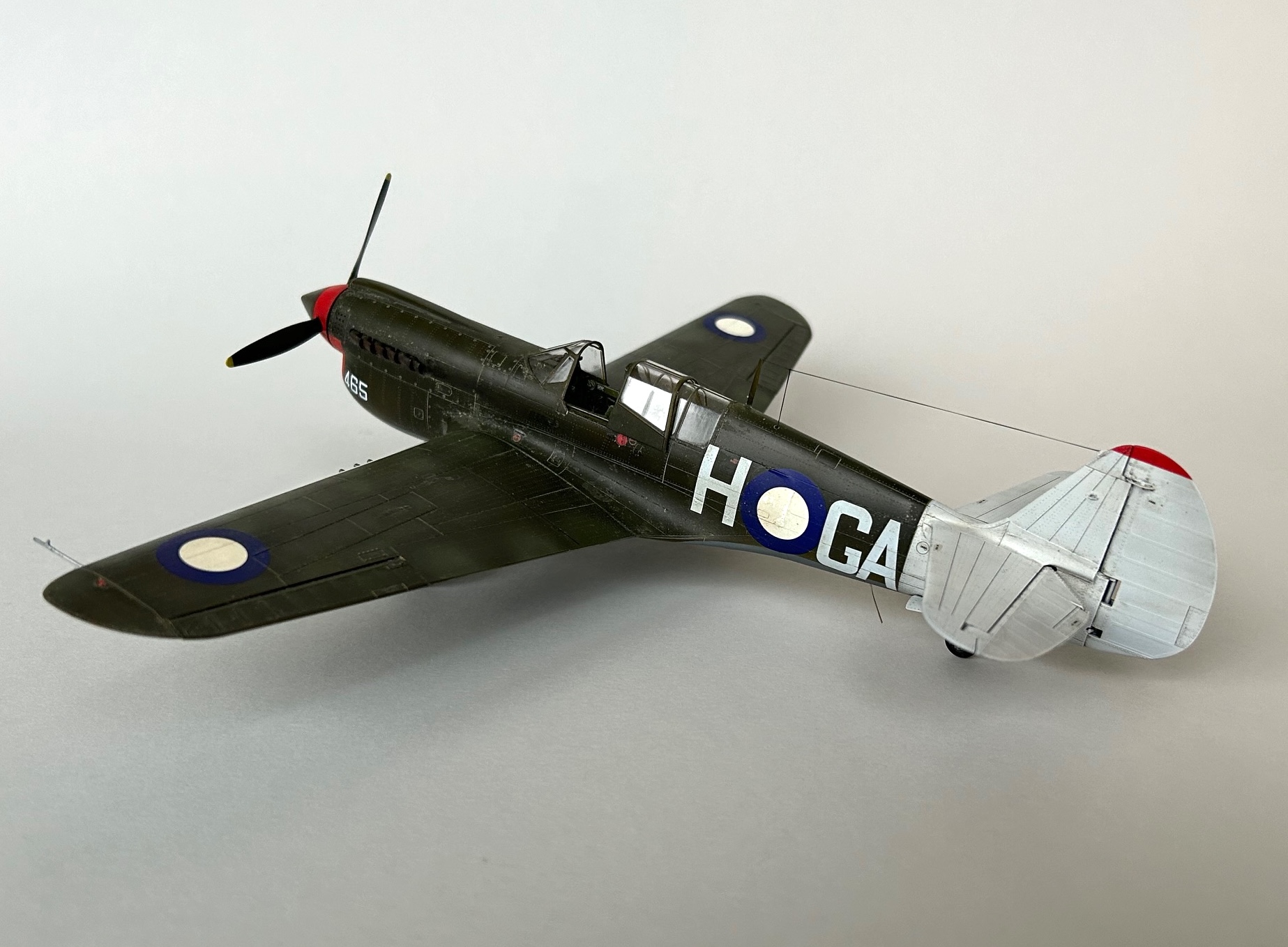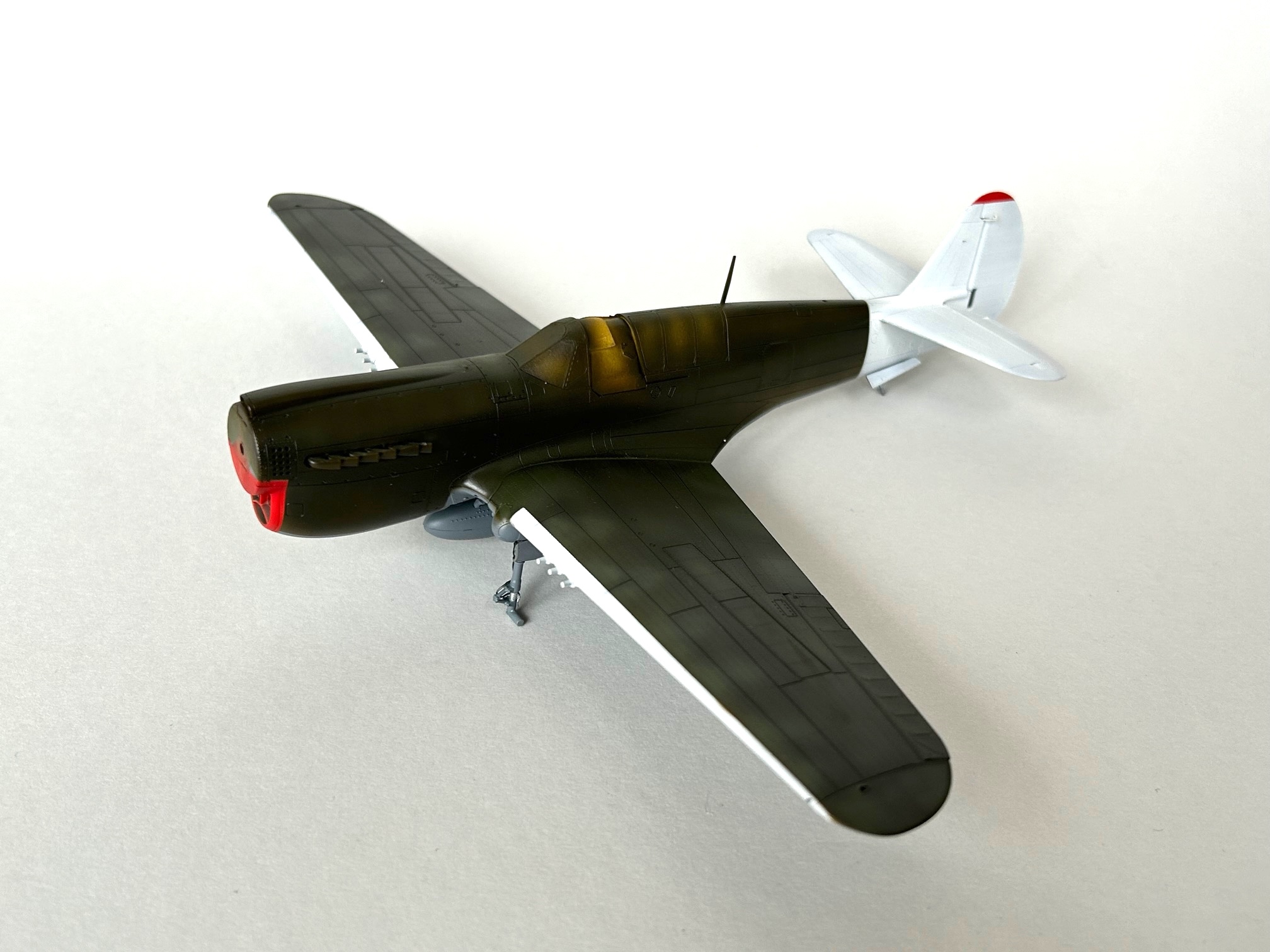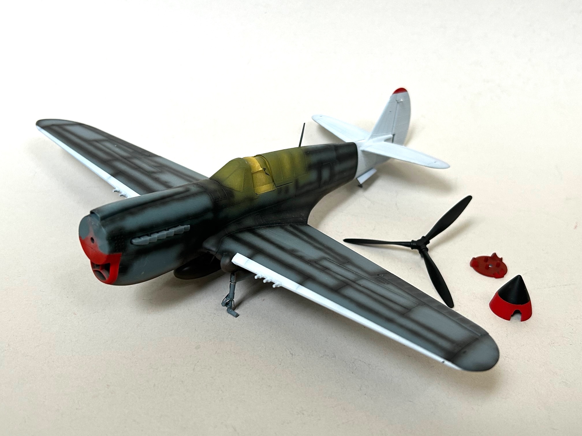 Der Verbau der restlichen Teile verlief ohne Probleme und das Modell war nach dem Abkleben des Cockpiuts bereit für die ersten Lackierungsaktivitäten. Im ersten Schritt habe ich alle Fugen auf der Unterseite mit verdünntem Mr. Surfacer Mahagonibraun und die auf der Oberseite mit Mr. Surfacer Schwarz betont. Im Anschluss daran wurden die Vorderkanten, die Flugzeugfront und das Leitwerk so abgeklebt, dass eine Lackierung mit verdünnter weisser Farbe erfolgen konnte. Nach entsprechender Trockenzeit und dem Abkleben mit Tamiya Masking Tape war es dann möglich, die roten Bereiche der Propellernabe, der Motorabdeckung und des Leitwerks zu bemalen.