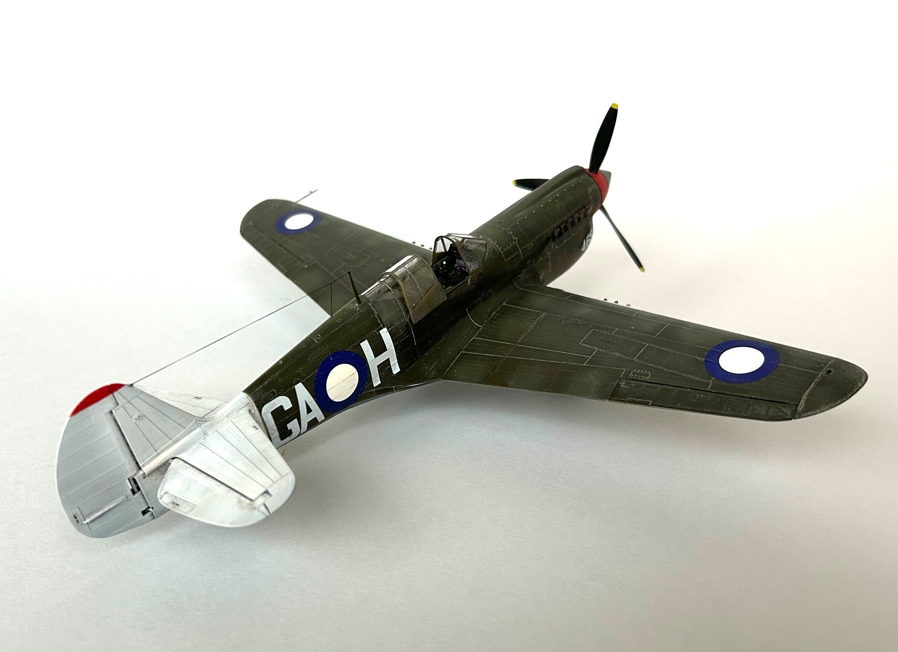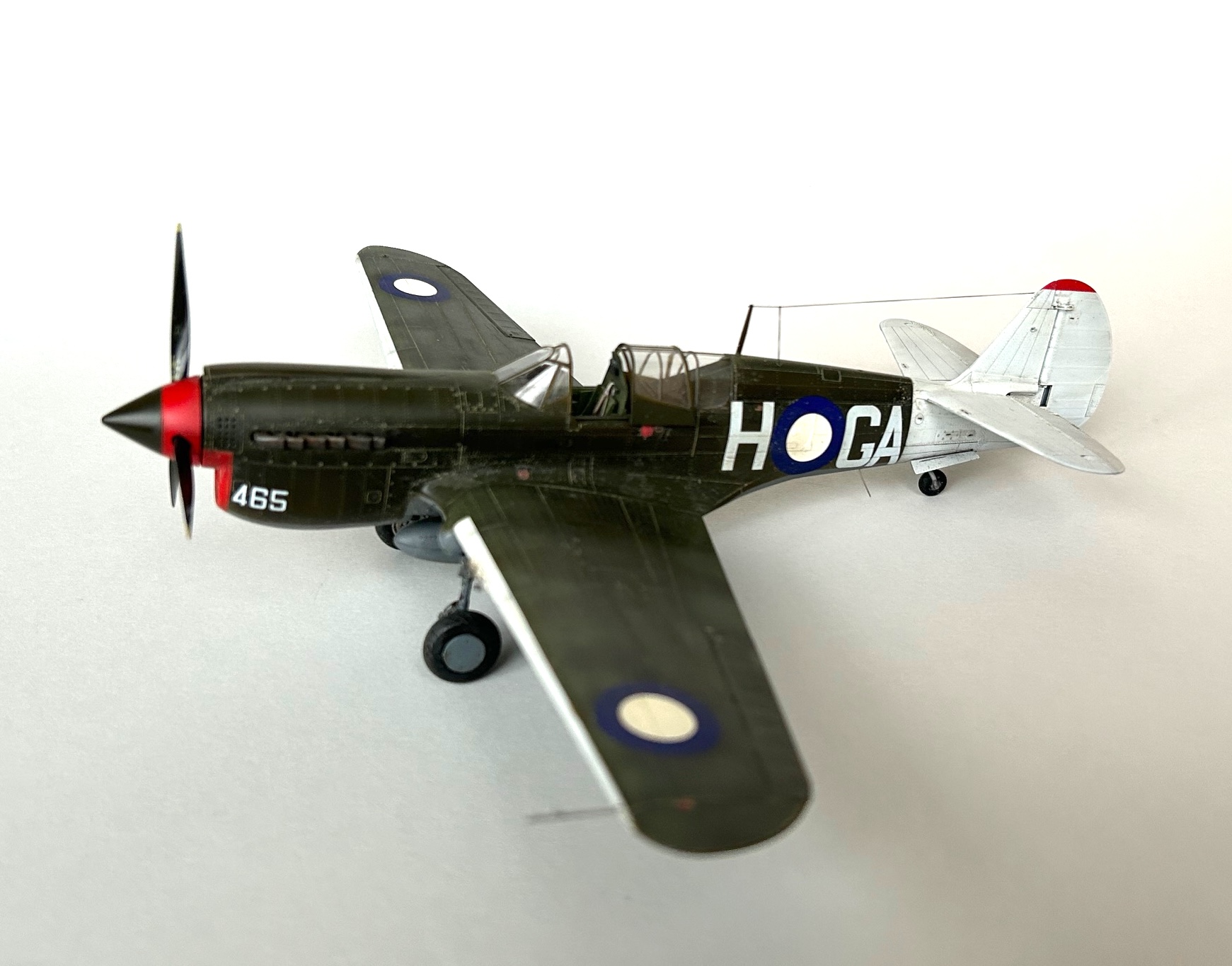 Die Lackierung wurde dann mit mehreren dünnen Future-Schichten konserviert und es folgte die Anbringung der Decals von Abzeichen einer australischen Maschine der 27ten Squadron. Dabei habe ich diese bei den Roundels und den Kennungen mit einer Schere so ausgeschnitten, dass nahezu kein Trägerfilm mehr überstand, was einen positiven Effekt nach Anbringen der Abzeichen zur Folge hatte. Es waren keinerlei Ränder oder Silvering erkennbar. Für die unzähligen und zum Teil winzigen Wartungshinweise, die vom Eduard Decal-Bogen stammen waren starke Zeit, Geduld und eine sehr gute Pinzette erforderlich. Aber auch diese Herausforderung wurde erfolgreich gemeistert. Einziger Wermutstropfen dabei waren die beiden dünnen Streifen, die auf den Flügeln anzubringen waren. Bei beiden Decals trat ein leichtes Silvering auch nach mehrfacher Behandlung mit Mr. Setter auf. In den Berichten aktueller Bausätze ist oft zu lesen, dass man die Trägerfilme bei den neuen Abziehbildern nach 24 Stunden Trockenzeit problemlos entfernen kann und damit perfekte Ergebnisse erzielt. Dies scheint allerdings nicht auf die Wartungshinweise zuzutreffen. Ich habe an mehreren Stellen leider erfolglos versucht, die Trägerfilme zu entfernen.
