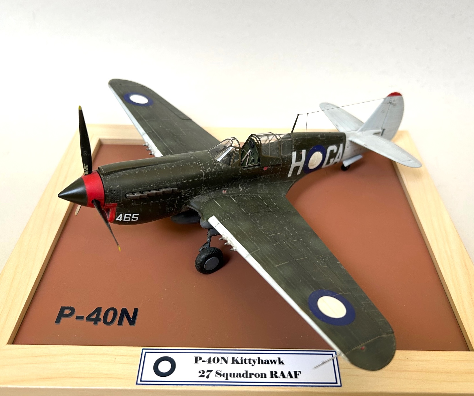 Für eine angemessene Präsentation habe ich noch eine Platte aus 0.75 mm Plastik Sheet so zugeschnitten und unten aufgefüttert, dass diese optimal in einen Holz-Bilderahmen passt und die Platte dann mit einem für Australien typischen rötlichen Farbton lackiert. Damit das Ganze einen noch etwas individuellern Charakter erhält, wurde der Schriftzug „P-40N“ mit Hilfe von Tamiya Masking Tape auf der Platte aufgebracht.