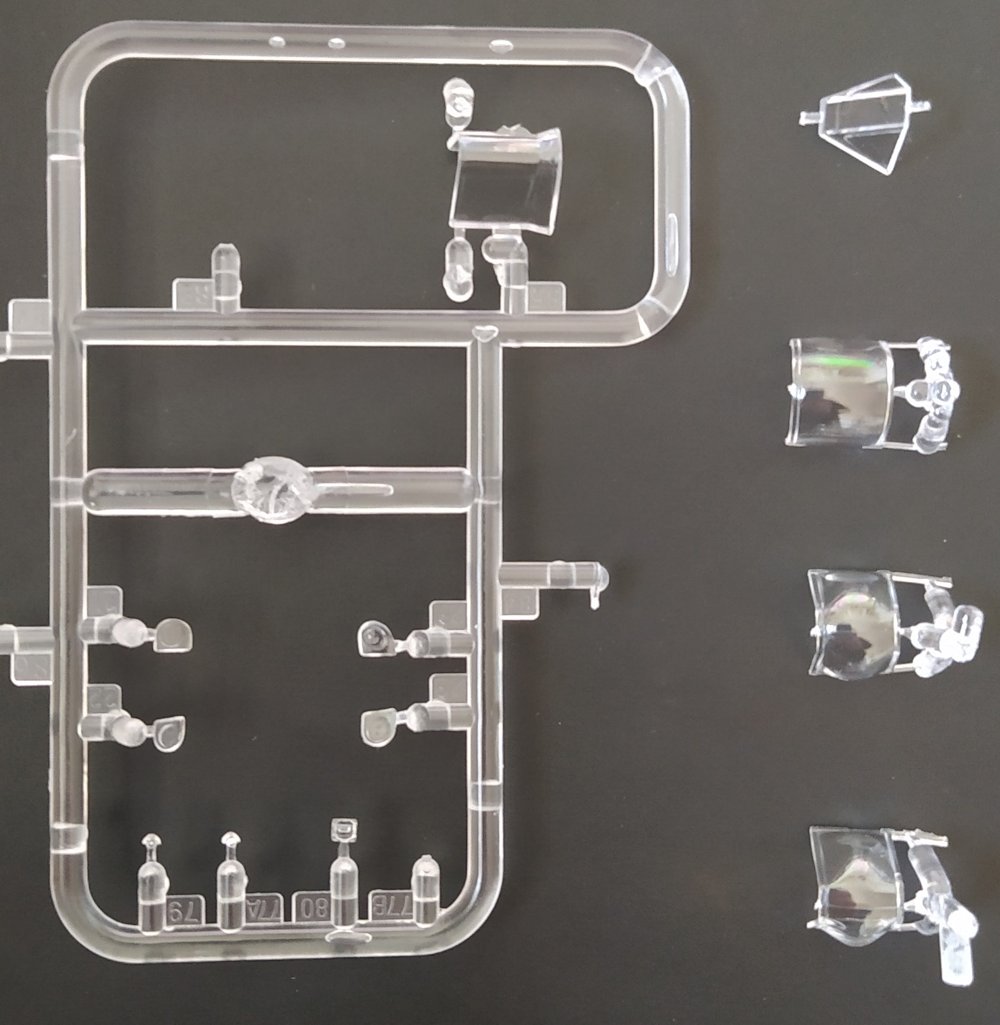 Ein kleiner Gussast enthält genau zwölf Klarsichtteile. Die Cockpitscheiben erlauben sowohl eine geschlossene als auch eine offene Darstellung.