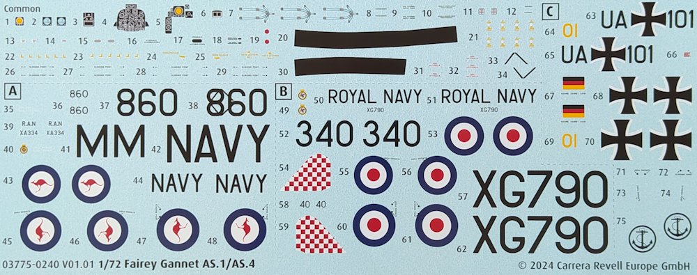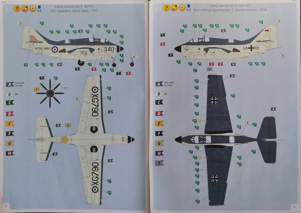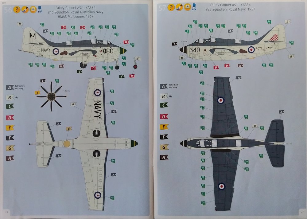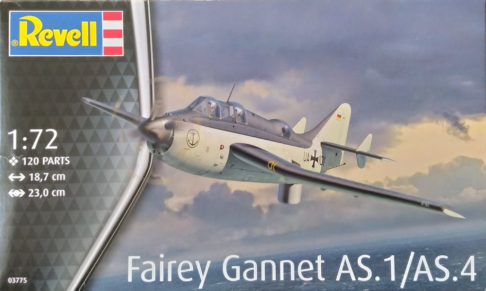 Bausatz: Der Bausatz stellt bereits die vierte Auflage des Modells von 2007 dar. Es hat auch schon vorher Bausätze der Fairey Gannet im Maßstab 1/72 gegeben, beginnend mit der Firma FROG in den 1970er Jahren, der tschechischen Firma CMR, die einen (recht teuren) Resinbausatz herausbrachte, und letztlich aus China TRUMPETER, die im Jahre 2006 einen Bausatz herausbrachten.