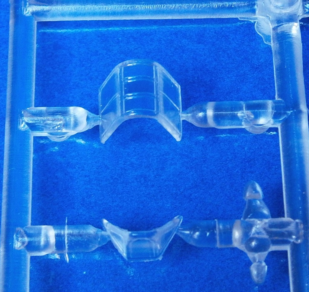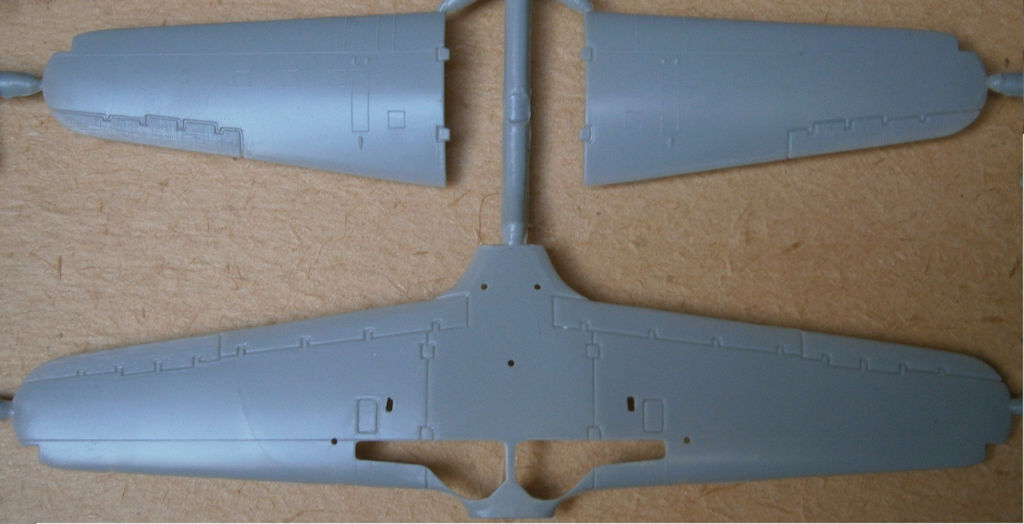 Neben sehr feinen Panellines finden sich noch einige wenige Riefen, also bereits versenkte Gravuren, auf der Oberfläche der Zelle. Das Verhältnis ist recht ausgewogen, finde ich. Weit besser als es beispielsweise Matchbox jemals gelang. Im Gegensatz zu den stets zu grobschlächtig designten Gravuren der Engländer fand Supermodel hierbei nämlich das richtige Maß. Die erhabenen Linien sind nach dem Lackieren nämlich gerade so zu erkennen, was auch auf die Trennfugen der Ruderflächen usw. zutrifft. Am besten kann man die Oberflächendetails wohl mit den zur etwa gleichen Zeit in der Tschechoslowakei entstandenen Kovozavody KP-Bausätzen vergleichen. Doch hat man den italienischen Jagdeinsitzern zudem noch auffällige Leinen-Texturen auf den Rudern spendiert, und sogar auch noch Klarsichtteile für die Positionsleuchten an den Flügelrandbögen!