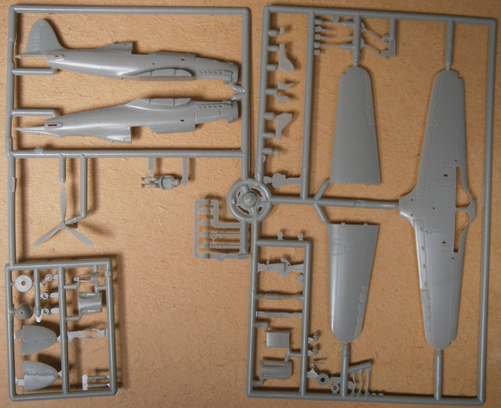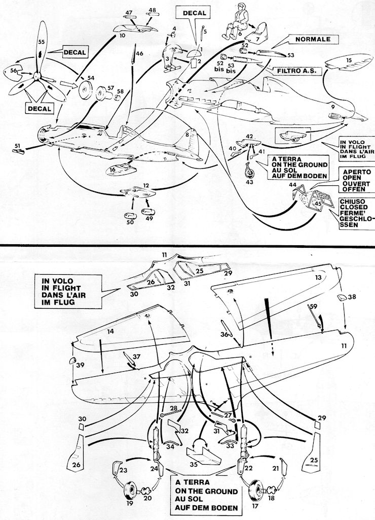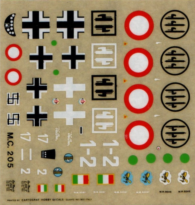Als logische Fortführung innerhalb der Reihe der einsitzigen Jäger der Regia Aeronautica war 1973 also auch ein Modell der Macchi C. 202 „Folgore“ und gleichzeitig auch eines der C. 205er Weiterentwicklung „Veltro“ erschienen. Das Anliegen, bessere Kits anbieten zu wollen, war bekanntlich geglückt, und diesmal konnte sogar ein direkter Vergleich angestellt werden. Denn schon seit 1963 gab es nämlich bereits ein Frog-Modell der Folgore. Das war gar nicht so übel und wurde schlussendlich, sehr viel später auch noch von Bünde aus, in einer Matchboxschachtel angeboten. Doch war der italienische Kit fraglos besser. Auch das Nachfolgemuster Macchi C. 205 war für damals recht ordentlich geworden. Es verwendete wie das Originaltragwerk und Rumpf der Folgore, weshalb nur wenige neue Teile auf dem geteilten Gussrahmen zu finden waren.