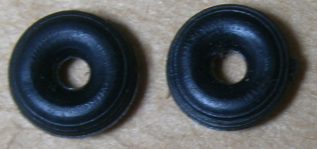 Des Weiteren zeichneten sich die Kits mit Vollgummireifen für die Haupträder aus. Wohl weisen sie bereits ein Rillenprofil auf, doch wird ihre Montage mit einer recht kleinen Felge erkauft. Diese entspricht jedoch nicht besonders dem Original, womit ihr Wert also leider zweifelhaft bleibt. Höchstwahrscheinlich deshalb erschienen in einer Lizenzauflage der Fa. „Delta 2“ wieder gewöhnliche Räder auf den nunmehr schon in einem Stück gegossenem Gussrahmen.
