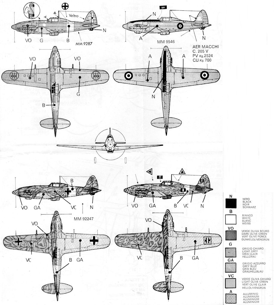 Bereits vor der Kriegsmitte begann man deshalb die meisten eigenen Baumuster auf die DB-Triebwerke umzukonstruieren. Anschießend wollte man jedoch auch noch neue Maschinen entwerfen, um mit den neuen alliierten Jagdmaschinen Schritt halten zu können. Diese Arbeiten liefen dann tatsächlich noch unter einem „Serie 5“ genannten Programm an. Doch wurden jene Typen aber erst kurz vor Italiens Ausscheiden aus dem Krieg fertig. Wohl waren deren Herstellungswerke allesamt in Norditalien beheimatet, doch eine Großserienfertigung in der RSI fand nach 1943 allerdings nicht mehr statt. Aermacchi war, als erstem, eine Umrüstung auf den deutschen Reihenmotor gelungen. Und die so entstandene C. 202 „Folgore“ wies danach tatsächlich eine merkliche Leistungssteigerung auf. Womit sich auch ihr Kampfwert schon an eine Mustang oder Spitfire annähern konnte. Mit dem Nachfolger „Veltro“ d.h. Wind- oder Jagdhund gelang noch eine Verbesserung, die vor allem dem bei Fiat nachgebautem DB 605 A Triebwerk zu verdanken war. Und auch die Fiat G 55 selbst war ein voller Erfolg, und wurde daher wohl zu Italiens besten Jagdflugzeug. Doch konnten die wenigen Maschinen nichts mehr bewirken was auch für die Reggiane RE 2005 Sagitario galt. Während die Fiat auch nach dem Kriege noch hergestellt wurde, wurde ein geplanter C. 205-Auftrag für die ägyptischen Luftstreitkräfte während der Herstellung von israelischen Agenten sabotiert. Daher konnte nur noch ein Teil ausgeliefert werden, und deren anschließender Einsatz während des israelischen Unabhängigkeitskrieg verlief nicht besonders erfolgreich.