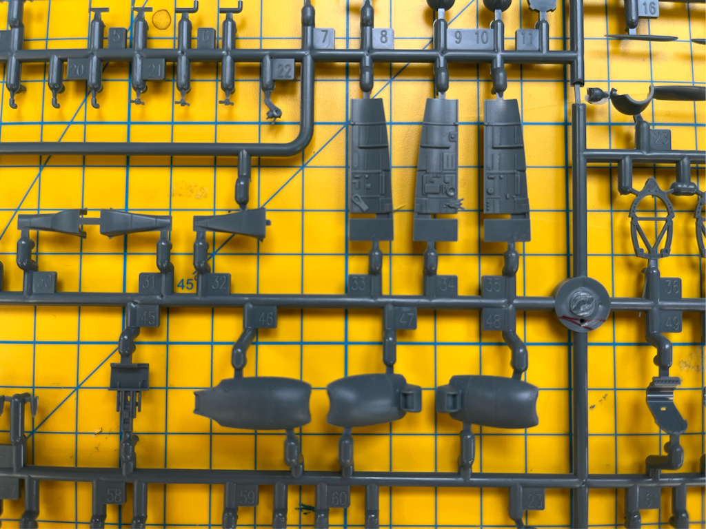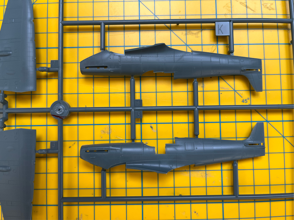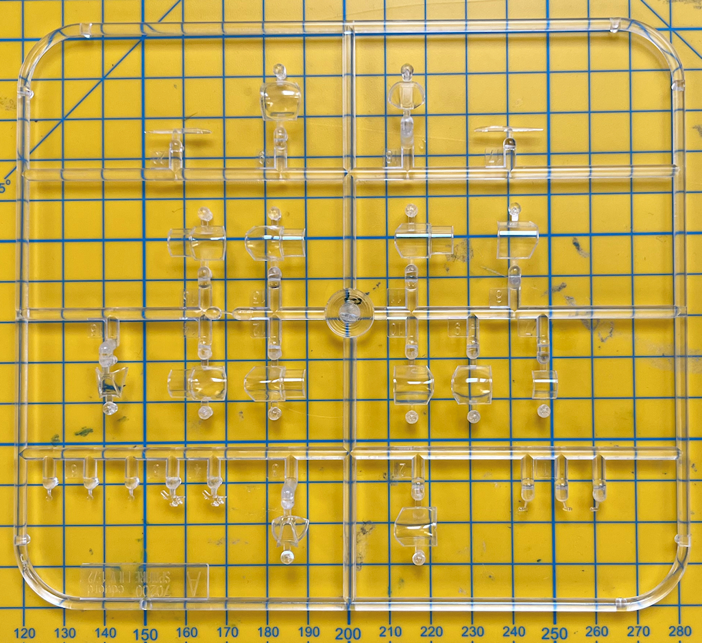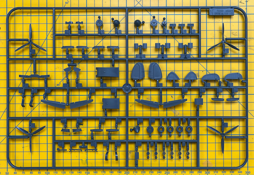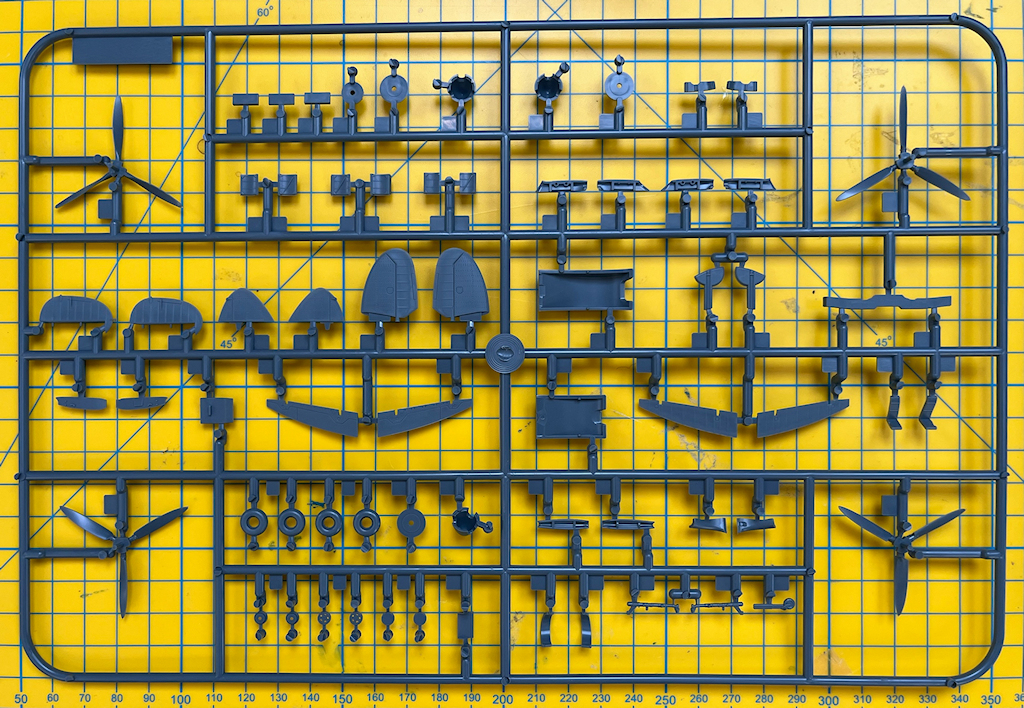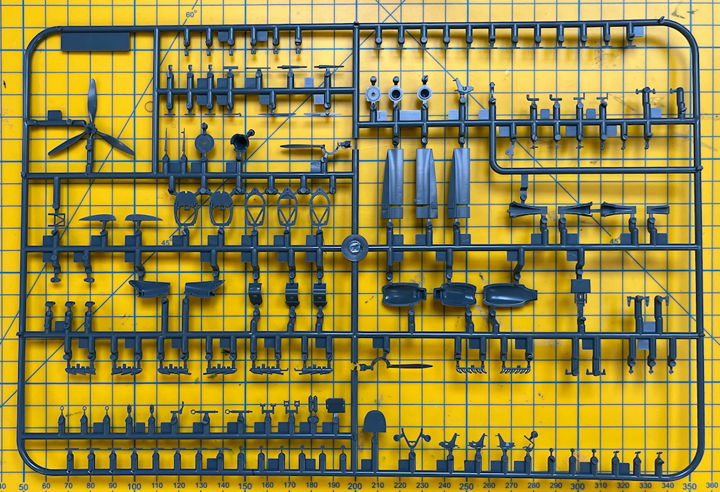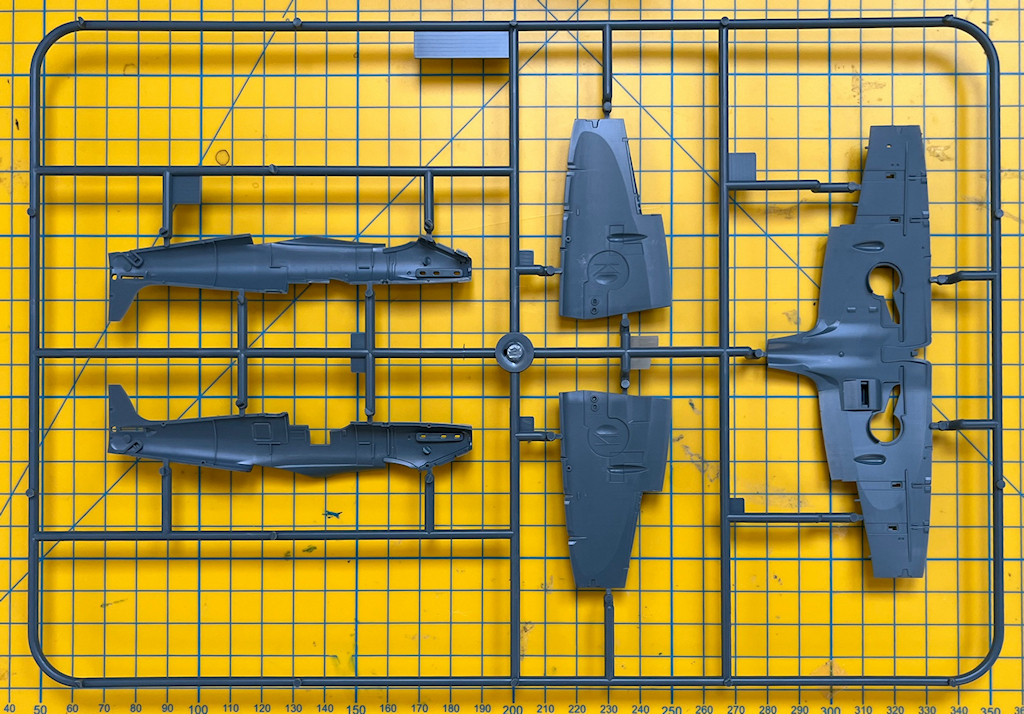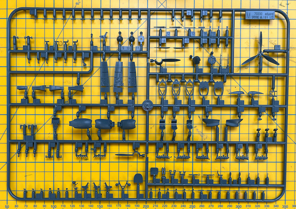 Beim Betrachten der Bauteile kommen gemischte Gefühle auf. Es gibt sehr viele kleinste Bauteile, die man verarbeiten muss. Damit ist es mit Sicherheit kein Anfängerbausatz. Die Oberfläche der kleinen Spitfire ist voll mit feinsten Strukturen und Nieten. Diese wirken erst beim zweiten Blick. Damit sie erhalten bleiben, ist eine sehr feine Lackierung notwendig. Grat ist nur hier und da zu entdecken. Eine Menge Teile sind für andere Varianten und verbleiben am Spritzling.