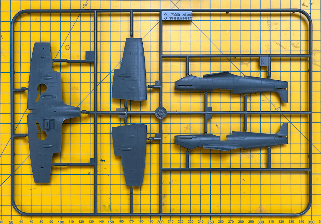Im Heck gibt es ein separates Seitenruder und das aus zwei Teilen bestehende Höhenleitwerk. Scharfe Hinterkanten findet man hier ebenfalls. Für den kleinen Lufteinlauf unterm Rumpfbug gibt es einen geätzten Schutz. Der Kühler unter der Tragfläche kann mit einer offenen Klappe gebaut werden.