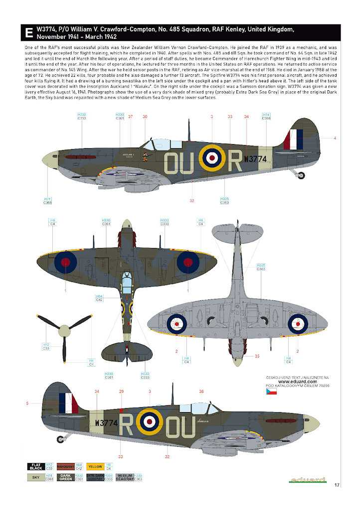 - Mk.Vb, W3774/OU-R, 485. Squadron der RAF, P/O William V. Crawford-Compton, RAF Kenley, Großbritannien, November 1941 bis März 1942;