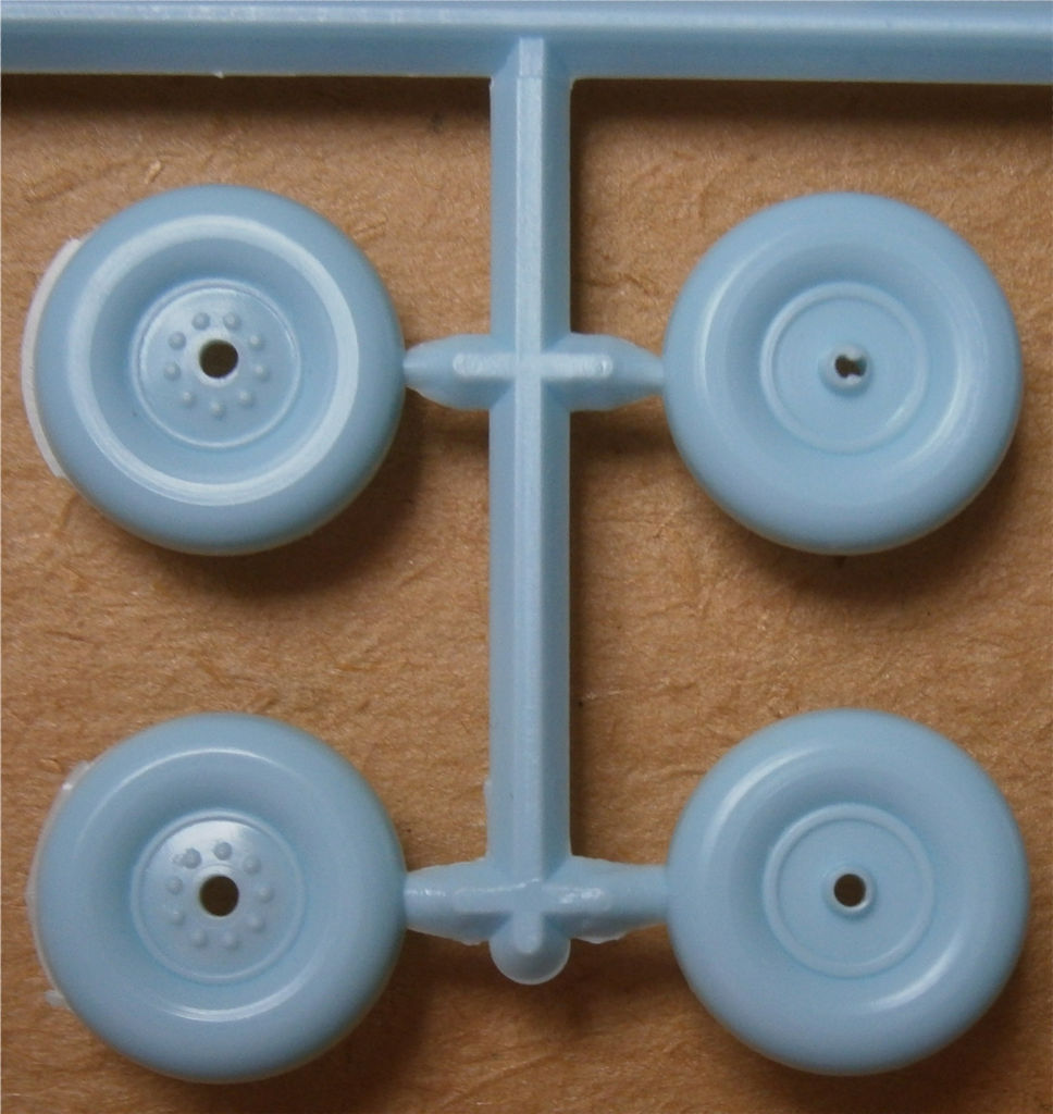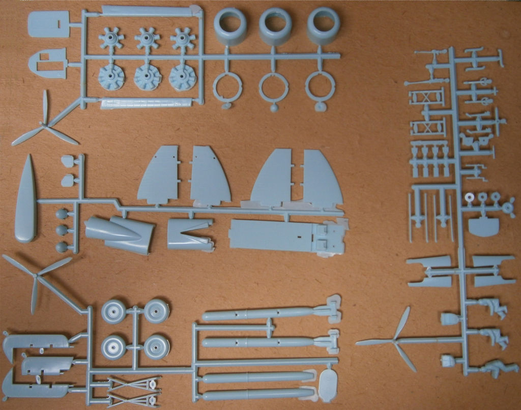 In diesem Zusammenhang sollte auch das Teil erwähnt werden, das die SM 79 erst zum „il Gobbo“ machte, also einen kompletten, separaten, geschlossen nachgebildeten, Waffenstand-“Buckel“. Keine schlechte Idee, nur muss an dieser Stelle leider nach der Montage etwas gespachtelt werden, damit es nicht allzu große Fugen gibt. Für die Triebwerksnachbildungen hält der Bausatz jeweils zwei übereinander zu klebende „Sterne“ bereit. Auch wenn sie nicht ganz so viele Details aufweisen, für den Standard-Maßstab evtl. gerade noch plausibel, würde ich sagen. Auch die Verstrebung des Fahrwerks wäre nicht so schlecht, dazu spendierte man den Felgen der Räder noch einige Bolzenköpfe. Tatsächlich sahen die Felgen allerdings ganz anders aus, nämlich so wie man sie bei Italeri designt hat! Die restlichen Kleinteile sind dann nicht mehr so aufwändig nachgebildet worden. Immerhin erhält man noch zwei „Siluri“, obwohl im Einsatz eigentlich meist nur ein Torpedo mitgeführt worden war, um die Flugleistungen nicht noch mehr zu verschlechtern. Die Klarsichtteile neigen aufgrund ihrer unnötigen Stärke bereits etwas zur optischen Verzerrung, deren Verstrebung bzw. Rahmung wäre jedoch soweit hinreichend nachgebildet, sie wäre bislang nämlich (noch) nicht ganz am „verschwimmen“.