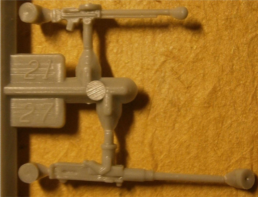 Das Cockpit indes, wäre einigermaßen hinreichend ausgestattet, finde ich. Die aktuelle Vintage Classics-Ausgabe liefert sogar ein ansehnliches Abziehbild für das ansonsten völlig plane Armaturenbrett, welches zugleich die Trennwand zum Bug bildet. Sitze, Pilotenfiguren sowie zwei Steuersäulen sind natürlich nicht viel, doch gibt es darüber hinaus noch weitere Zwischenwände mit den nötigen Öffnungen für den Durchgang zum hinteren Rumpfbereich. Daran finden sich sogar kleine Reliefs, dumm nur, dass sich diese „Spante“ oder „Schotts“, wenn überhaupt, am Original an anderen Stellen befanden! Innendetails wie bei Italeri gibt es an den Rumpfwänden dann allerdings keine! Sehr gut gelungen sind dagegen die zwei MG-Nachbildungen. Es handelt sich dabei nämlich nicht, wie einst üblich, um irgendwelche universellen „Schießprügel“ sondern um für den 72er Maßstab überraschend gute Nachbildungen. Lediglich die Lafette für die Breda-Safat auf dem Rumpfrücken ist leider völlig vereinfacht nachgebildet worden. Das Lewis Maschinengewehr kann hier jedoch wahlweise jeweils links oder rechts montiert werden. Allerdings liefert Airfix zudem auch noch Abdeckungen für die zwei betreffenden „Schießscharten“ mit, worauf die aktuelle BA jedoch nicht mehr hinweist. Frühere Auflagen sprachen diesbezüglich von einer ebenfalls noch möglichen zivilen Version.