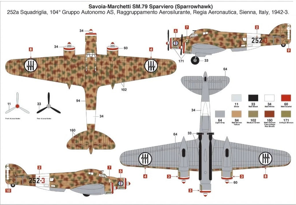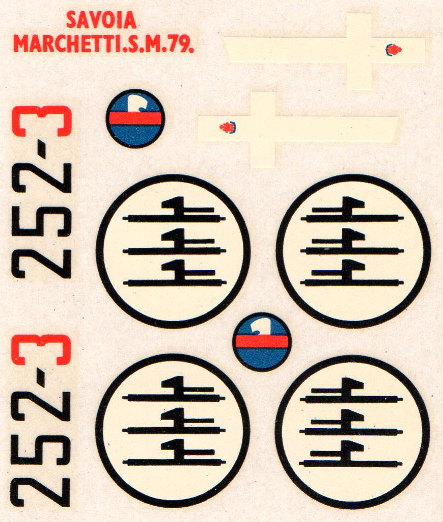 Der Decalbogen, ist für heutige Ansprüche, zugegeben, minimalistisch. Wartungshinweise oder Stencils sucht man darin daher vergebens, doch sind die Markierungen recht authentisch. Es existieren nämlich Beweisaufnahmen gleicher Kennung. Jedoch stimmt die Camo auf Roy Cross’ attraktiver Boxart nicht mit der einen Aufnahme überein. Wobei es sich nämlich bereits um ein Farbfoto handelt! Die schwarzweißen hingegen, mit einer Fleckentarnung, die klarerweise aus nur in grau wiedergegebenen Schattierungen besteht. Ließe eigentlich auch eine Interpretation, wie sie der bekannte Maler wählte, zu. Interessant in diesem Zusammenhang wäre auch, dass über die Jahre die Bemalungshinweise abgeändert wurden. Waren sie bei den frühen Ausgaben der BA noch völlig konform zum ansehnlichem Deckelbild. Wurden später ein Farbton daraus, gegen einen anderen ausgewechselt. Das diesbezügliche „Schiefer“– bzw. Mittelgrau stellte nämlich ebenfalls Bestandteile eines für die SM 79 plausiblen Anstrich dar. Und dieser stellt gemäß der farbigen Fotografie ganz offensichtlich die korrekte Bemalung dar! Bei der aktuellen Vintage Classics-Edition in der roten Hornby-Schachtel wurde die Camo nunmehr vermeintlich berichtigt, zumal ja die Kennungen stets unverändert blieben. Abweichend von der Boxart wurde neben dem ursprünglichen Grün, sowie Beige bzw. „Sand“ noch ein Braunton hinzugefügt! Womit jetzt de facto aber eine weitere, wenn auch kleine Ungereimtheit entsteht! Das Farbbild ist nämlich aus einiger Ferne aufgenommen worden, und das damalige Finish besitzt den nicht eben seltenen Farbstich jener Zeit. Theoretisch könnte man das u.a. auf der britischen Wikipedia-Webseite offerierte Foto also letzten Endes für den dreifarbigen Tarnanstrich halten, der aktuell von Hornby auserkoren wurde. Das auf allen Fotos jedoch fehlende weiße Mittelmeerkampfraum-Band aber ist jetzt sicher keineswegs ein gravierender Fehler, denke ich.