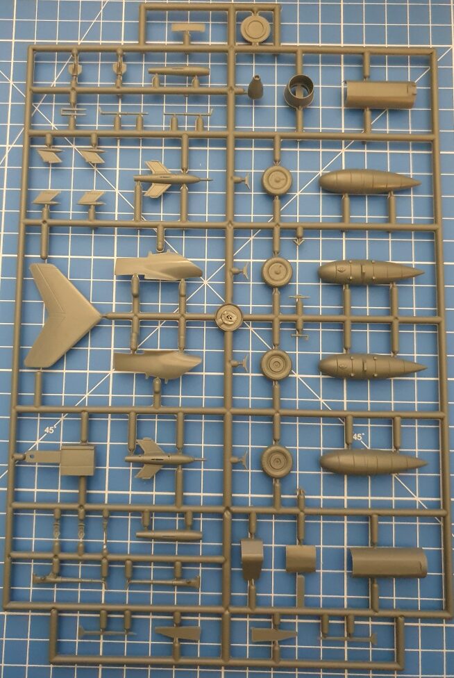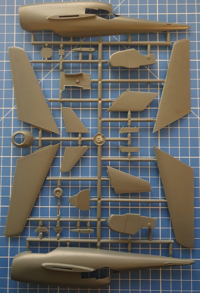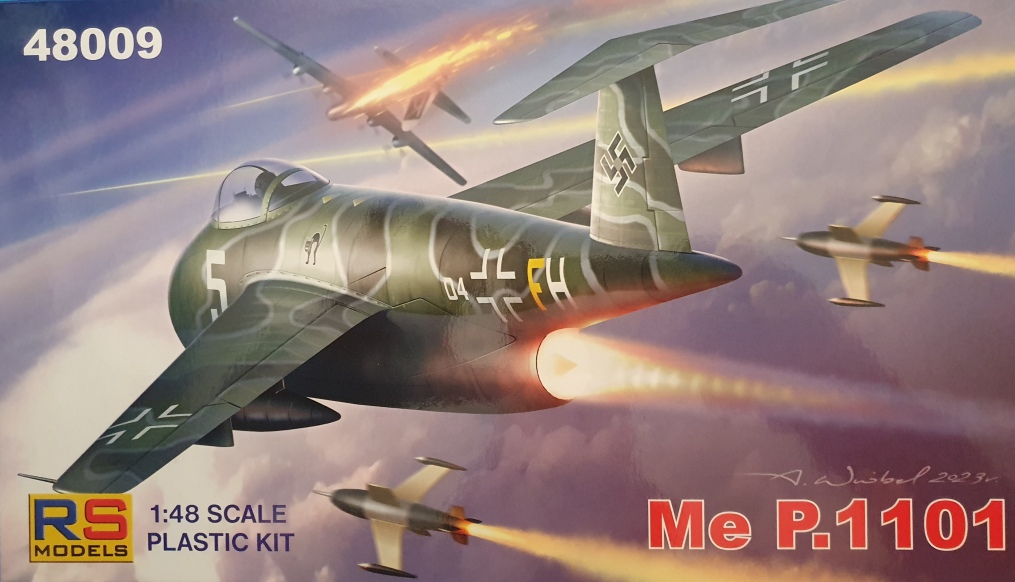 Der Kit ist eine Wiederauflage des RS-Bausatzes von 2023 mit neuen Decals. Einen früheren 48er Bausatz der P.1101 gab in den 2000ern aus Resin von Antares. Die Bauteile sind Shortrun-Produkte ohne Lokalisationshilfen und zeigen ein wenig Fischhaut und einige Auswurfmarkierungen, zum Glück nur auf der Innenseite. Die Detaillierungen bestehen einzig aus feinen, sehr sauberen Gravuren. Das Glasteil, das leider nur die geschlossene Kanzelhaube darstellt, ist ausreichend klar. Das Cockpit hat einen Sitz, ein fein geprägtes Instrumentenbrett, zwei Seitenkonsolen, einen Steuerknüppel und Seitenruderpedale. Für die Sitzgurte muss der erlauchte Modellbauer selbst sorgen. Für den Lufteinlauf findet sich ein dreiteiliges Rohr, um den Durchblick zu verhindern, hinten dient dazu ein vielteiliges Ensemble einschließlich Zwiebel. Sehr schön sind die fein detallierten Räder, die hälftig zusammengeklebt werden müssen und dabei leider Profil einbüßen werden. Die Fahrwerksbeine ankern seitlich in speziellen Mulden, die von separaten Rumpfteilen dargestellt werden. Das Bugrad hat seinen Angriffspunkt weit ausgestellt vorn in einem separaten Schacht. Leider wird nirgends auf ausreichenden Ballast hingewiesen. Für das Höhenleitwerk gibt es zwei Varianten, einmal die Möglichkeit, es auf Rumpfhöhe anzubauen, oder aber, ein T-Leitwert zu konstruieren. Für Langstreckenflüge bietet der Kit noch zwei Zusatztanks im Bf 109/Fw 190-Stil. Ein weiterer netter Gimmick sind zwei Ruhrstahl-Flugkörper, die jeweils mit einem Antriebsrohr und einer Bauchflosse versehen an eine kleine Schiene montiert unter dem Flügel landen.