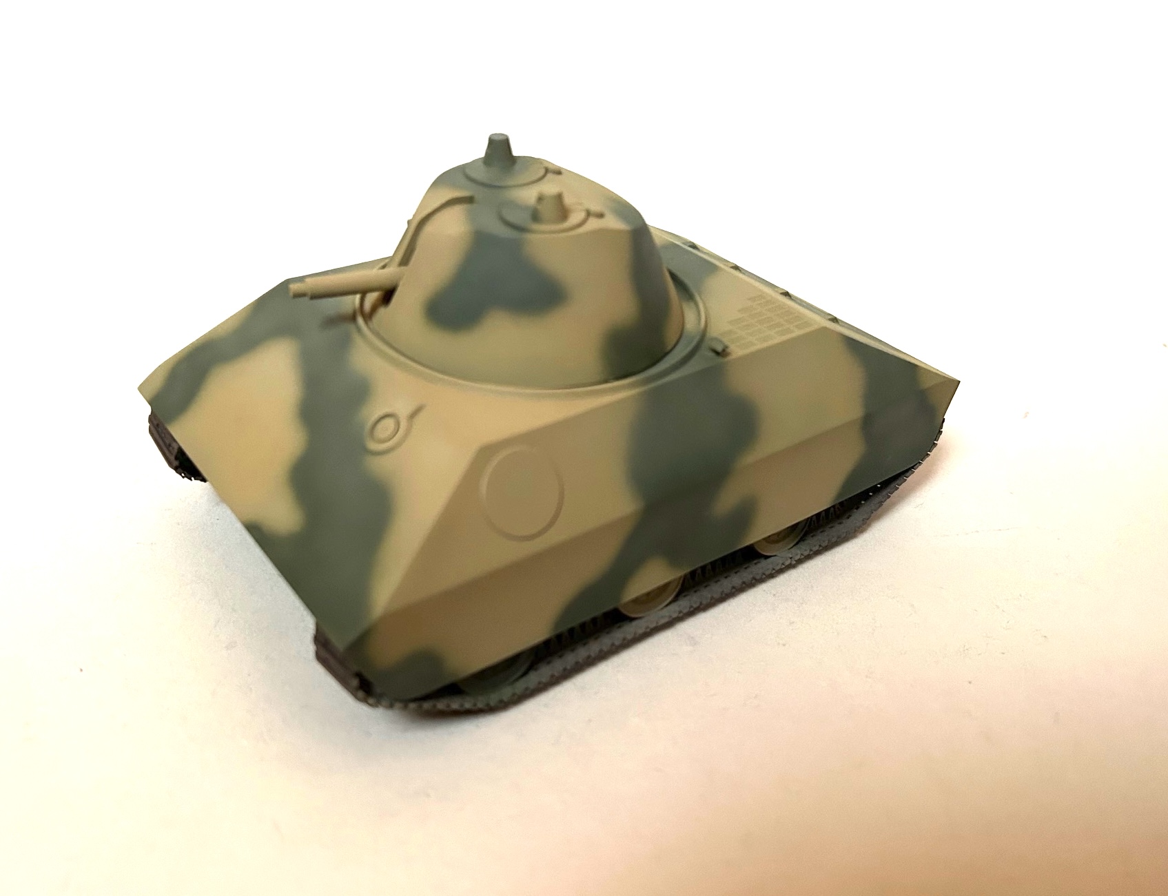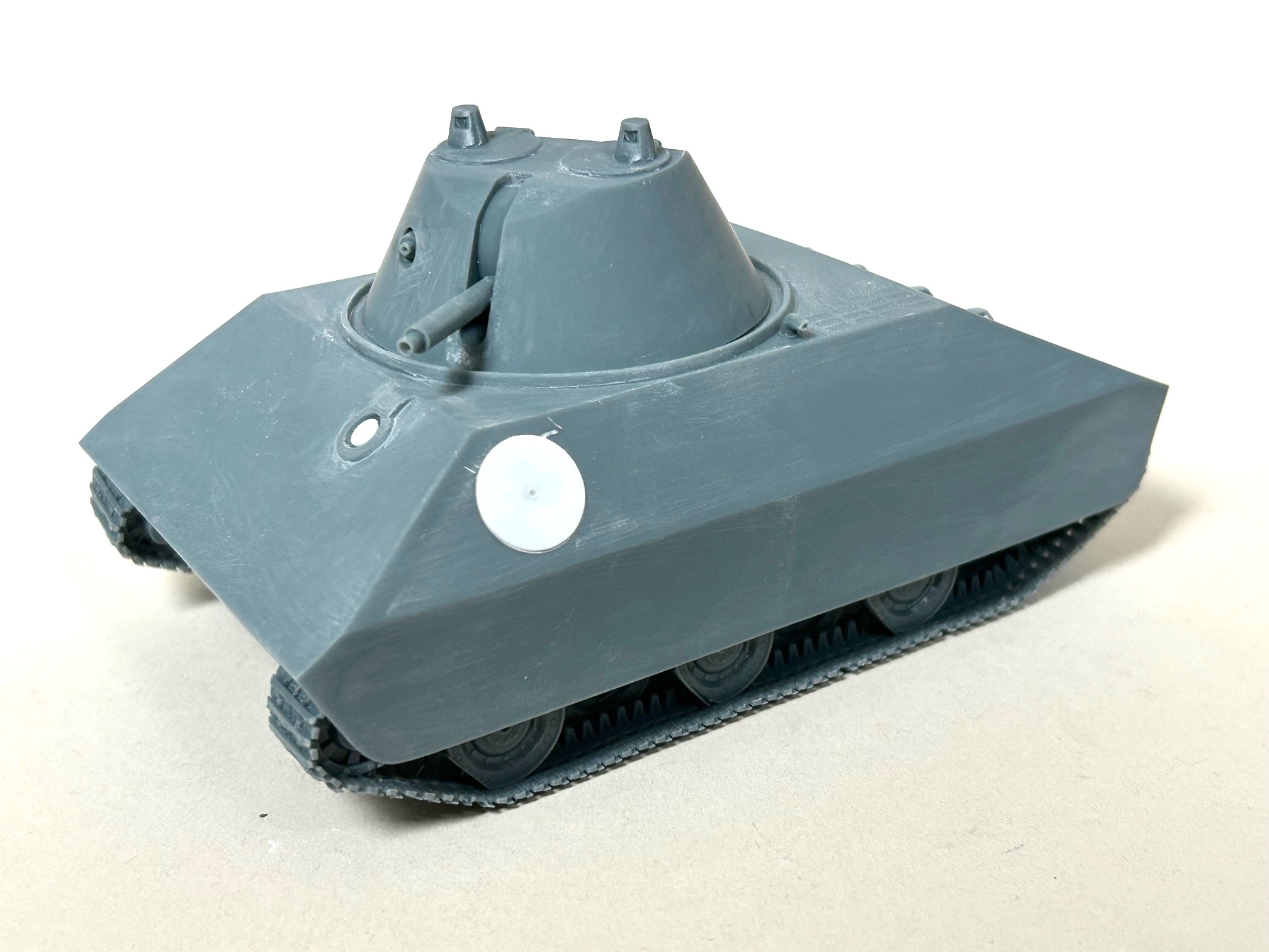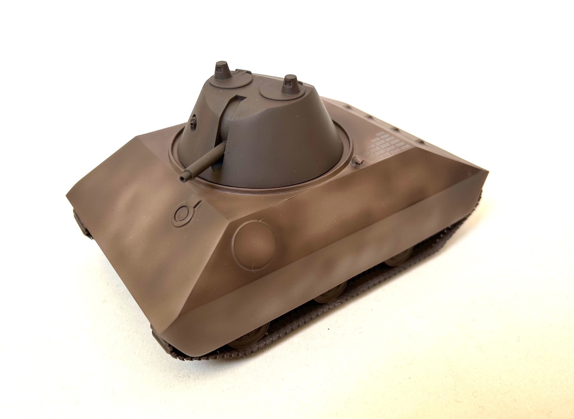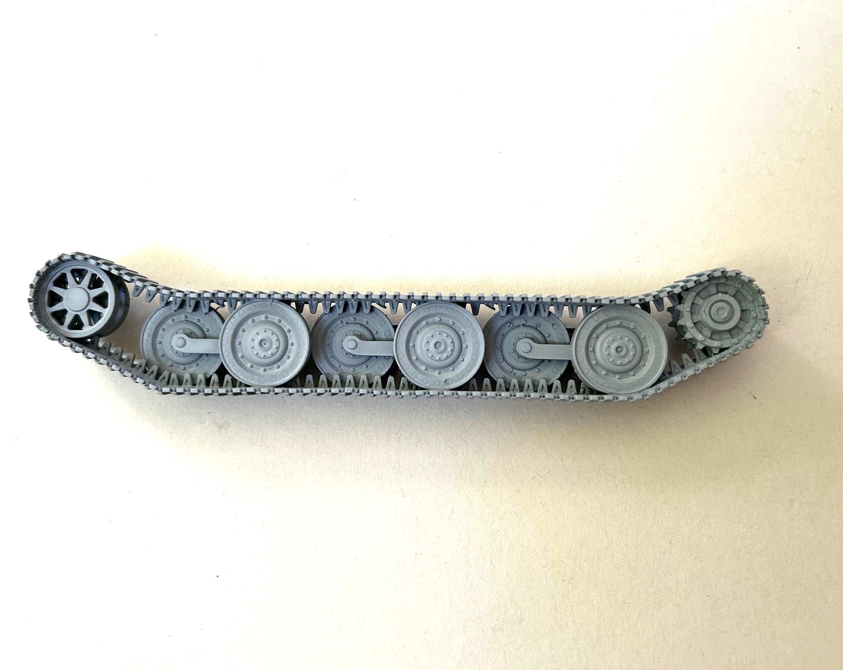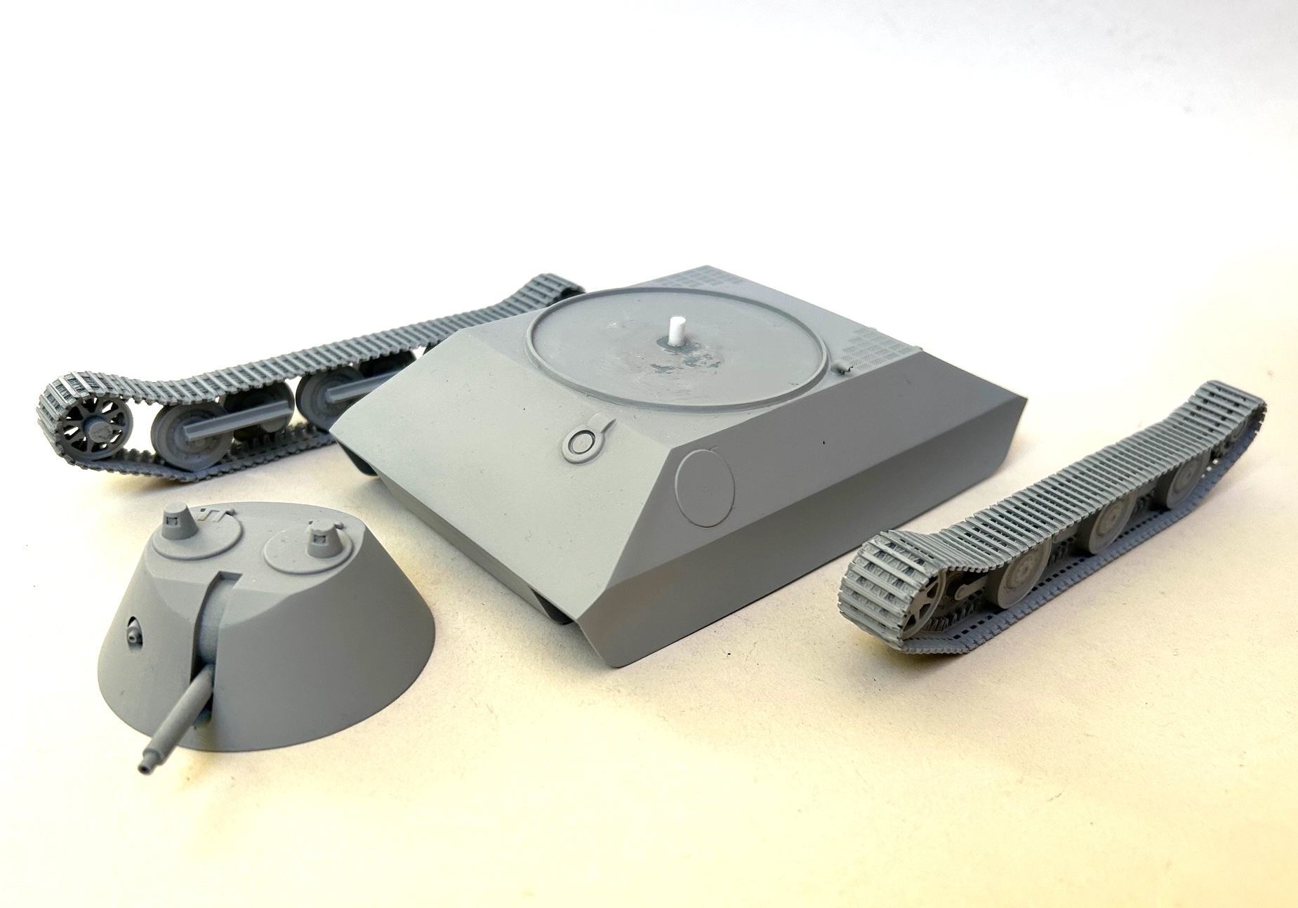 Die mir vorliegenden Teile wiesen an einigen Stellen noch Riefen vom Druckprozess auf, die aber wegen den einfachen Flächen des Panzerdesigns an der Wanne und dem Turm in kurzer Zeit mit Schleifpapier geglättet werden konnten. Der Turm und die Wanne stimmen hinsichtlich Design sehr gut mit den mir bekannten Zeichnungen und dem Holzmodell überein. Gleiches gilt auch für die Laufwerksteile, bei denen etwas mehr Aufwand für das Entfernen der Druckstreben erforderlich war. Insgesamt konnte ich aber bereits zu diesem Zeitpunkt bestätigen, dass es sich wirklich um einen „Easy Kit“ handelt.