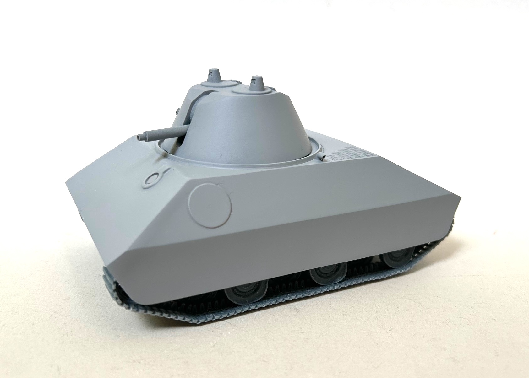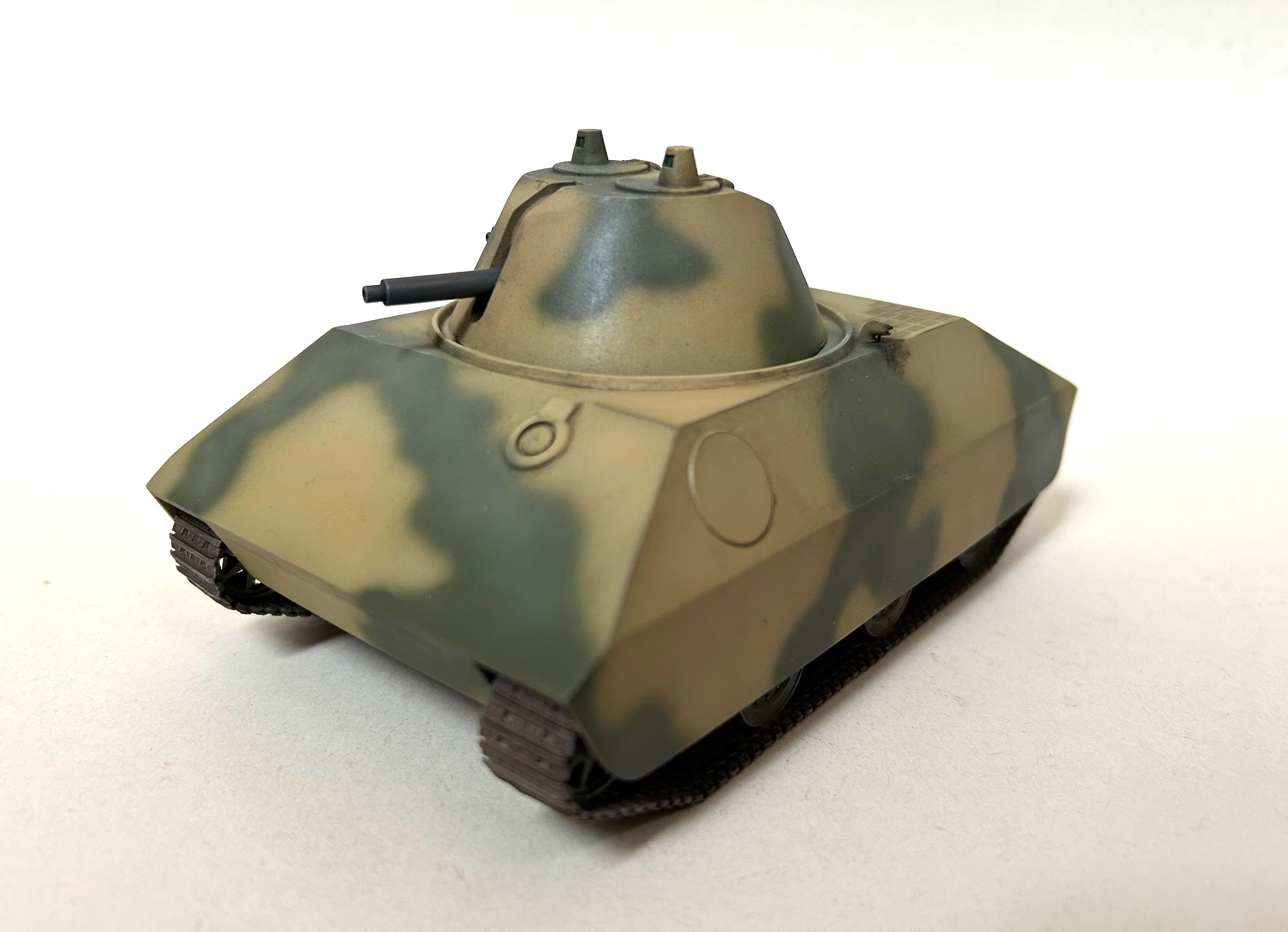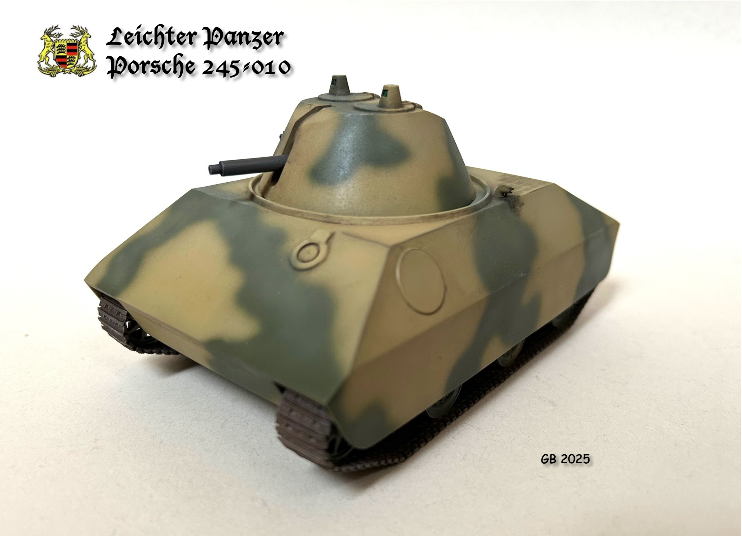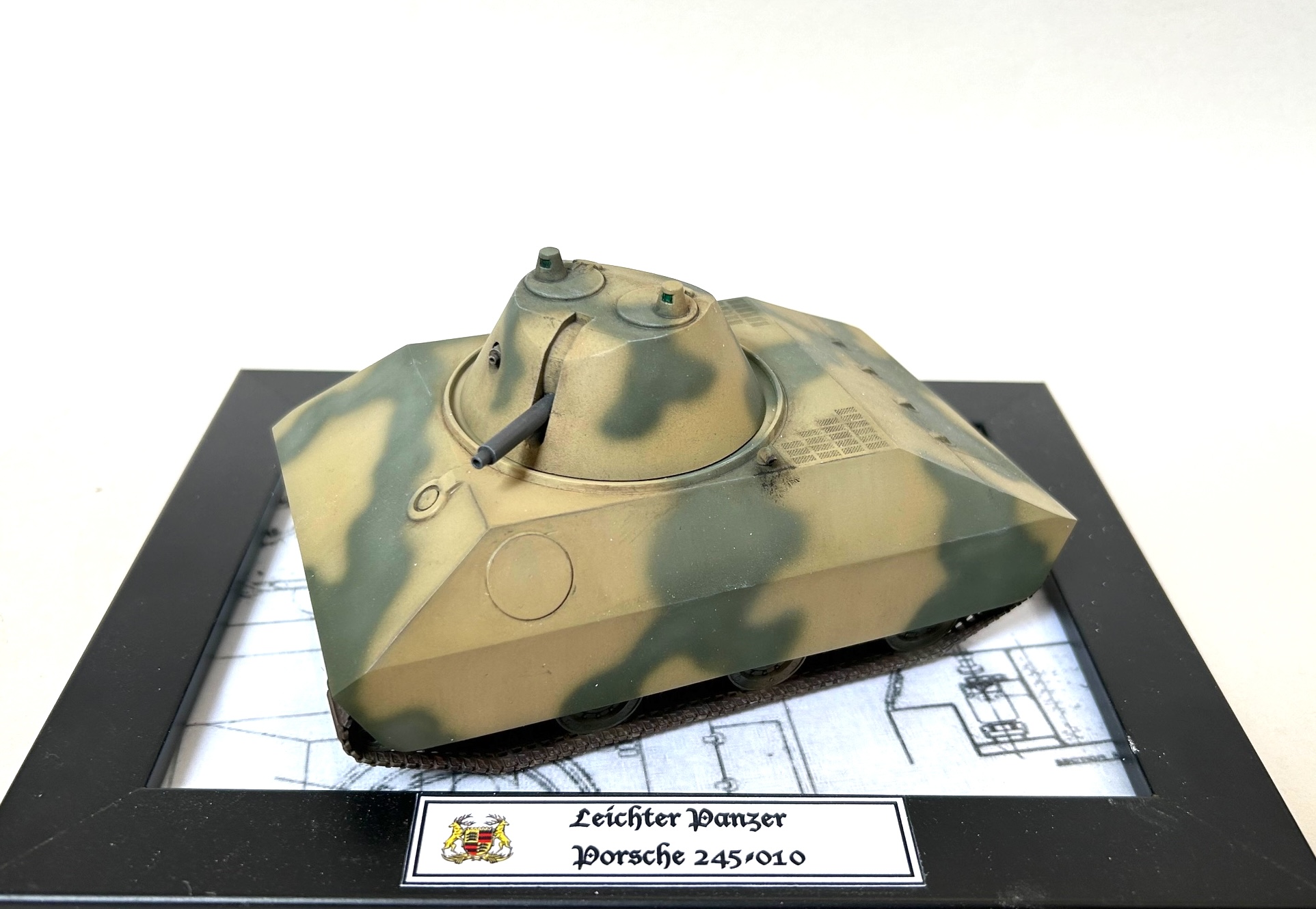 Das Vorbild: Während des zweiten Weltkrieges gab es für kreative Ansätze und Ideen der Rüstungsindustrie nahezu keine Grenzen. Dies mündete zum einen in abstruse und überzogene Projekte nach dem Motto: „größer, stärker bewaffnet und stärker gepanzert“ wie den überschweren Panzern E-100 oder dem Landkreuzer Ratte. Auf den anderen Seite existierten aber auch neue Konzepte in Richtung Standardisierung, Kostensenkung und Materialersparnis sowie Effizienz. Zu letzteren gehört das Projekt P-245-010. Entsprechend einer Forderung vom Juli 1943 nach einem mobilen Kleinpanzer mit zuverlässigem Schutz gegen Panzerabwehrwaffen und kleinen Fliegerbomben wurde ein Team aus Mitarbeitern von Porsche (Chassis und Motor) und Rheinmetall (Waffe) gebildet. Aus dieser Kooperation entstand der Entwurf des leichten Panzers Porsche 245-010. Dieses Konzept kann durchaus als innovativ bezeichnet werden, da eine vollautomatische 5,5cm Kanone MK 112 auf einem kleinen und mobilen Aufbau mit 360° Schwenk- und nahezu 90° Hohenrichtung vorgesehen war. Unter Verwendung eines Patronengurtsystems sollte eine effiziente Bekämpfung von Erd- und Luftzielen sicher gestellt werden. Als Sekundärwaffe war ein MG vorgesehen, das rechts neben der Kanone in einem Kugelgelenk gelagert war. Das Fahrgestell sollte aus sechs Ganzstahlrädern bestehen, die paarweise auf Laufwagen montiert waren und hinsichtlich Konzept wie auch der Wannenform Ähnlichkeiten mit dem Jagdpanzer 38 (t) aufweisen.