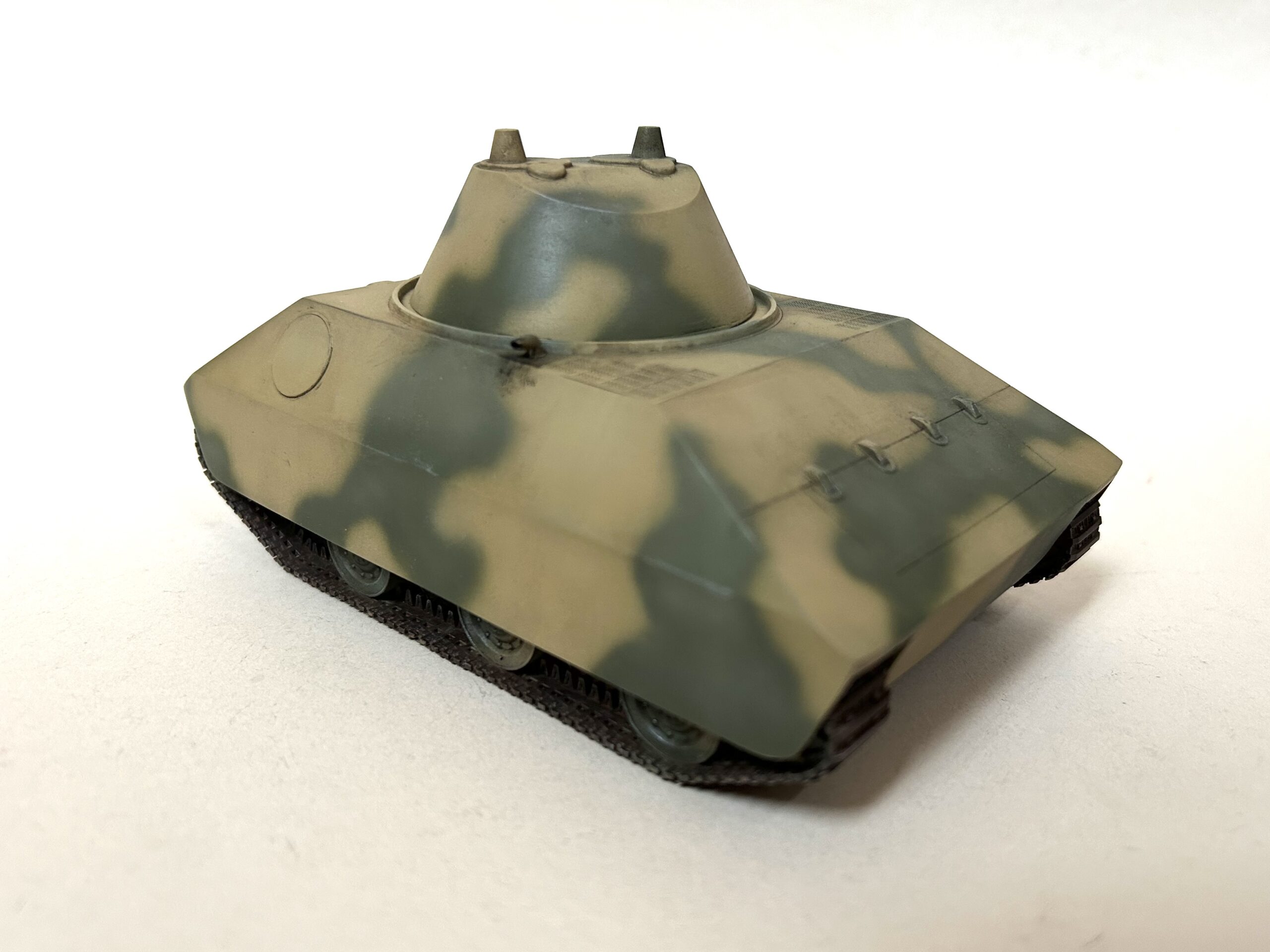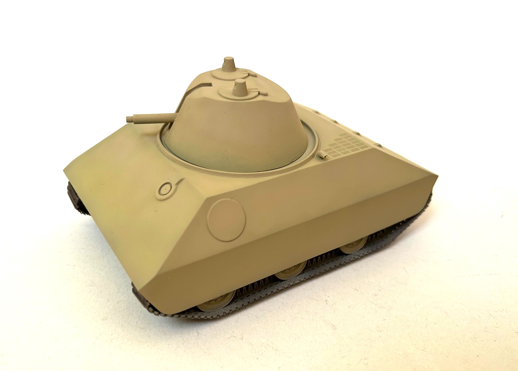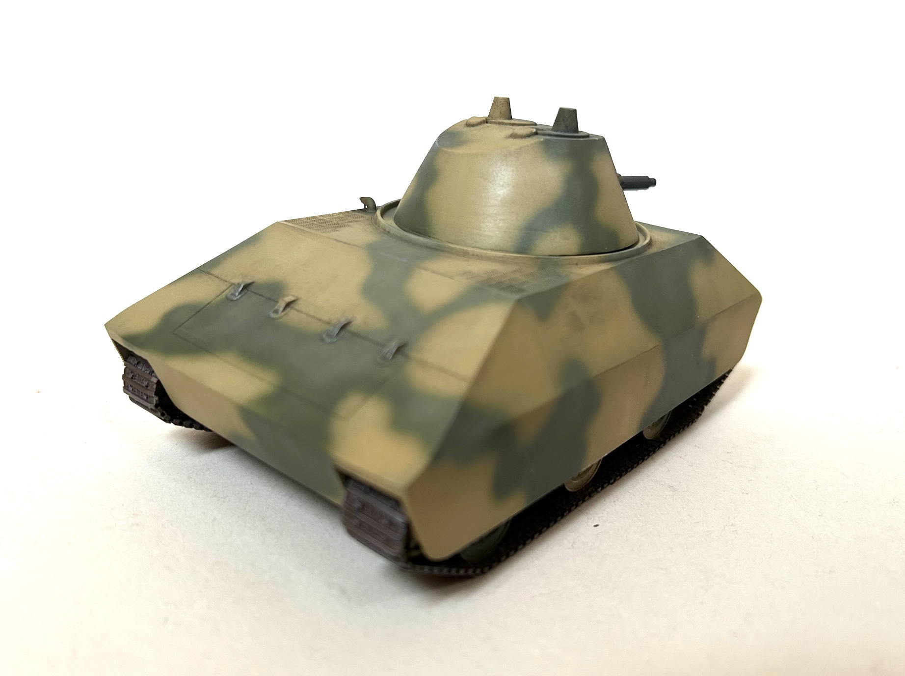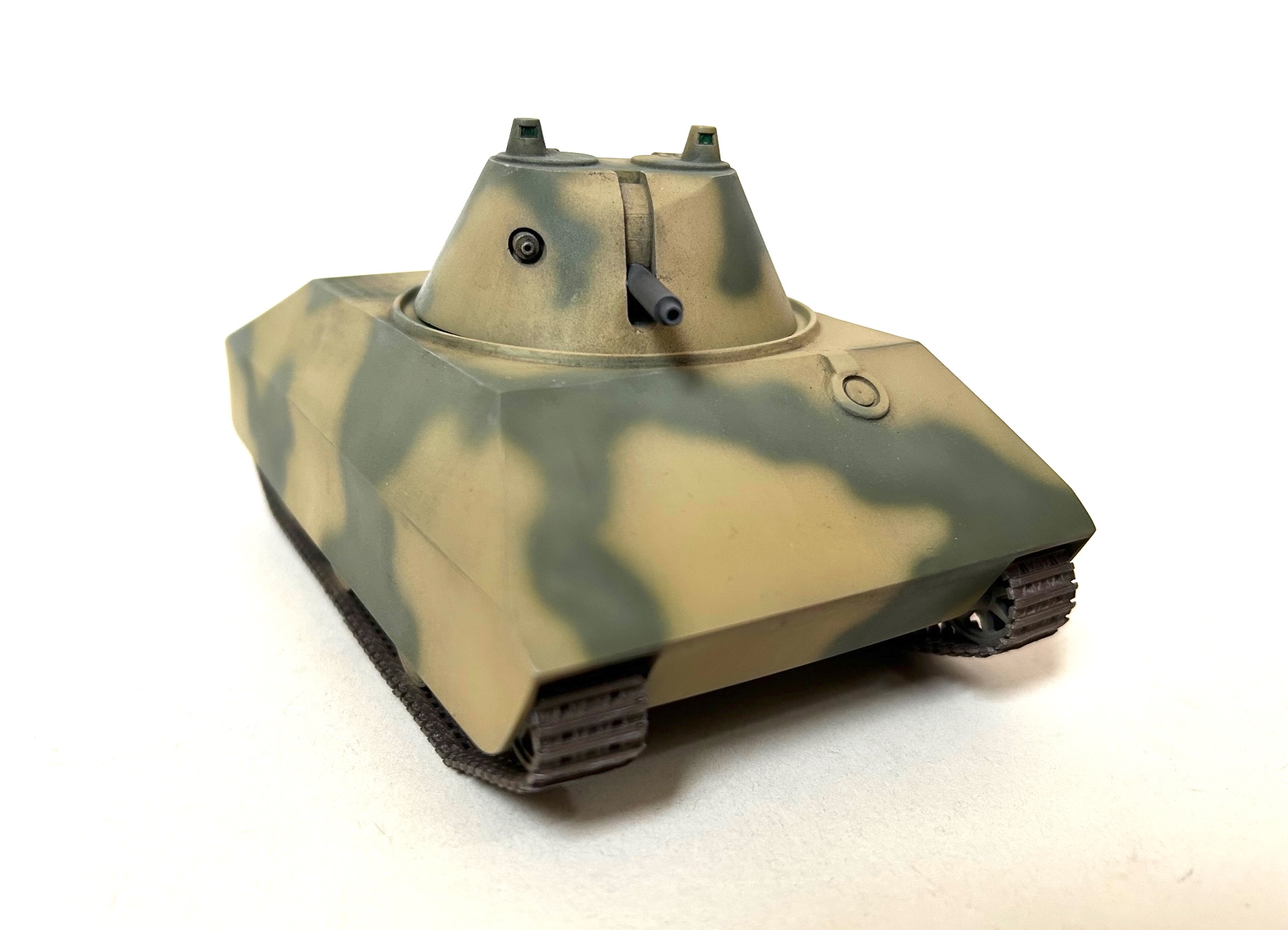 Das Vorbild: Während des zweiten Weltkrieges gab es für kreative Ansätze und Ideen der Rüstungsindustrie nahezu keine Grenzen. Dies mündete zum einen in abstruse und überzogene Projekte nach dem Motto: „größer, stärker bewaffnet und stärker gepanzert“ wie den überschweren Panzern E-100 oder dem Landkreuzer Ratte. Auf den anderen Seite existierten aber auch neue Konzepte in Richtung Standardisierung, Kostensenkung und Materialersparnis sowie Effizienz. Zu letzteren gehört das Projekt P-245-010. Entsprechend einer Forderung vom Juli 1943 nach einem mobilen Kleinpanzer mit zuverlässigem Schutz gegen Panzerabwehrwaffen und kleinen Fliegerbomben wurde ein Team aus Mitarbeitern von Porsche (Chassis und Motor) und Rheinmetall (Waffe) gebildet. Aus dieser Kooperation entstand der Entwurf des leichten Panzers Porsche 245-010. Dieses Konzept kann durchaus als innovativ bezeichnet werden, da eine vollautomatische 5,5cm Kanone MK 112 auf einem kleinen und mobilen Aufbau mit 360° Schwenk- und nahezu 90° Hohenrichtung vorgesehen war. Unter Verwendung eines Patronengurtsystems sollte eine effiziente Bekämpfung von Erd- und Luftzielen sicher gestellt werden. Als Sekundärwaffe war ein MG vorgesehen, das rechts neben der Kanone in einem Kugelgelenk gelagert war. Das Fahrgestell sollte aus sechs Ganzstahlrädern bestehen, die paarweise auf Laufwagen montiert waren und hinsichtlich Konzept wie auch der Wannenform Ähnlichkeiten mit dem Jagdpanzer 38 (t) aufweisen.