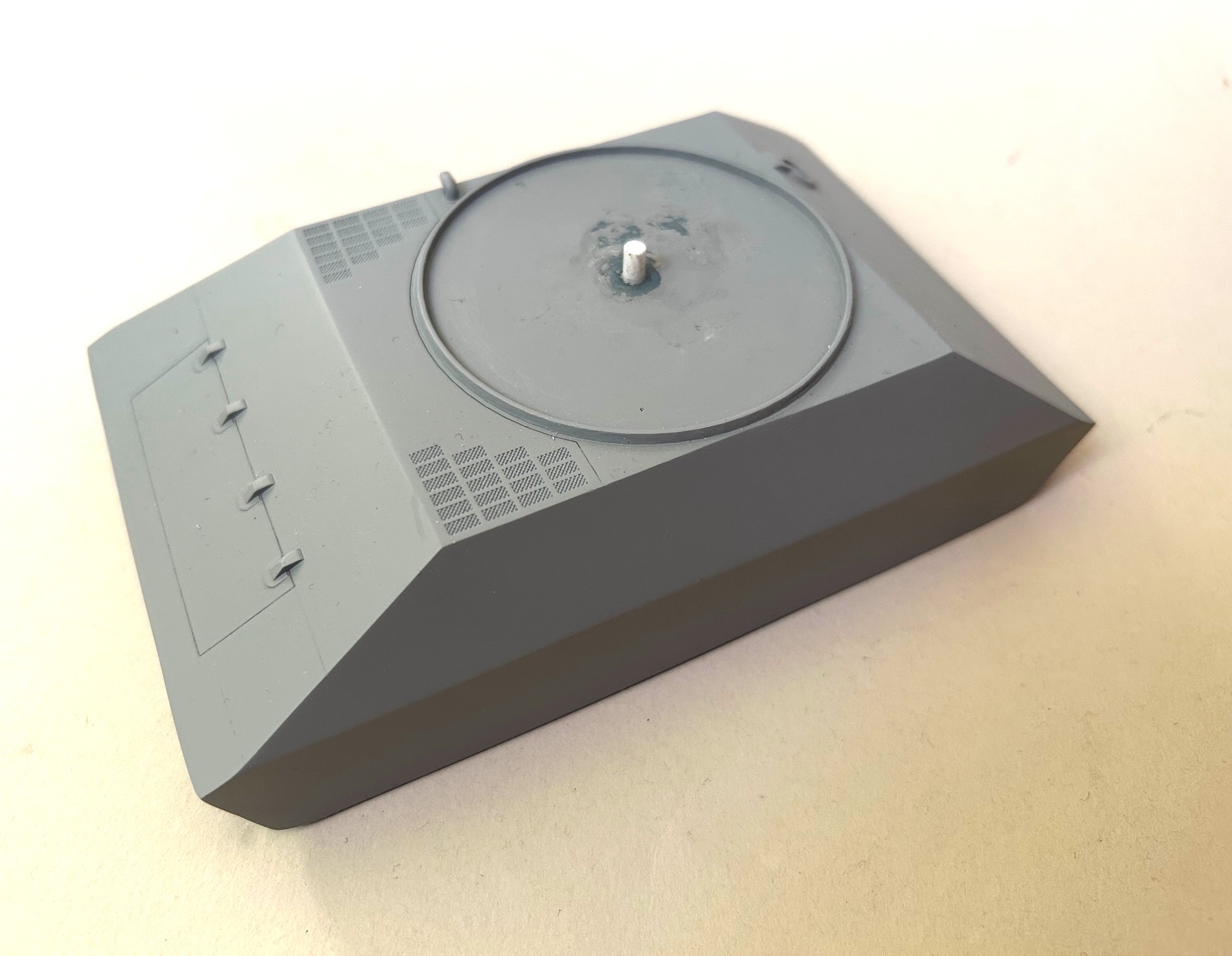 Um das Modell noch etwas ansprechender zu gestalten, habe ich einen Stift unter dem Turm angebracht, eine Querrille am Motorheck entsprechend Vorbild eingraviert und die Zugangsöffnung für den Fahrer sowie die Fahrerluke noch jeweils mit einer runden Plastikscheibe aufgefüttert.