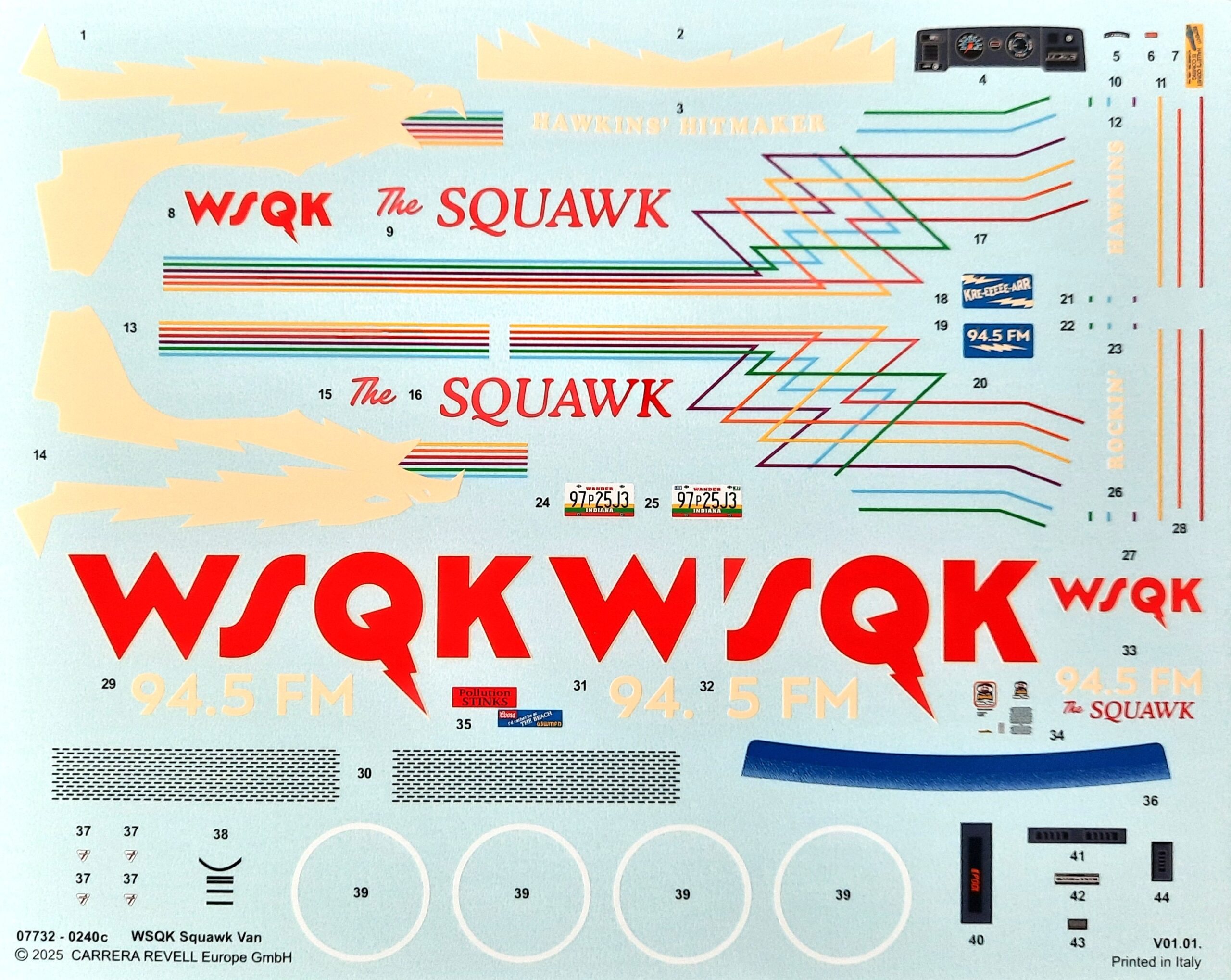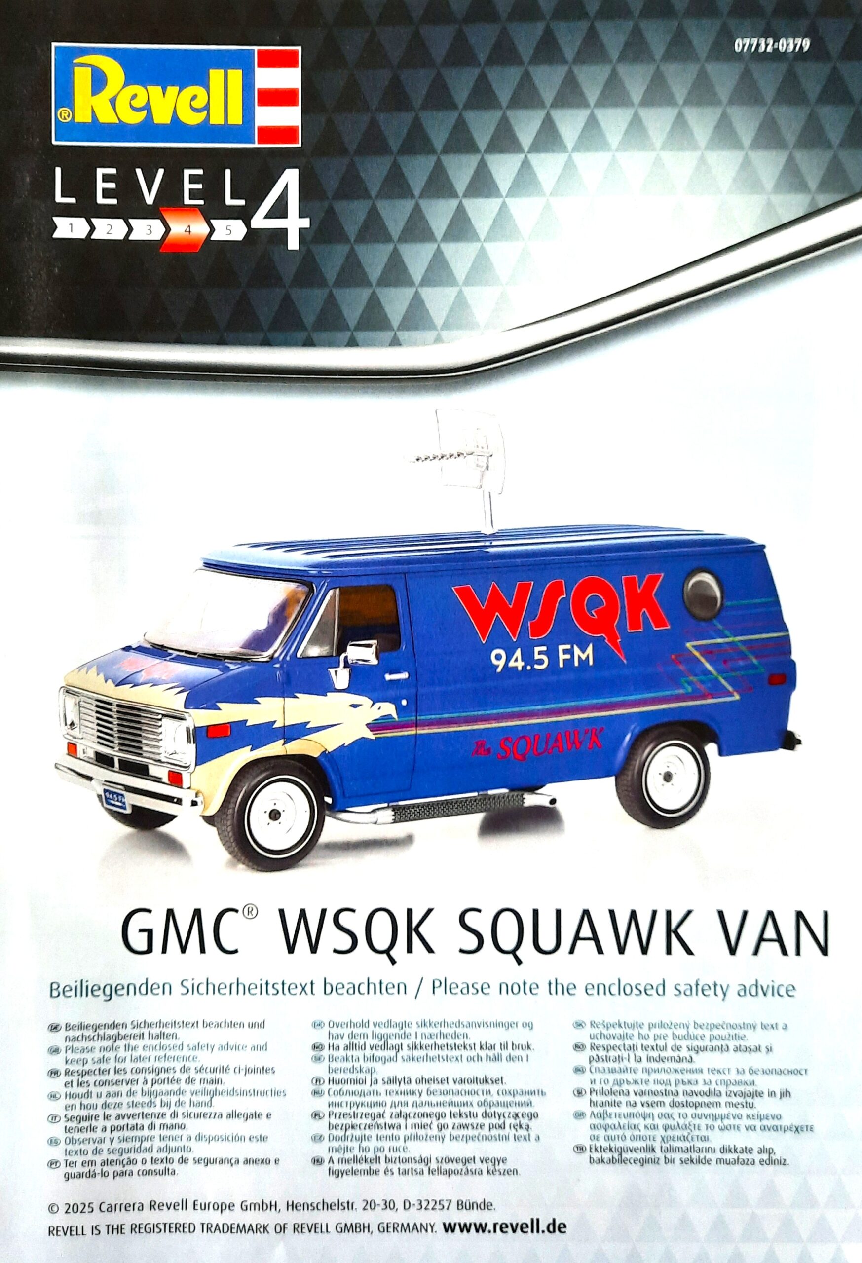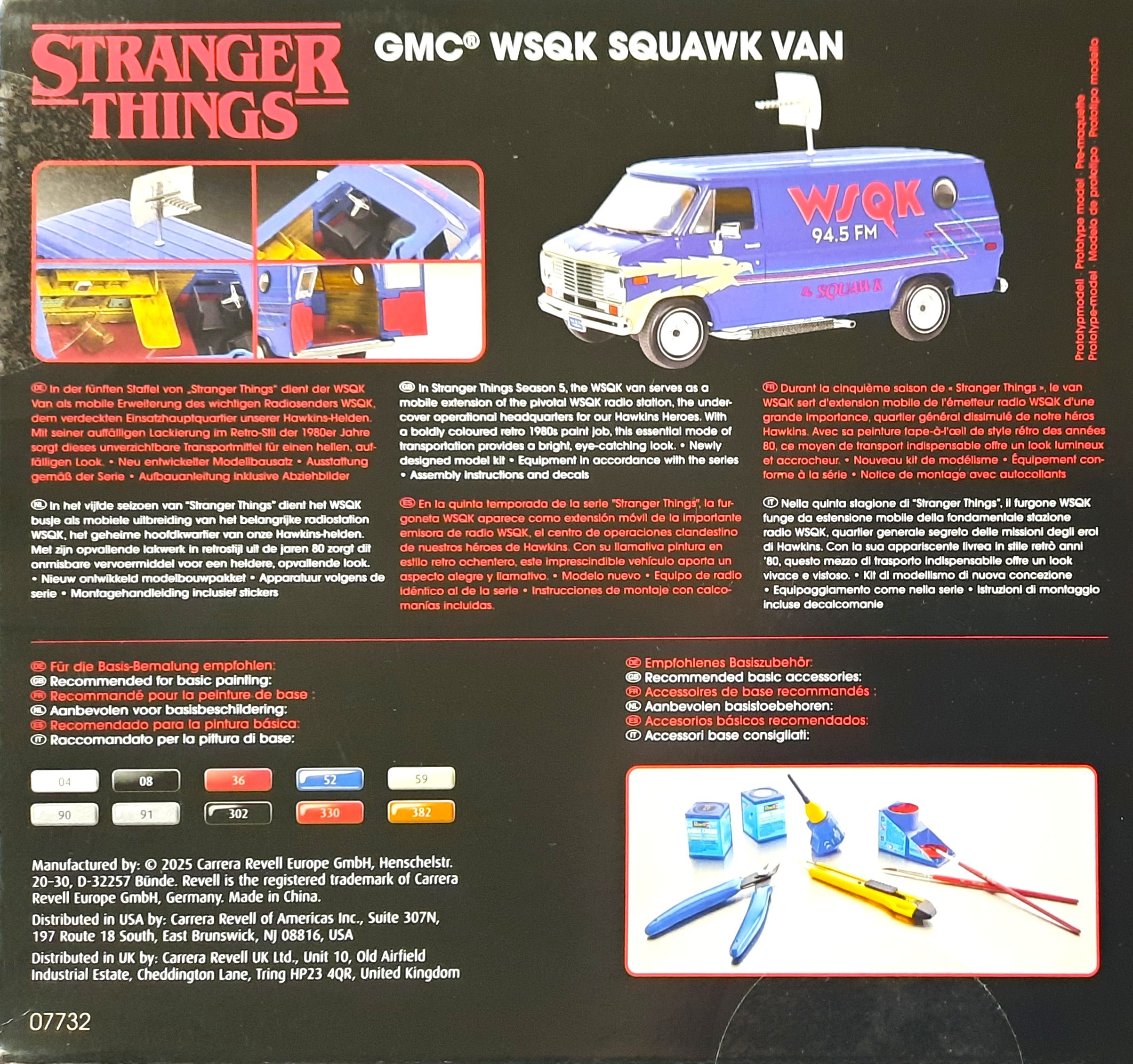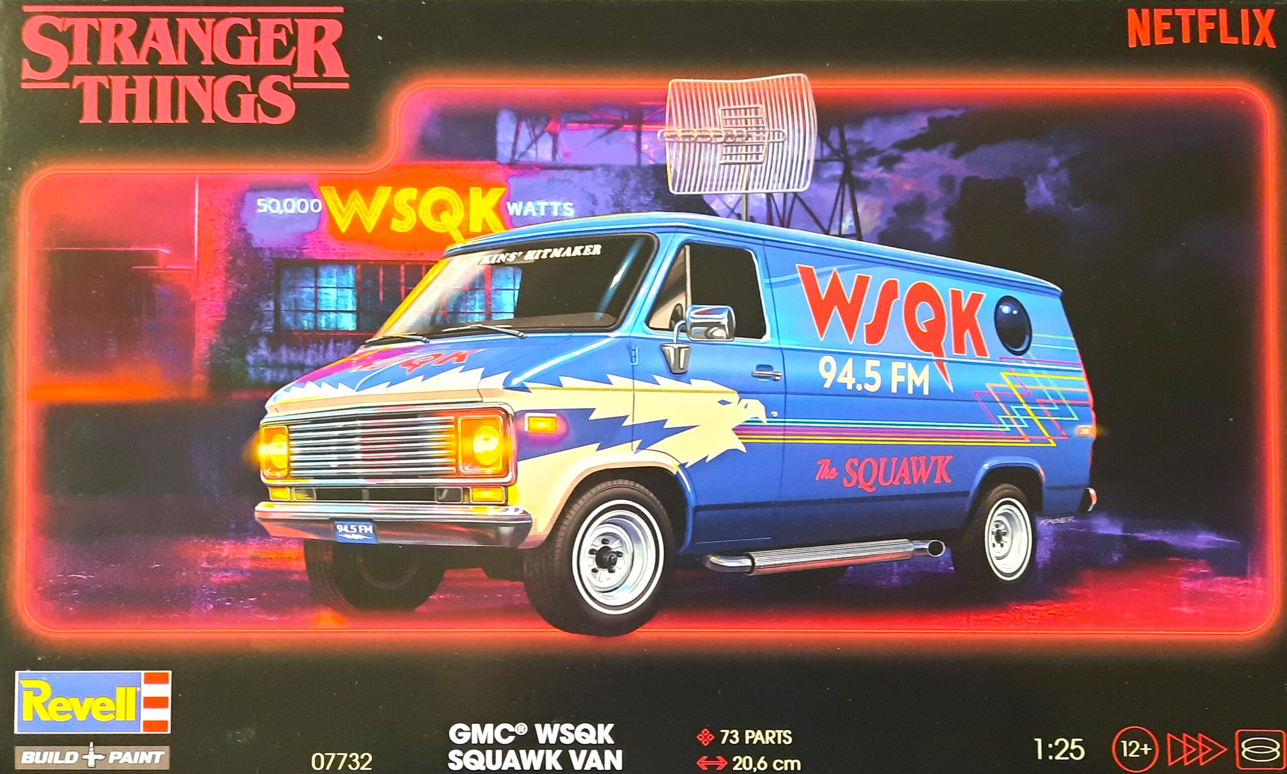 Der Bausatz: Schau an! Hat doch die Firma Revell aus komplett neuen Formen diesen GMC Vandura nicht nur für die amerikanische Science-Fiction-Mysteryserie, sondern auch die Basis für ein Fahrzeug nach „Netflix“ gesorgt. So wird aller Wahrscheinlichkeit mit einem Chevy Van zu rechnen sein, erkennbar durch das Chevrolet-Logo am Chromspritzling. Der Vandura besteht aus ca. 73 Bauteilen, die sich hauptsächlich auf sieben Spritzrahmen verteilen. Dazu kommen eine Karosserie als Einzelteil, 4 Vinylreifen, ein umfangreicher Decalbogen sowie die Bauanleitung. Der Bausatz bietet dem Modellbauer hier die Möglichkeit den Übertragungswagen des lokalen Radiosenders WSQK 94.5 FM des Ortes Hawkins, der als verdecktes Einsatzhauptquartier dient, zu bauen.