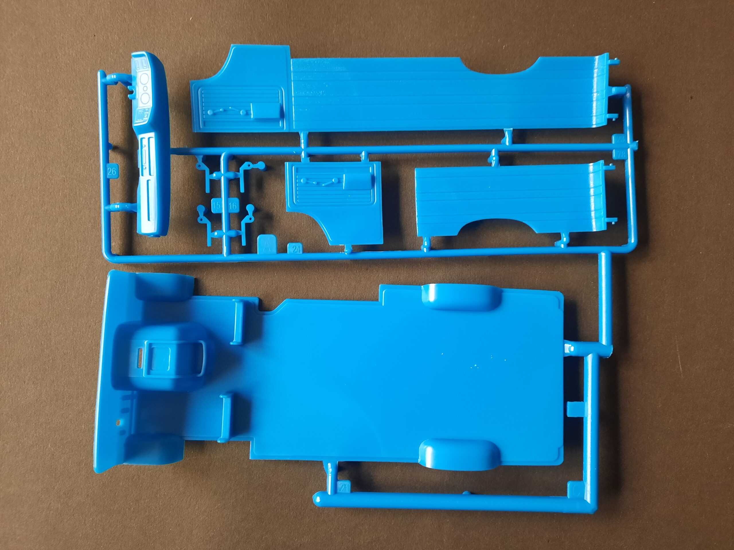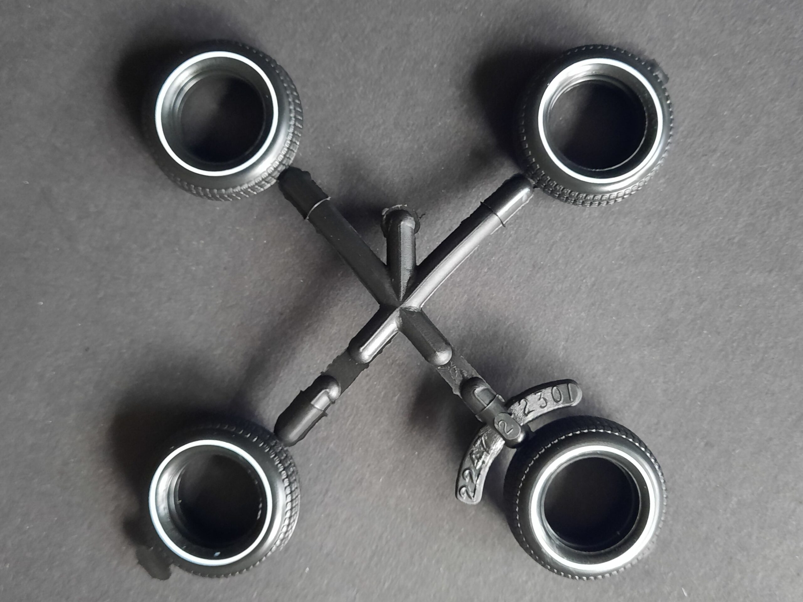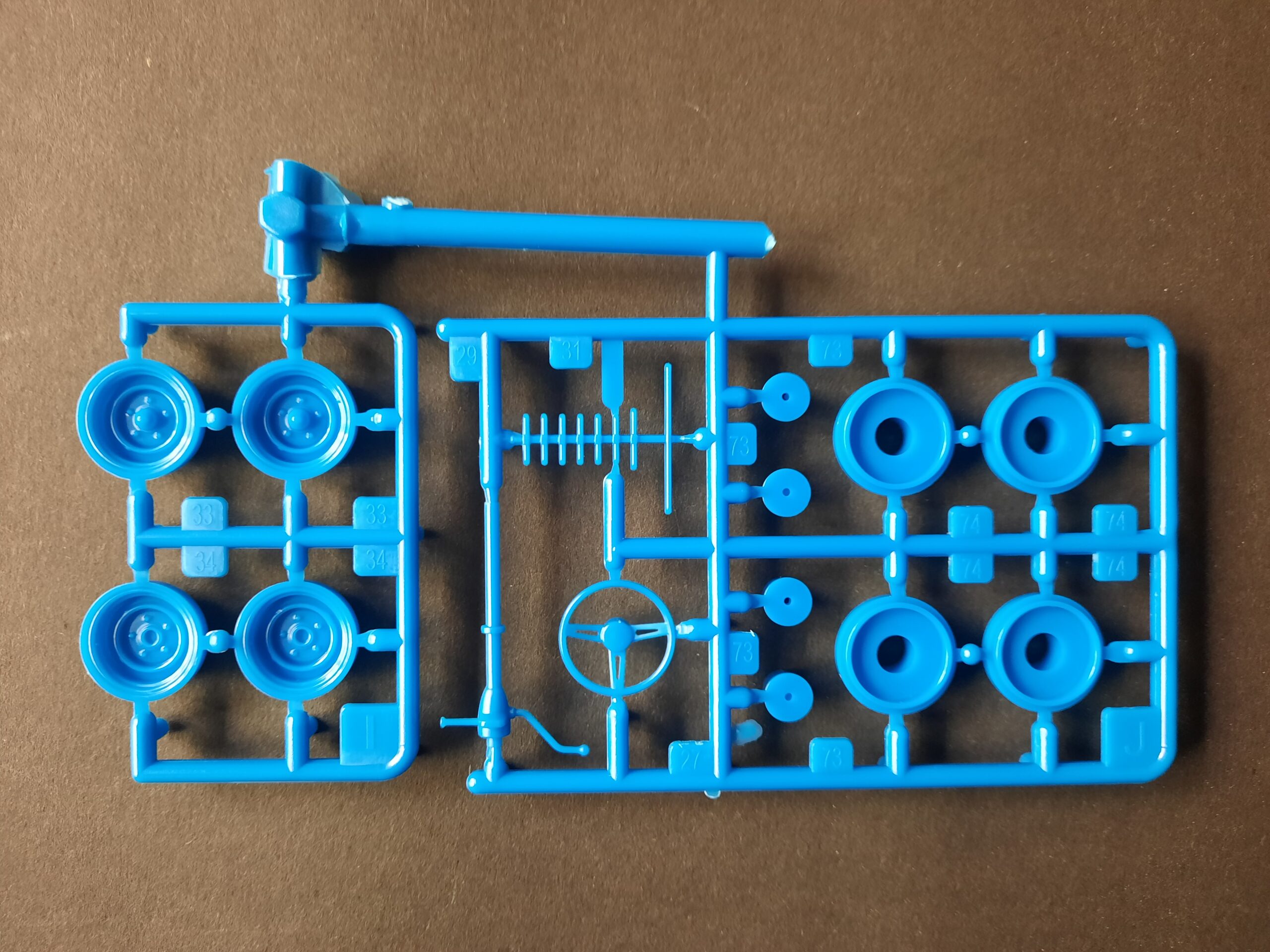 Los geht es gleich mit den Rädern. Hier heißt es schon mal aufpassen. 2 Felgen mit und 2 Felgen ohne Nabenabdeckungen. Wichtig bei der späteren Montage an den Achszapfen in der Baustufe 4. Die Bereifung, aus weichem Vinyl, geht absolut in Ordnung. Reifen mit aufgedruckte Whitelines und anständigem Profil. Die Baustufe 3 beinhaltet lediglich die Lackierung des einfach gehaltenen Wagenbodens. Hier kann man mit entsprechenden Farbaktzenten die Schlichtheit etwas überspielen. Nachdem die Räder in der Folgebaustufe aufgesetzt wurden geht es schon in Richtung Innenraum. Der Innenraumboden wird auf dem Wagenboden verpflanzt. Sitze, Armaturenbrett und Lenkrad werden montiert. Auch hier sollten die Lackierarbeiten abgeschlossen sein, den eine Vielzahl von Decals finden jetzt ihren Platz.