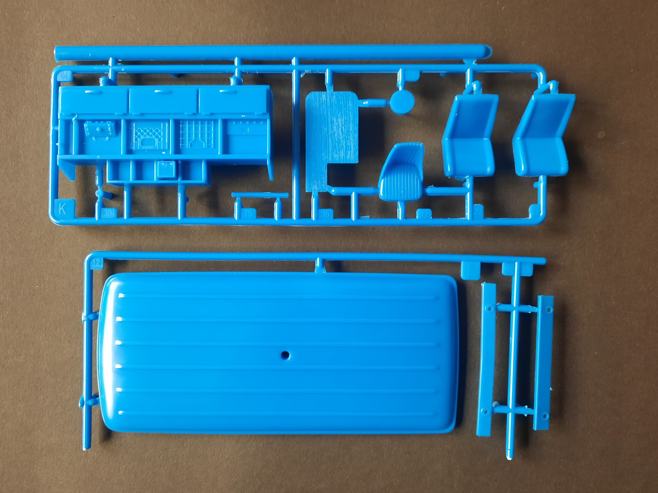 Zu guter Letzt folgen die Montage und Lackierung des Sendestudios. Das Sendeequipment ist rudimentär gehalten, was auch den technischen Stand der 80er Jahre wieder spiegeln soll. Ein Klapptisch und ein Drehstuhl gibt es noch dazu. Das Technikregal weißt innenseitig durch Prägung die Lizenzrechte von Netflix für diese speziellen Innenraumteile auf. Den letzten Schliff erhält das Fahrzeugdach. Es lässt sich abnehmen, gewährt so einen großzügigen Einblick in den Innenraum. Die auf dem Dach aufgepflanzte Antenne als Klarsichtteil ist eher eine kostengünstige Kompromisslösung. Ein Fotoätzteil hätte hier besser gefallen. Bei der allerletzten Baustufe geht es um die auffällige Außenlackierung und Dekorierung des Vandura.
