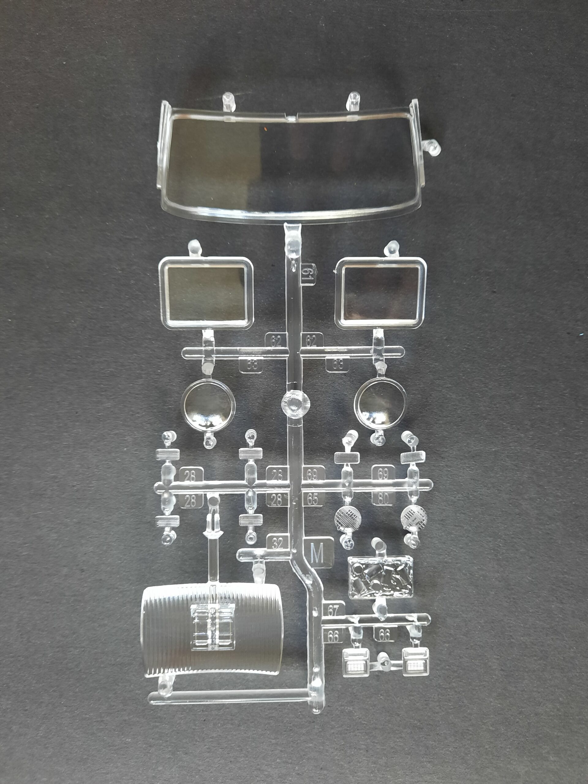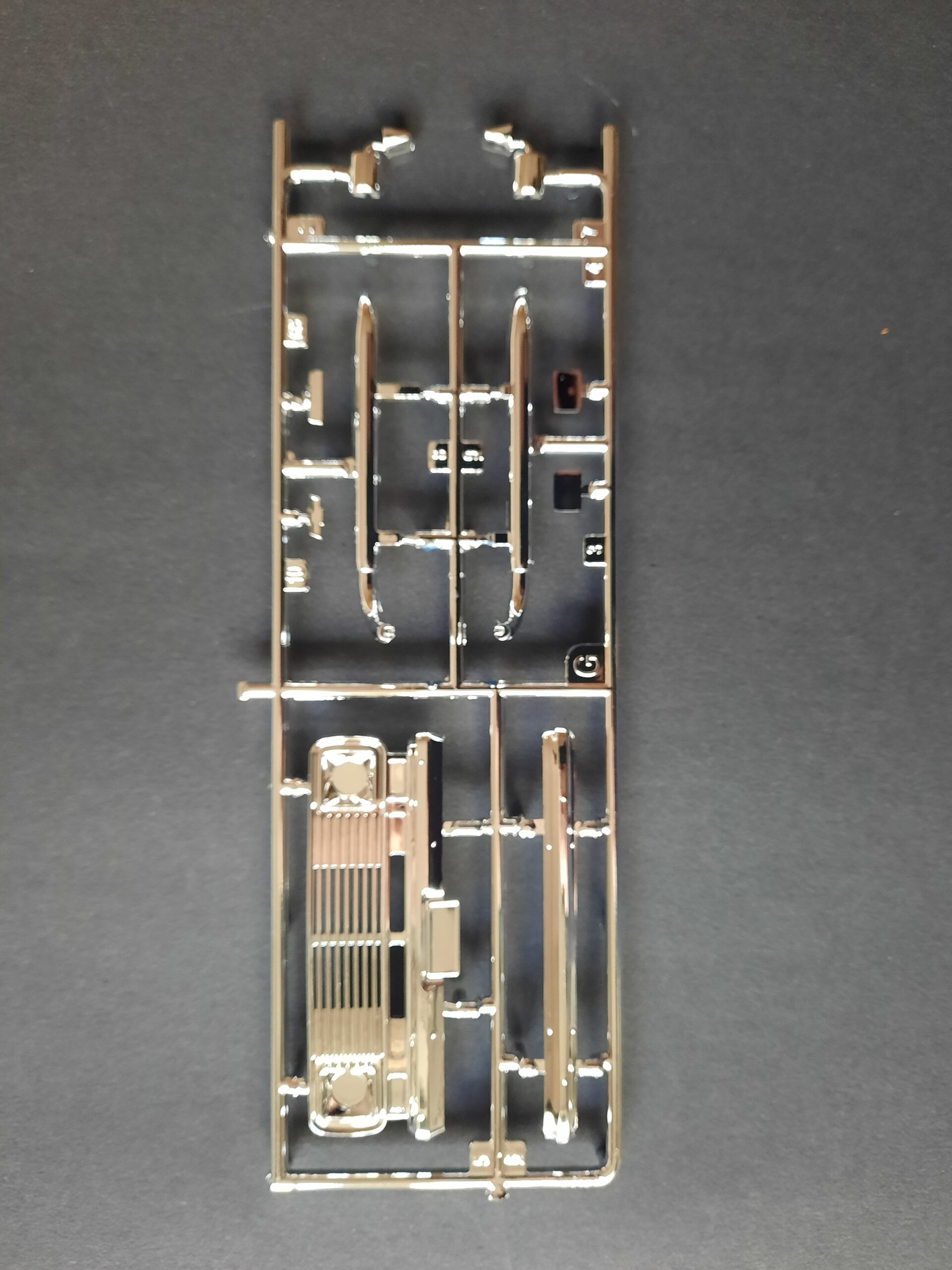Weiter geht es mit der Außenkarosserie. Hier sind erstmal die dicken Angüsse zu entfernen und alles ist gut zu versäubern. Was folgt ist die Montage der Hecktüren sowie der seitlichen Schiebetür. Hier sollte man besonders auf die Passungen achten. Die Hecktürscharniere zum Beispiel sind Bestandteil der Innenraumwände. Also Vorsicht, den Innenraum einmal schief eingeklebt, ergibt garantiert keine zufriedenstellende Schließung bzw. Passung. In dieser Montagephase werden ebenfalls die Scheiben eingeklebt. Da die Materialstärke relativ dick ausfällt, auch bei der Windschutzscheibe, empfiehlt es sich speziell die Hecktürscheiben innen am Rand in schwarz zu lackieren um hässliche Klebespuren zu kaschieren. Die Scheiben waren damals eh mit einer Gummidichtung eingezogen worden und der Wulst außen und innen sichtbar. Nachdem die Schiebetür montiert wurde, werden Außenkarosserie mit dem Fahrgestell verbunden. Die Montage von Kühlergrillgitter, Stoßfänger, Spiegel und die Sidepipes folgt. Alle Teile dazu weisen eine qualitativ sehr gute Verchromung auf.