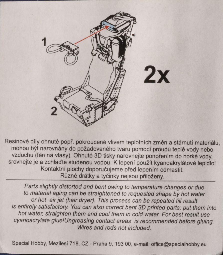 An Alternativen für Martin-Baker-Schleudersitze ist auf dem Zurüst-/Detailsatz-Markt wahrlich kein Mangel. Special Hobby springt jetzt mit diesem kleinen Kit auf den 3D-Bandwagon auf. Die Gestaltung und Detailierung ist sehr gut gelungen, dennoch bleiben zwei Mankos: Das Gurtzeug ist nicht vollständig vorhanden, und zweitens bleibt das alte Probleme der farblichen Gestaltung der Auslösegriffe mit ihrer spiralförmigen Farbgebung in Schwarz und Gelb. Drei Möglichketen (minimum): Handbemalung, farbige Ätzteile aus anderer Quelle, oder gezwirbelte Fäden aus dem Kurzwarenhandel.
