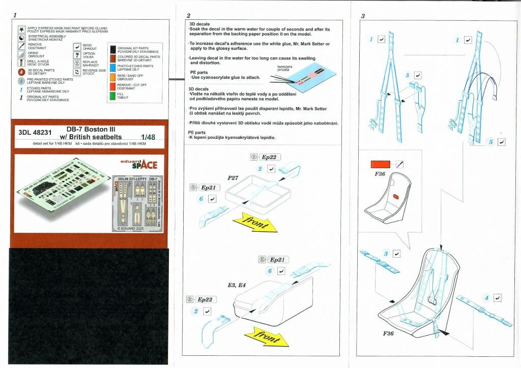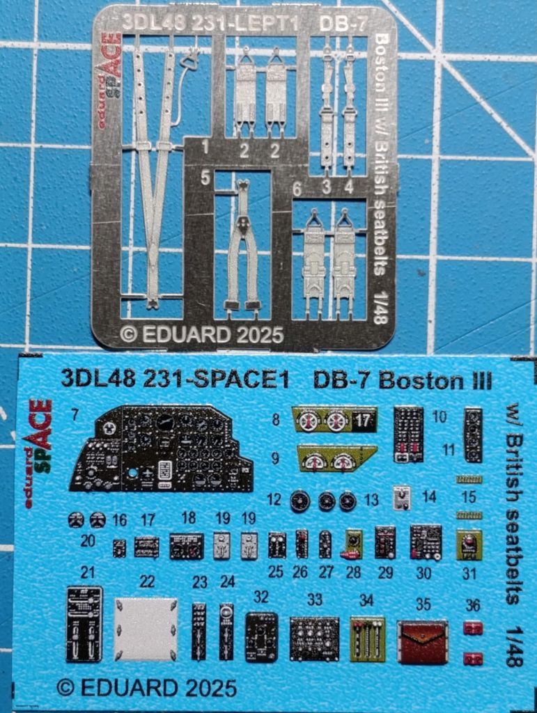 Die im Jahr 2025 erschienene Douglas DB-7 / Boston III dürfte die altehrwürdige Boston/Havoc von AMT (auch als Italeri und Revell Rebox) endgültig ablösen. Der Bausatz von HongKong Models ist zwar doppelt bis drei Mal so teuer, aber auch entsprechend besser, so meinen viele Modellbauer. Eduard bietet jetzt Innendetails mit jeweils spezifischen US bzw. britischen Sitzgurten an. Die Instrumente in Form von 3D-Decals sind in beiden Sätzen identisch. Für die Montage empfehlen wir Weißleim.