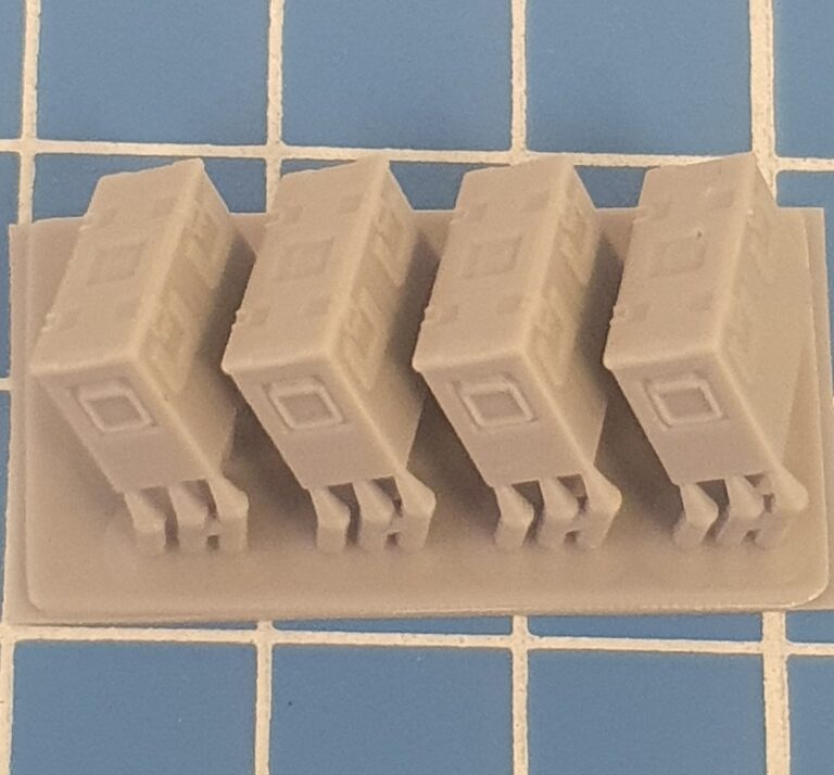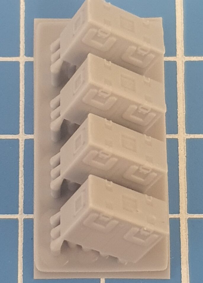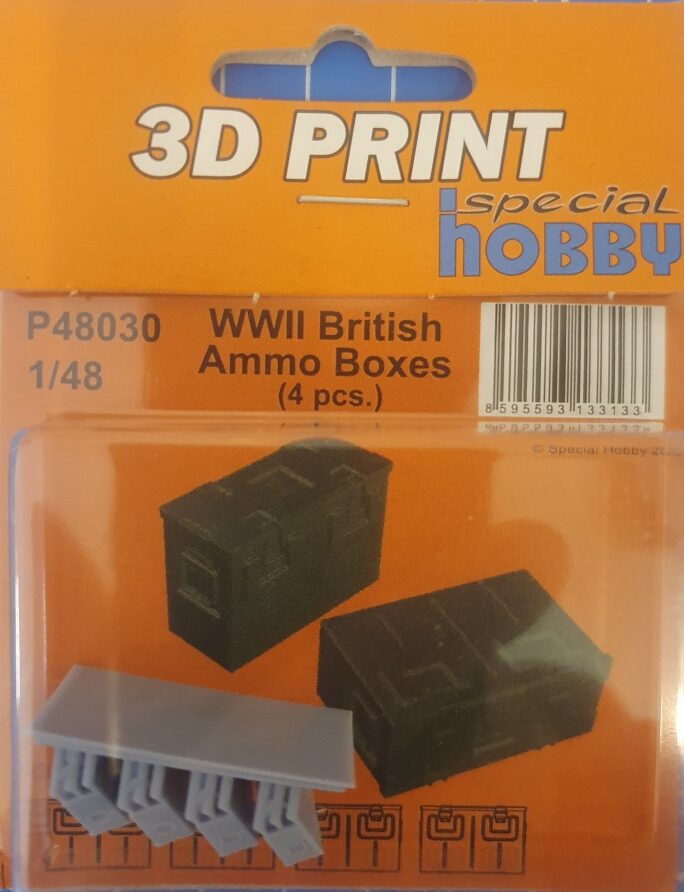 Set: Das vorliegende 3D-gedruckte Set aus vier grauen Teilen zeigt vier britische B166-Munitionskisten, die noch von den Andrucken zu lösen sind. Sie sind sauber gedruckt ohne Schichtlinien und zeigen die Tragegriffe und Stabilisierungssicken des Vorbildes sehr gut. Hinweise zur Bemalung fehlen, die meisten Kisten waren aber wohl in Oliv- oder Brauntönen lackiert, hier muss man sich nach Vorbildfotos richten.