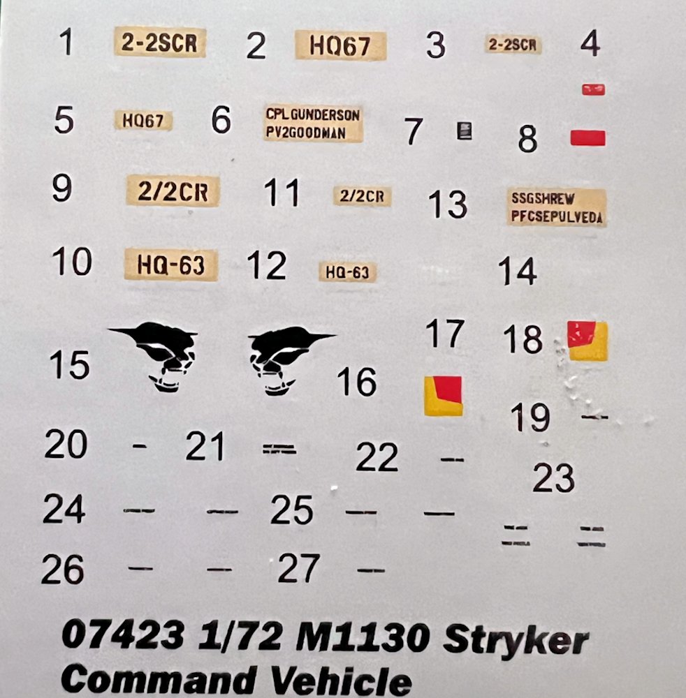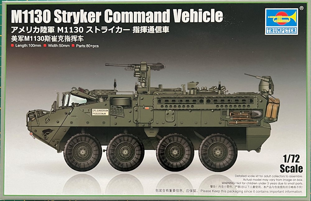 Geschichte: Der Stryker ist ein vierachsiger Radschützenpanzer der U.S.Army und beruht auf dem8x8-Chassis des Piranha III von Mowag. Er wurde im Jahr 2002 eingeführt. Das Command Vehicle (CV) ist ein Fahrzeug, mit dessen Ausrüstung für die Brigade die gesammelten Informationen ausgewertet und von dem aus die Stryker im Einsatz befehligt werden. Zur Selbstverteidigung ist eine Protector M151 Waffenstation vorhanden. Das Gefechtsgewicht ohne Käfig beträgt ungefähr 19 Tonnen. (Wikipedia)