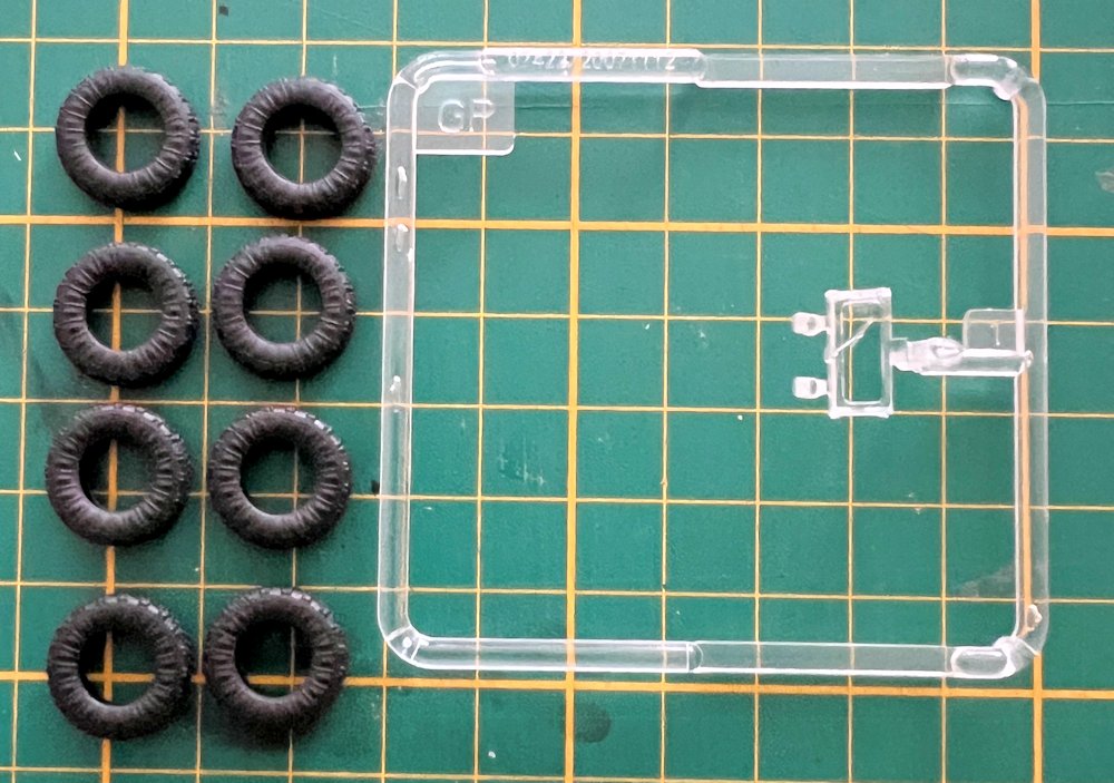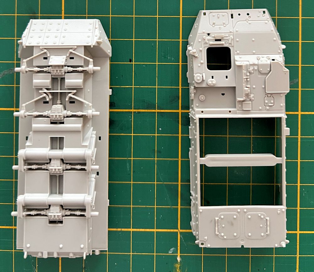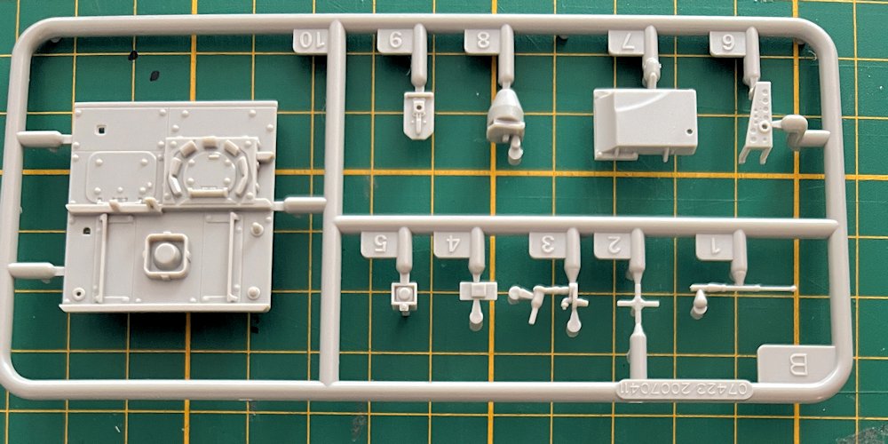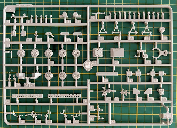 Bausatz: In dem für Trumpeter üblichen Stülpkarton befinden sich ein großer und ein kleiner hellgrauer Gießast, acht Gummireifen, die Ober- sowie die Unterwanne als Einzelteil. Darüber hinaus ist auch ein kleiner Ast mit einem Klarsichtteil enthalten. Auf die Gießäste verteilen sich 84 sauber und gut detailliert wiedergegebene Teile. Es gibt ein paar Fischhäute, die man entfernen muss. Die Auswurfmarken sind so verteilt, dass sie nicht stören. Auch sind einige kleine Teile sehr dick angegossen, da sollte man beim Heraustrennen Vorsicht walten lassen.