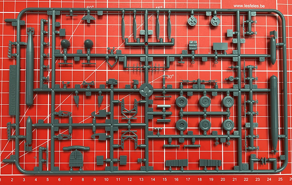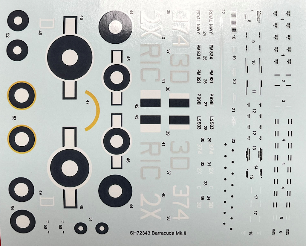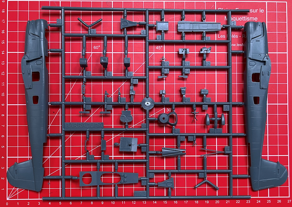 Bausatz: Special Hobby hat hiermit eine Wiederauflage des Bausatzes von 2018 in 1/72 herausgebracht. So gibt es hiermit die Fairey Barracuda Mk. II in der „Pacific Fleet“-Variante. Auf dem Bausatzcover ist nun die Bausatznummer weiß gedruckt. In dem praktischen Stülpkarton befinden sich gut verpackt drei hellgraue Spritzgussrahmen mit 130 Einzelteile, zwei Klarsichtrahmen mit 16 Teilen, ein Decalbogen und die mehrfarbige Bau- und Bemalungsanleitung. Ein paar Teile sind für andere Versionen und wandern in die Restkiste.