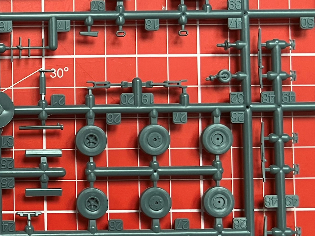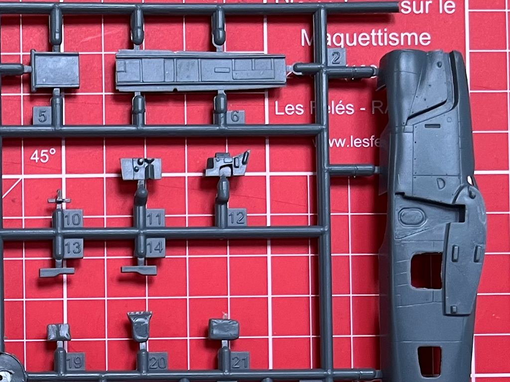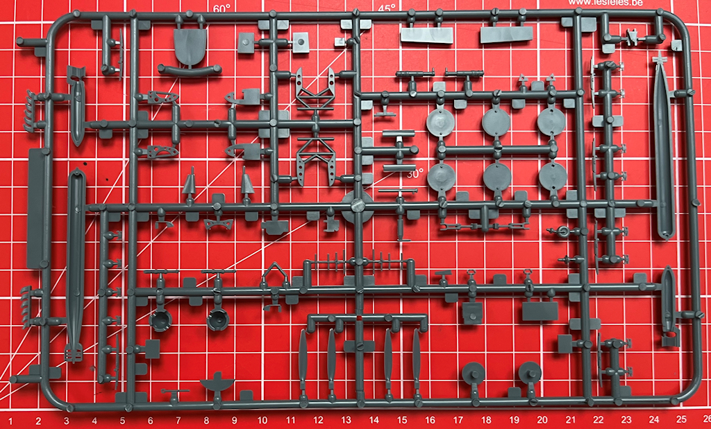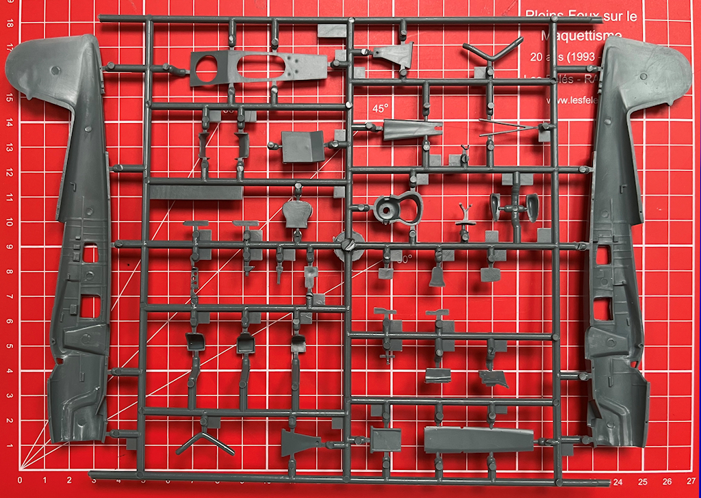 Alle grauen Spritzgussteile sind 2016 total neu entwickelt worden. Hier passt kein Teil aus einem alten Bausatz aus den 2000er Jahren! Das ist gut so. Dieser zeitgemäße Bausatz stammt aus einer Stahlform. Unterschiede zur 2018er Auflage konnte ich nicht finden. Es gibt scharfe Konturen und feine versenkte Strukturen. Die Detaillierung ist noch immer voll auf der Höhe der Zeit. Es gibt keine Resin- oder Fotoätzteile. Letztere vermisst man allerdings bei den Sitzgurten, denn auch als Decal sind sie leider immer noch nicht vorhanden. Schade!