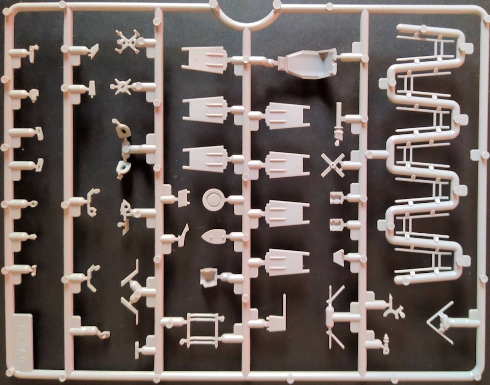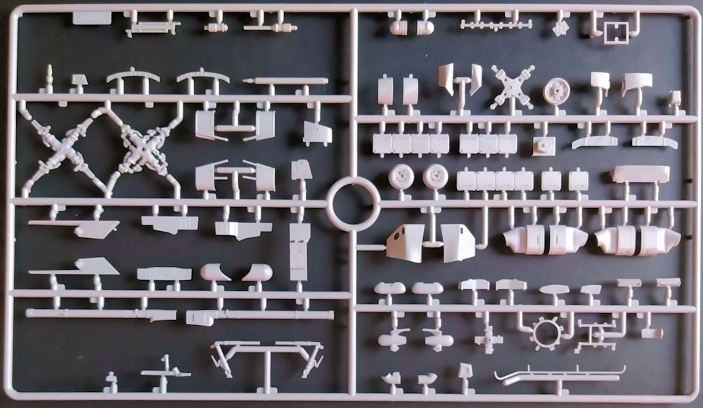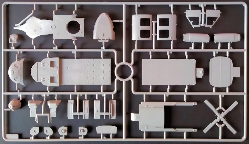 Die Verpackung entspricht dem von ICM gewohnten Standard: über einen stabilen Karton ist ein farbiger Deckel gestülpt. Im Karton ist ausreichend Platz, da hätte auch noch fast ein zweiter Bausatz darin Platz. Abgebrochene Teile durch eine zu enge Verpackung sind daher nicht zu befürchten. Sechs graue Gussrahmen sind gemeinsam in einer ebenfalls wieder verschließbaren Tüte verpackt. Insgesamt gilt es 302 Teile zu verbauen.