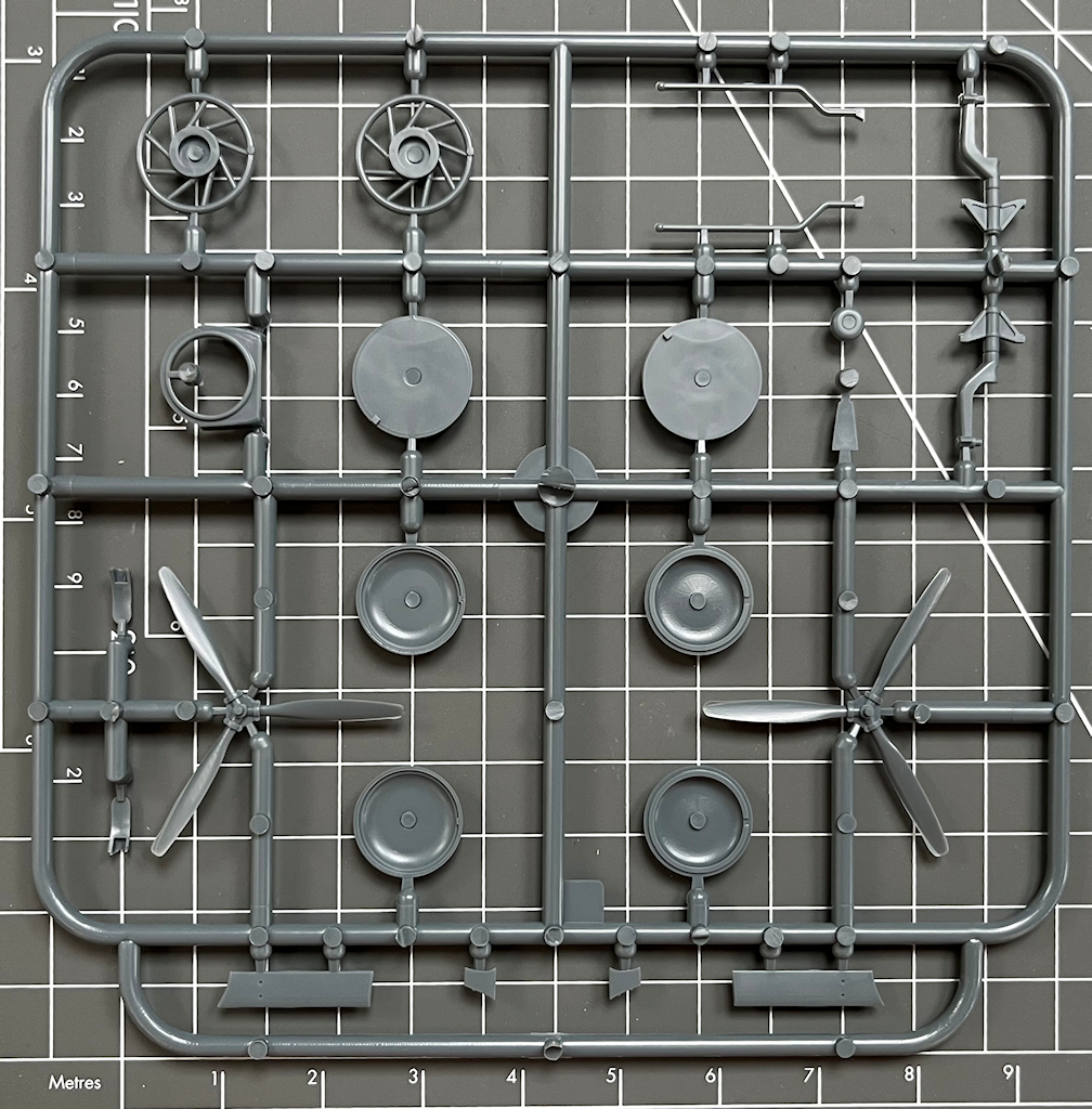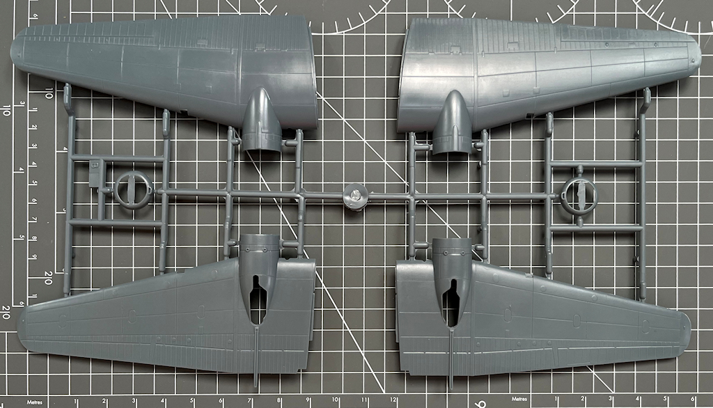 Das Seitenleitwerk ist ein einziges Teil, und bei der linken und rechten Hälfte des Höhenleitwerks ist es auch so. Dadurch gibt es scharfe Hinterkanten. Die beiden Sternmotoren bestehen aus jeweils einem Spritzgussteil. Das geht auch in Ordnung. Wer es besser möchte, der findet bei diversen Herstellern detailliertere Wright Cyclone R-1820 in 1/72…