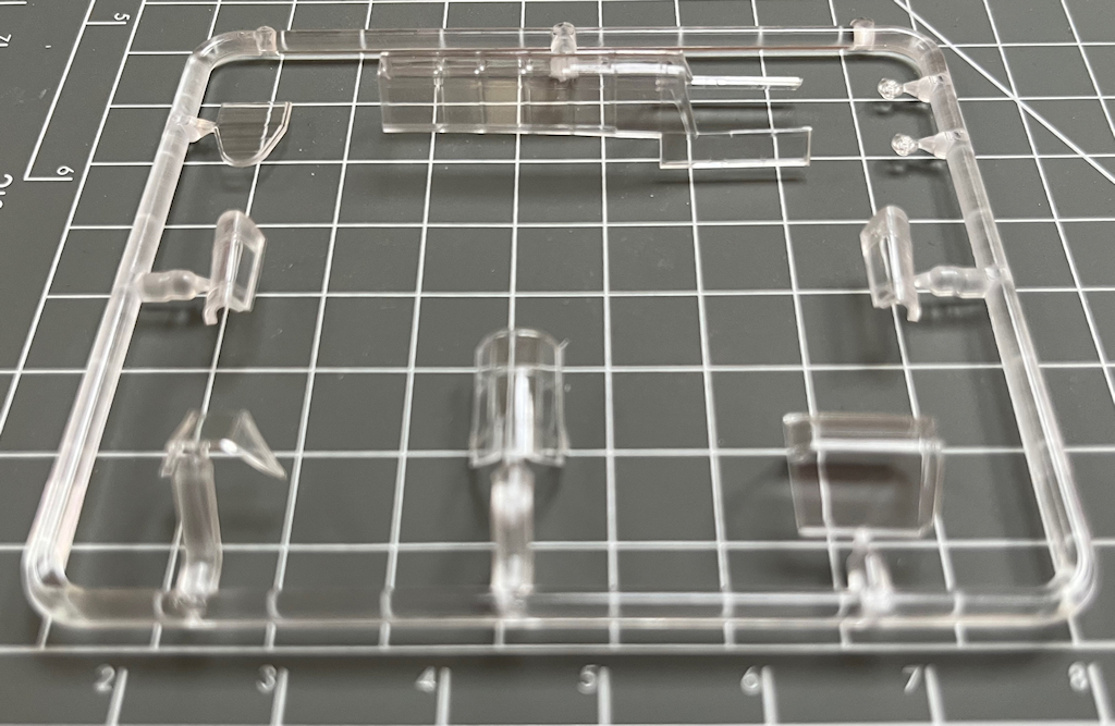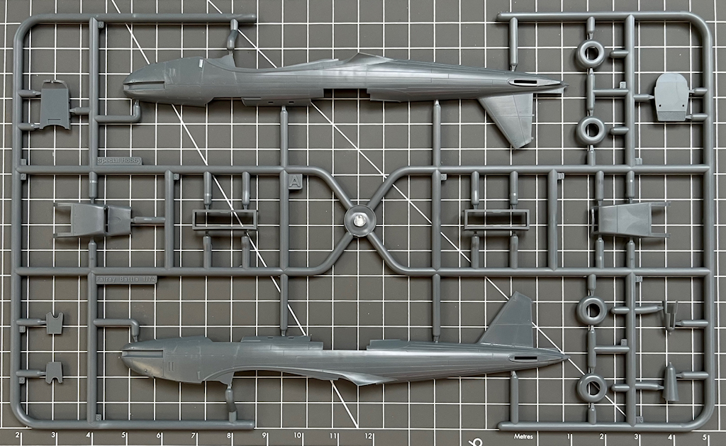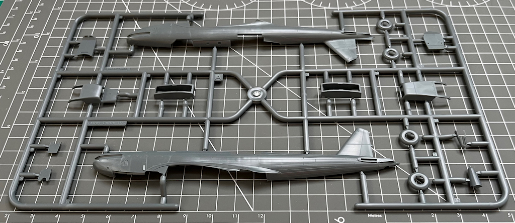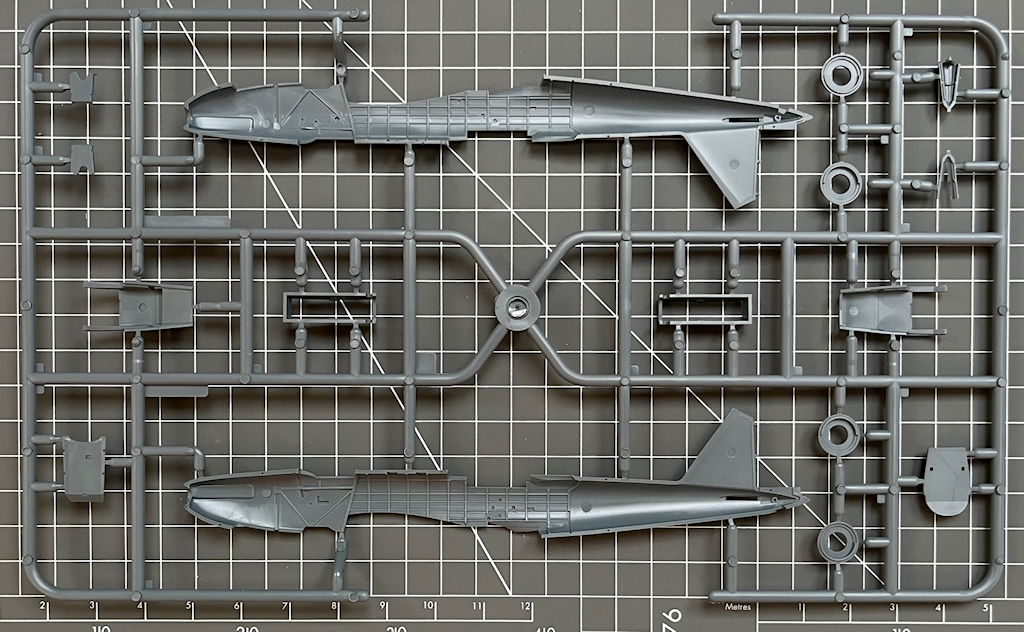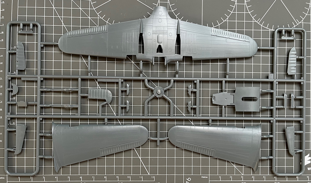 In dem praktischen Stülpkarton befinden sich gut verpackt drei graue Spritzlinge mit insgesamt 120 Teilen, ein klarer Spritzling mit neun Teilen, ein Decalbogen sowie die mehrfarbige Bau- und Bemalungsanleitung. Die Abspritzung der Teile ist tadellos. Manche Angüsse sind extrem fein. Einige Teile sind für andere Varianten gedacht und wandern in die Restekiste.