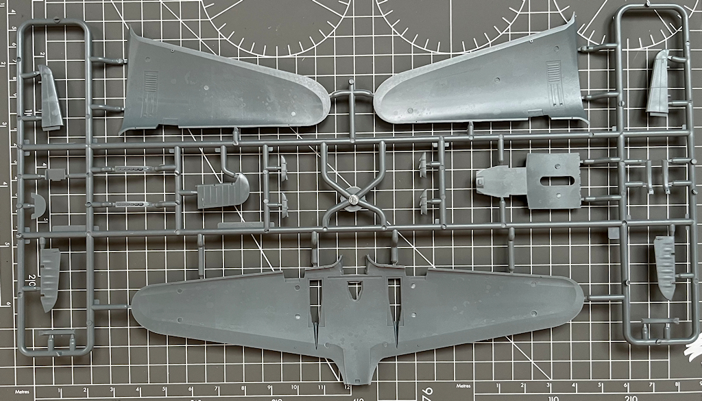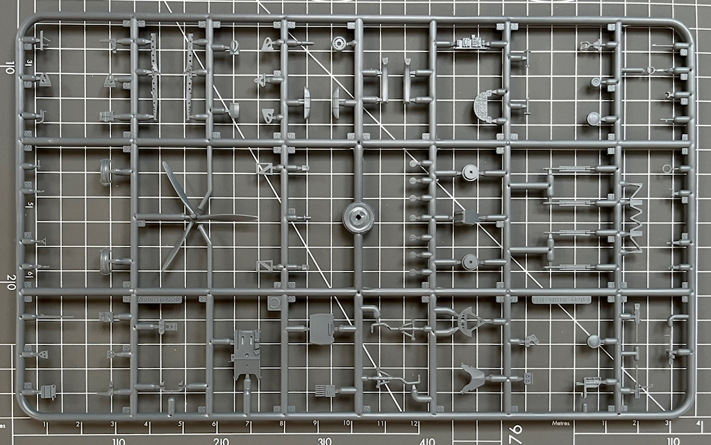 Der detaillierte Rumpfkühler verschwindet unter dessen Verkleidung. Das Abwehr-MG ist einteilig und ordentlich detailliert. Mehr geht in Spritzguss kaum. Die Hauptfahrwerksräder entstehen aus jeweils vier Teilen. Man hat die Schutzbleche recht filigran abgebildet. Die Klarsichtteile verdienen diesen Namen auch. So kann das Pilotencockpit offen gezeigt werden. Das gilt auch für den Bordschützen.