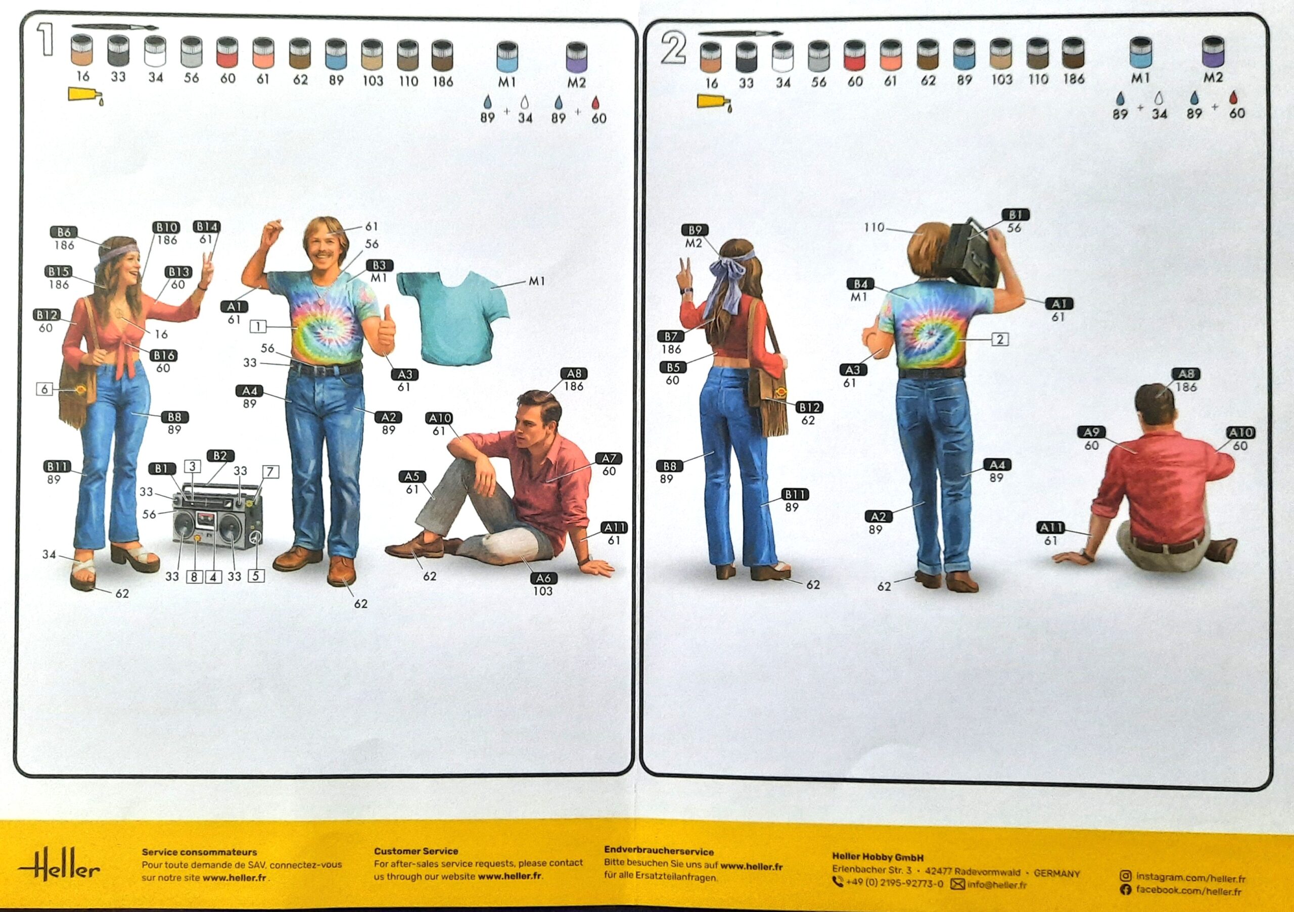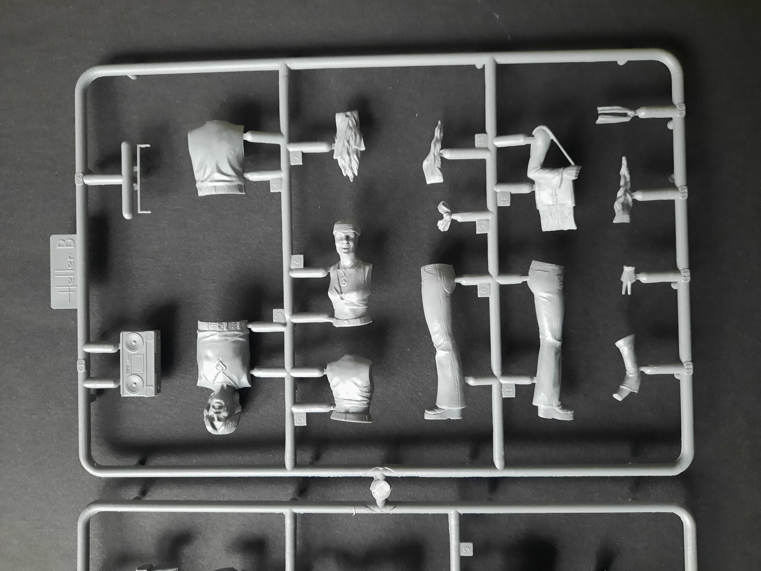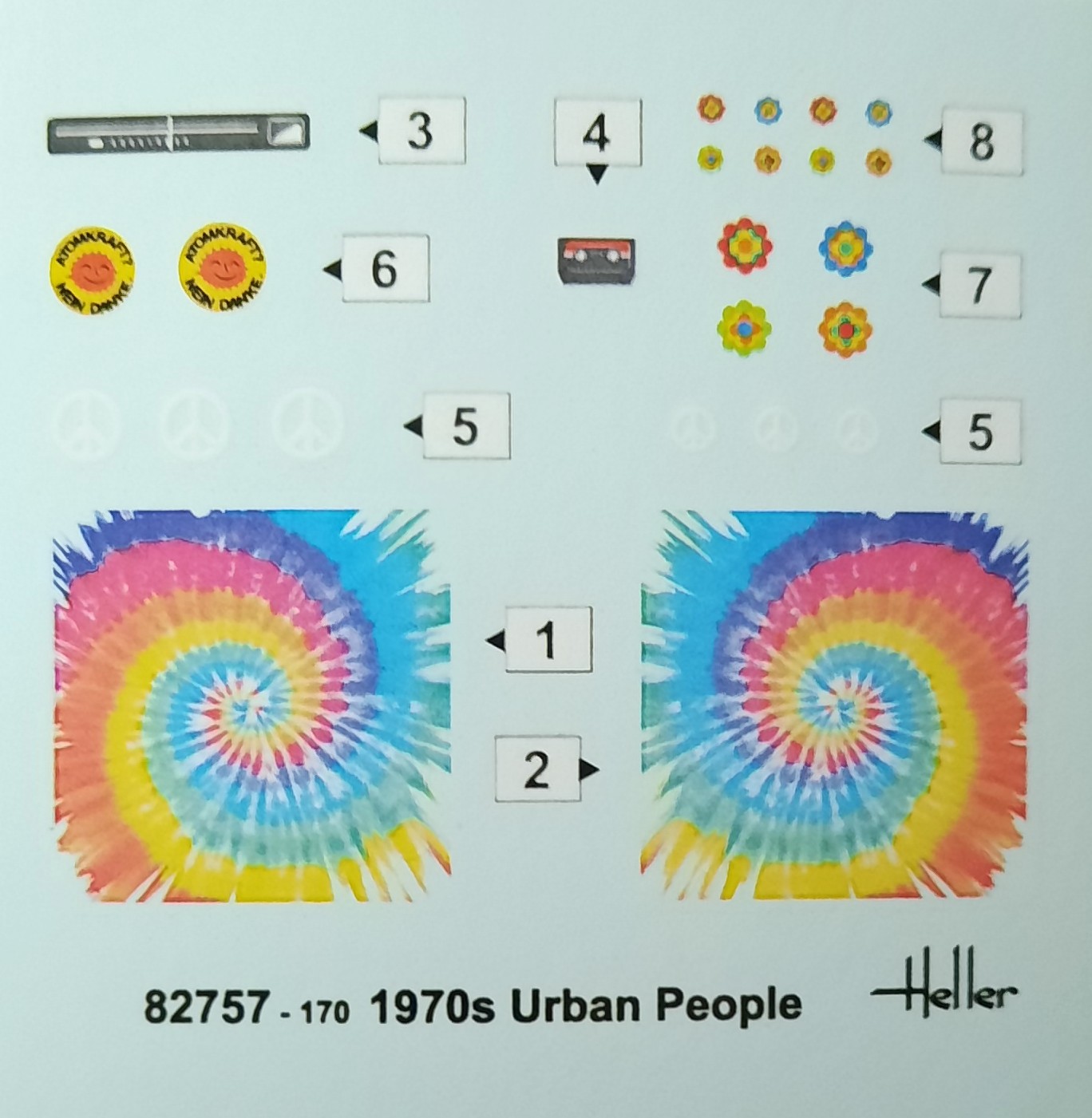Der Figurenbausatz besteht aus einem einzigen Spritzrahmen. Saubere Gravuren ohne lästige Fischhäute erleichtern die Montage. Die Figuren selbst bestehen aus mehreren Einzelteilen. Die Gesichter fallen in Qualität und Mimik absolut topp aus. Die getragene Bekleidung dieses Trios lässt sich zeitlich in die End 60er bis weit in die 70er Jahre einordnen. Das Auftreten des Mädels ist absolut authentisch. Schuhwerk in Plateauausführung, Stirnband, Halskette mit Peace-Zeichen und die Finger in entsprechender Position. Nicht minder authentisch der Musikfreund mit seinem Kassettenrecorder, „Good Vibrations“ von den Beach Boys hörend. Um sein Batic-Shirt und seinen Recorder richtig in Szene zu setzen, gibt es noch die passenden Decals. Dem sitzenden Zeitgenossen scheint es nach seinem Gesichtsausdruck eher schlecht zu gehen. Hat er etwa eine „Tüte“ zuviel geraucht? Der beiliegende Decalsatz beinhaltet außerdem noch ein paar „Pril-Blumen“ und „Atomkraft -nein danke“ Aufkleber, die eher für ein in Szene gesetztes Fahrzeug bestimmt sind.