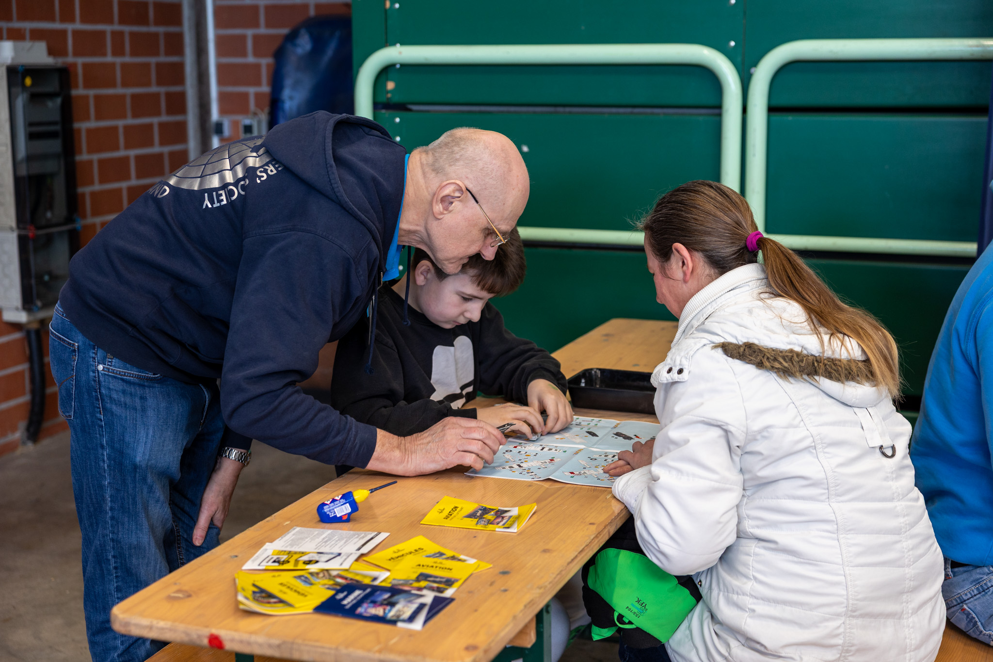 Zwölf Mann Standbesatzung harrten am Samstag der Dinge die da kommen sollten. Das ungemütliche Wetter bremste zwar den Besucherstrom etwas aus, hinderte jedoch weitere Mitglieder nicht daran, die interessierte Masse zu verstärken. Da blieb mehr Zeit für Basteln am Tisch und Besichtigung der anderen Stände. Die Hoffnung auf einen nicht nur sonnigen Sonntag bestätigte sich, es kamen mehr Besucher.