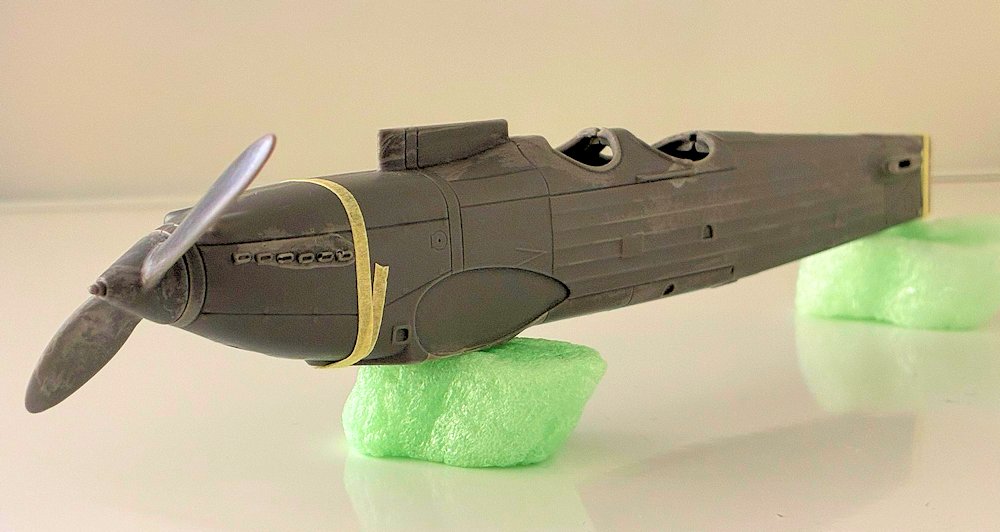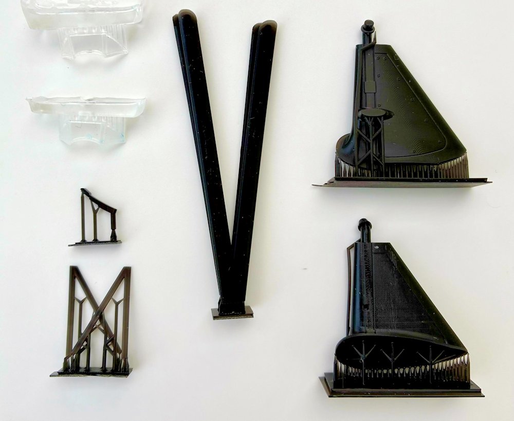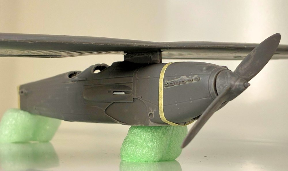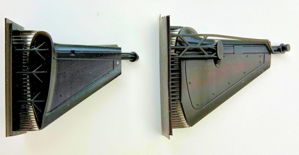 Die kleineren Teile aus dem 3D-Drucker sind in unterschiedlicher Qualität. Cockpit, Kühler und Bewaffnung überzeugen. Andere Teile müssen etwas nachbearbeitet werden, da die Schichten sichtbar sind. Dazu gehören die beiden Kanzelfenster, Verstrebung und das Fahrwerk.