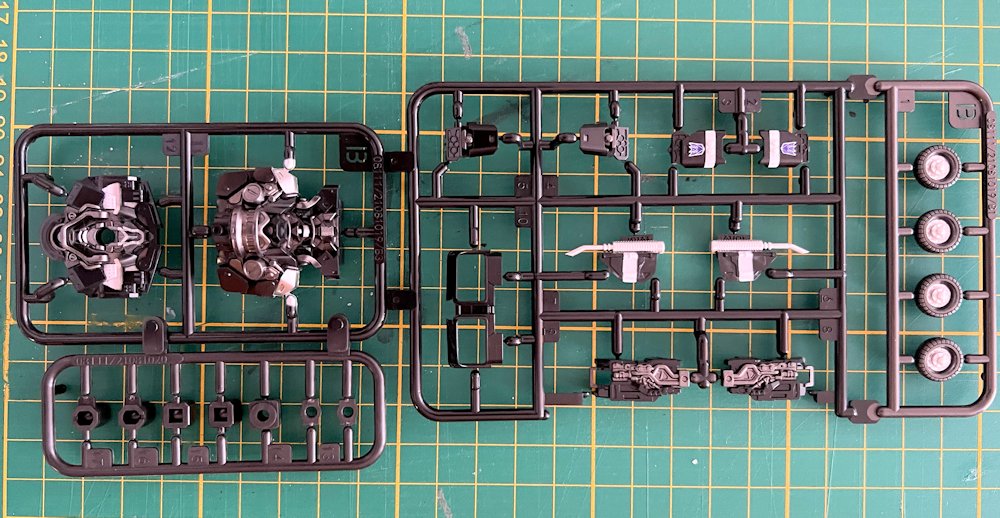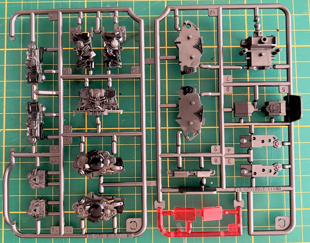 In dem schön gestalteten Karton befinden 103 Bauteile, verteilt auf zwölf Gießäste – einen klaren roten und elf schwarze Äste mit farblichen Details. Dazu gibt es eine schwarze Base. Ein kleiner weißer Gießast ist aus Weichplaste. Daran befinden sich Teile der Schultergelenke. Darüber hinaus enthält der Bausatz ein paar Bauoptionen, wie z.B. verschiedene Waffen und Köpfe.