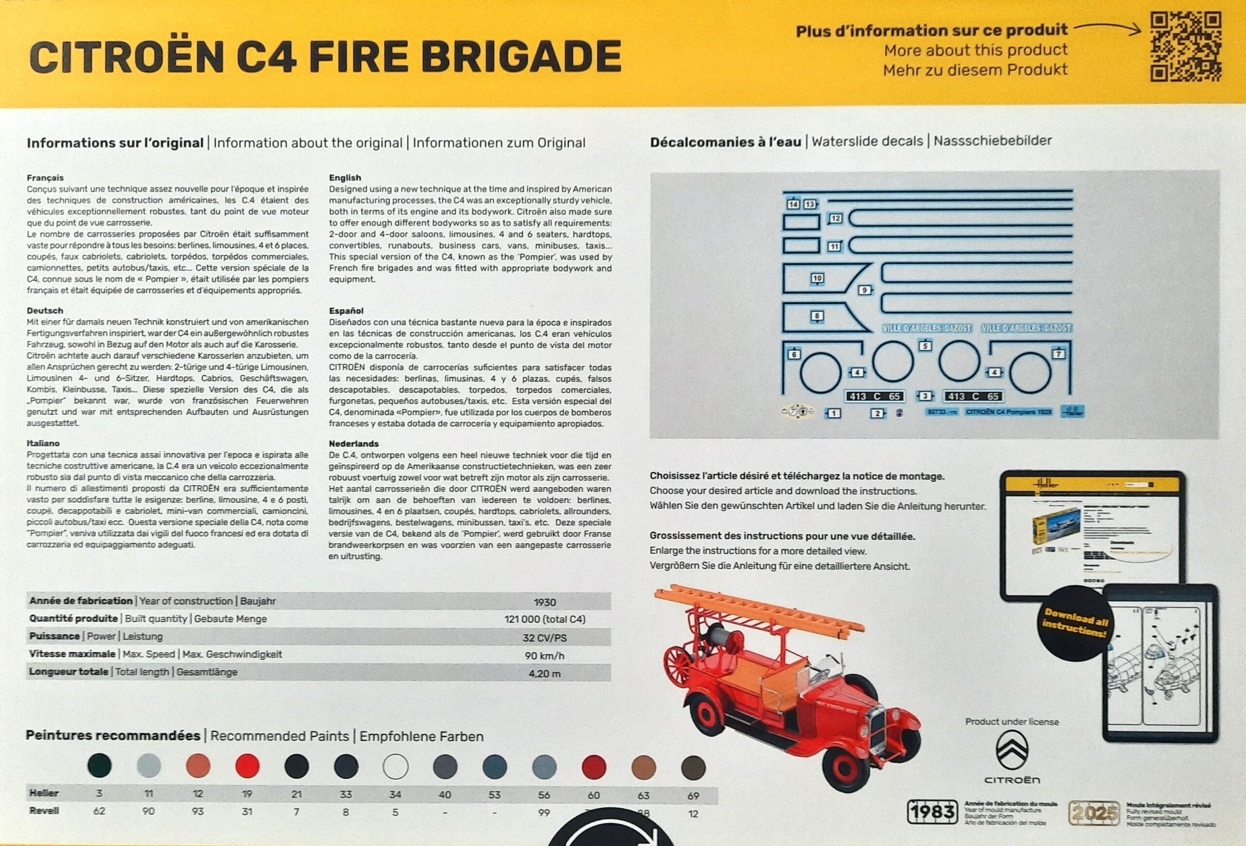 Original: Die Produktion des C4 in seinen verschiedenen Ausführungen begann 1928 und dauerte bis 1932, wobei 1933 noch einige wenige sogenannte „End-of-Series“-Fahrzeuge verkauft wurden. Er hatte in seinem ersten Jahr eine Steuerleistung von 9 PS, die 1930 ohne Modifikation auf 10 PS anstieg, bevor sie 1931 wieder auf 9 PS gesenkt wurde. 1933, zeitgleichmit dem C41X und immer noch mit einer steuerpflichtigen Leistung von 9 PS, kam der C4G auf den Markt, mit 10 PS, etwas größerem Hubraum und wahlweise mit Standard- oder dem schwimmend gelagerten Motor, der auch in der nachfolgenden Serie zu finden war. Mit einer damals neuen Technik konstruiert und von amerikanischen Fertigungsverfahren inspiriert, war der C4 sowohl in Bezug auf den Motor, als auch auf die Karosserie, ein außergewöhnlich robustes Fahrzeug. Citroën achtete auch darauf, verschieden Karosserien anzubieten, um allen Ansprüchen gerecht zu werden: 2-türige und 4-türige Limousinen, Limousinen 4- und 6-Sitzer, Hardtops, Cabriolets, Kombis, Kleintransporter, Kleinbusse, Taxi usw. Das von Heller angebotene Modell des Citroën C4 der Feuerwehr Argelès-Gazost wurde ab 1930 eingesetzt. Diese spezielle Version des C4, die als Pompier bekannt war, wurde von französischen Feuerwehren genutzt und war mit entsprechenden Aufbauten und Ausrüstungen ausgestattet. Er basierte auf dem regulären Citroën C4 Fahrgestell.  (Heller)