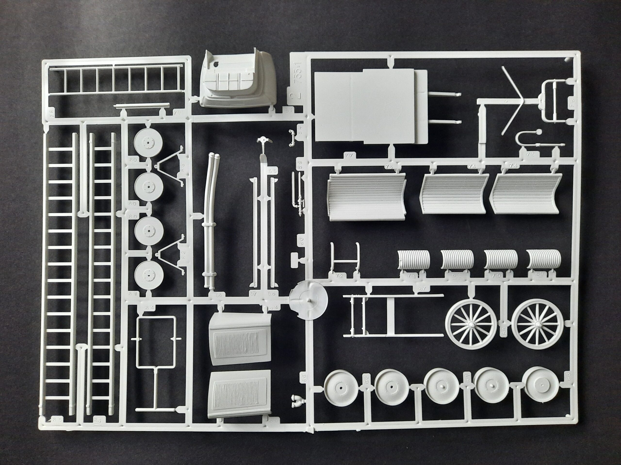 Nachdem die Räder auf die Achszapfen geschoben und befestigt worden sind, folgt schon die Montage der Feuerwehraufbaues. Dieser ist streckenweise etwas rudimentär gehalten. So könnte es unter anderem Sinn machen, die Hartplastikschläuche durch Gummischläuche zu ersetzen. Andere Bauteile wie an Leiter und Sitzbänke lassen eine Holzmaserung vermissen.  Der Modellbauer wird sich hier oder da zu helfen wissen und seine eigenen Akzente setzen.