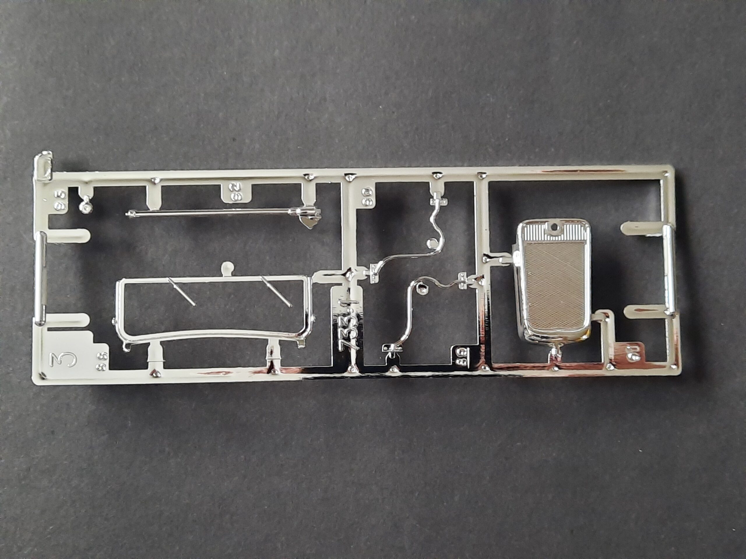 Der Bausatz besteht aus insgesamt 104 Bauteilen und misst montiert 20 cm. Der Bau beginnt mit einfachen Felgen in Scheibenbauweise und den bekannten Vinylreifen, gefolgt vom dem Bau des Motors. Der Modellbauer wird gleich mit einem recht ordentlich detaillierten Motor belohnt. Zu Lichtmaschine, Wasserpumpe, Lüfter kommen hier noch Zündverteiler, Zündspule, Öleinfüllstutzen und Kühlerschläuche dazu. Die Vorder- und Hinterachse sind in ihrer Bauweise wie beim Original einfach gehalten. Auch hier haben wir eine gute Detailierung durch separate Blattfedern, Quer- und Längslenkern. Diverse Lenkhebel werten die Lenkung optisch auf. Die Lenkung ist am Ende beweglich gehalten. Ist dieser Bereich abgearbeitet, werden noch der Motor mit der Abgasanlage und dem Kühler mit den Kühlwasserschläuchen auf dem Rahmen verpflanzt. Der dann halbwegs fertiggestellte Motorraum bietet jetzt die Möglichkeit durch zusätzliches Verkabeln, wie unter anderem die Zündanlage und den Starter, diesen Bereich noch weiter aufzuwerten. Durch späteres Abnehmen der Motorhaube hat man dort einen sehr guten Einblick. Parallel zu den Arbeiten erfolgt der Bau der Fahrerkabine.  Auch hier mangelt es nicht an guter Detailierung. Pedale, Schalthebel, Armaturenbrett – alles da und viel mehr war auch nicht. Der Frontscheibenrahmen und der Kühlergrill werden in Verchromung  geliefert. Die Chrombeschichtung ist von zufriedenstellender Qualität. Die Verglasung zum Scheibenrahmen ist ohne Schlieren und von der Stärke her akzeptabel.